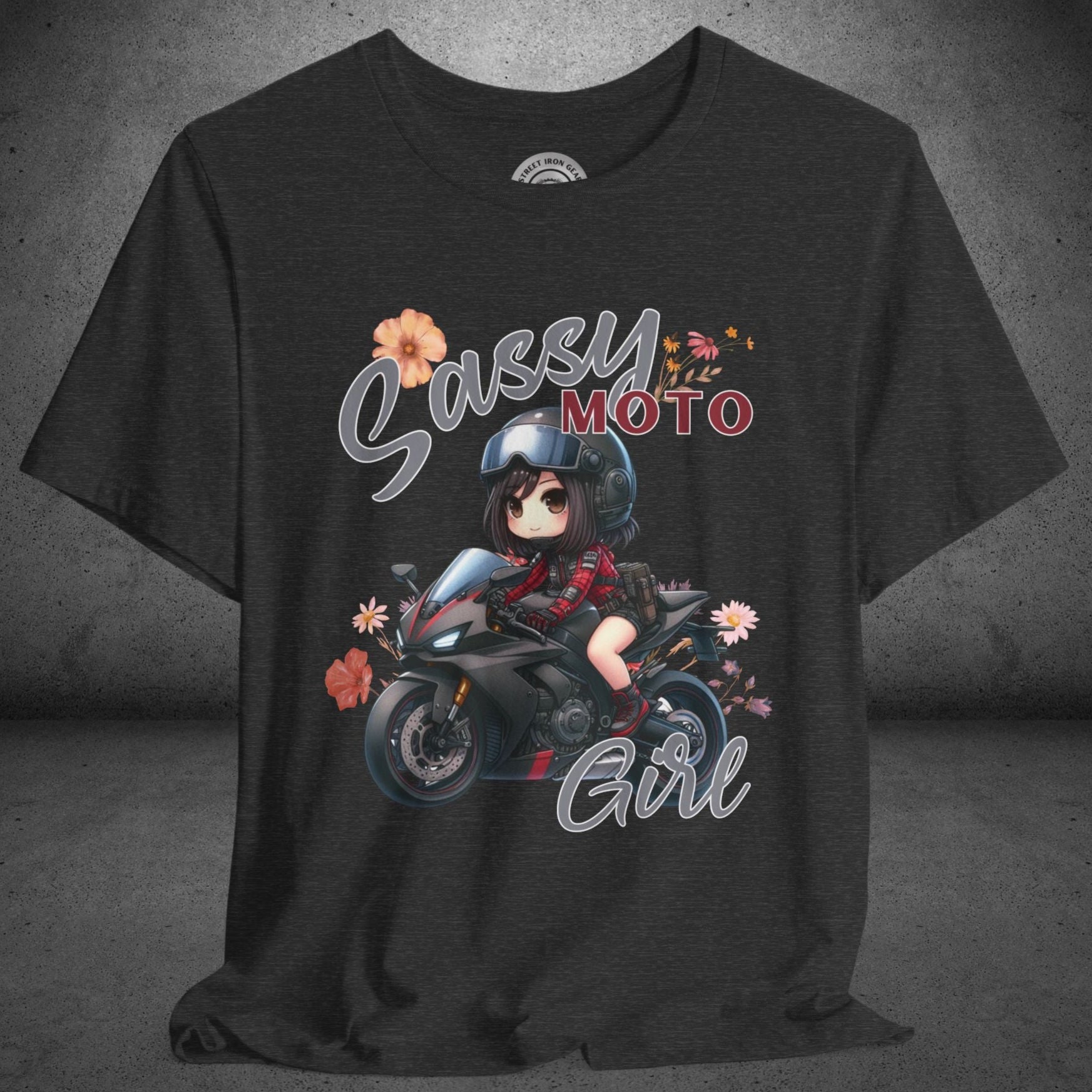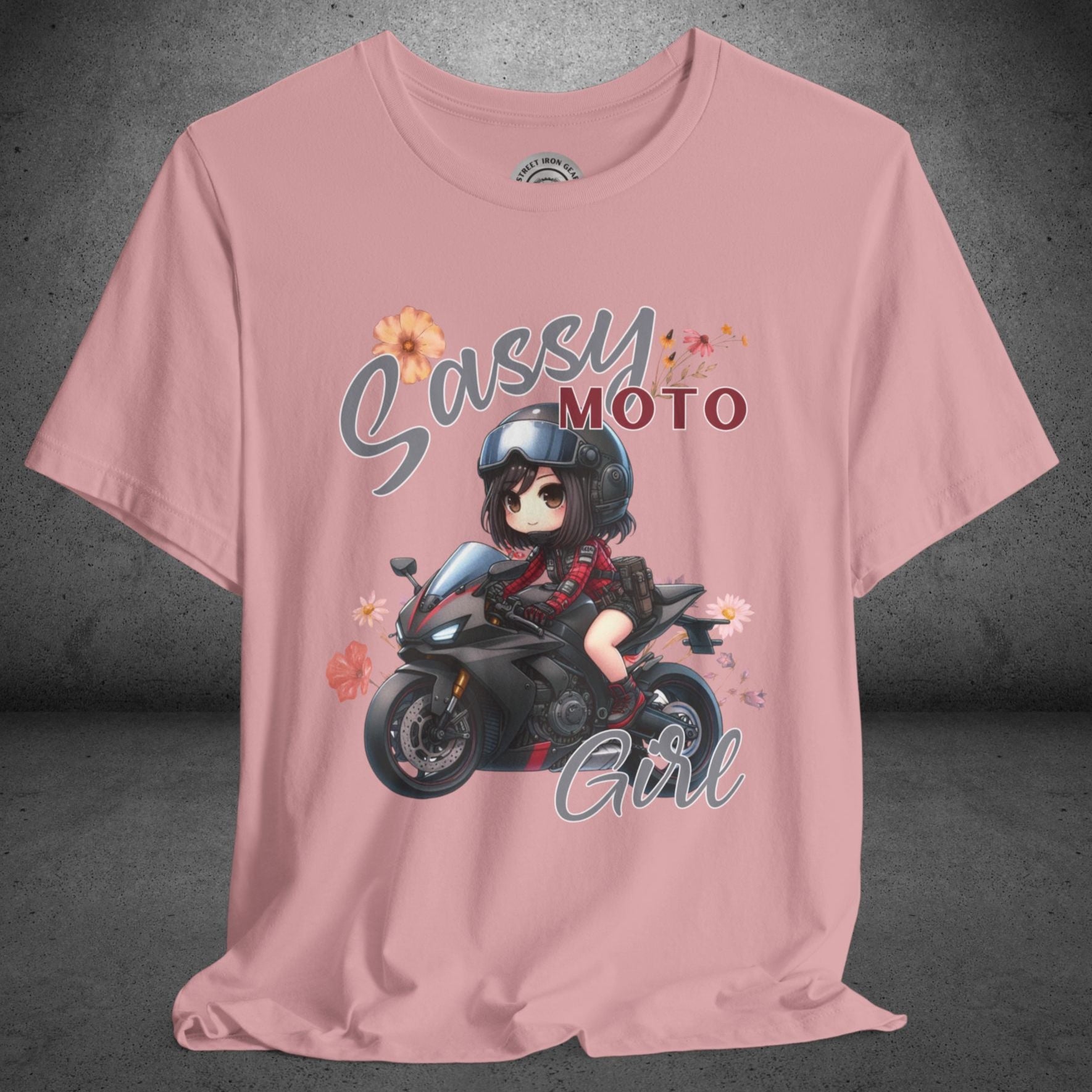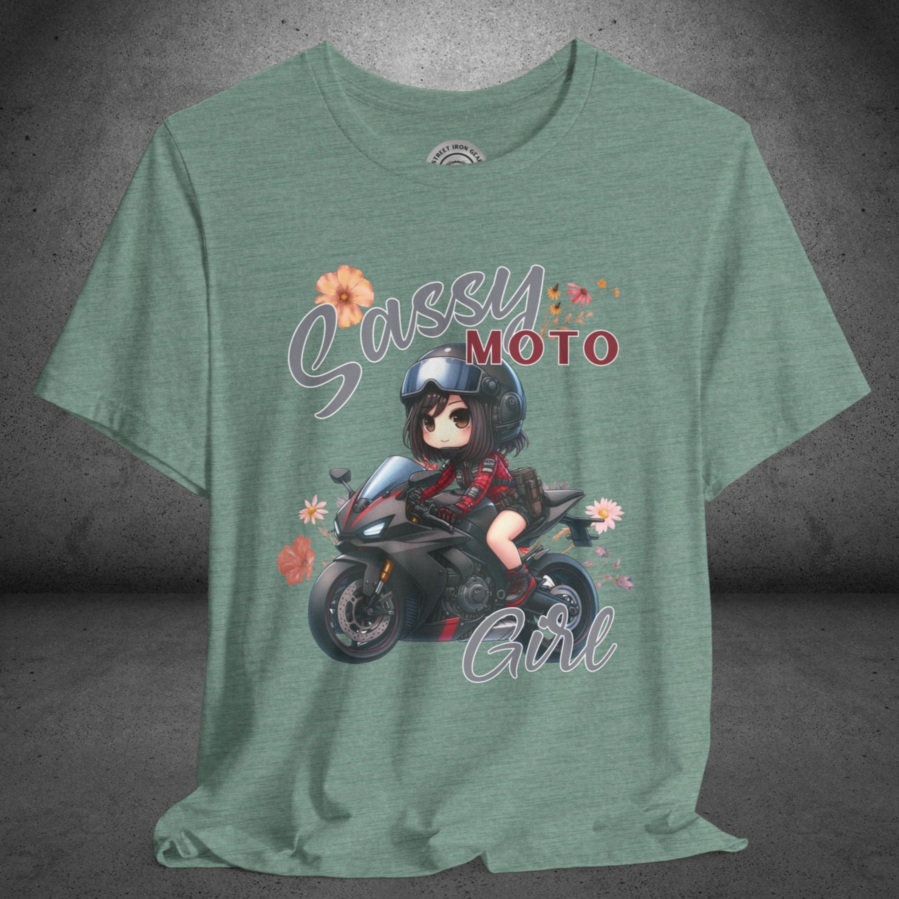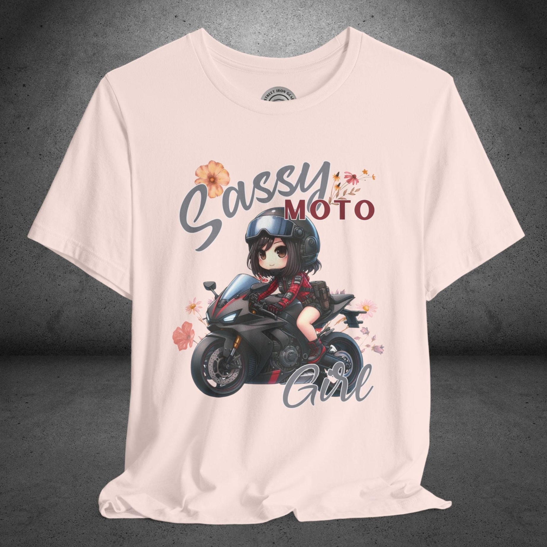 Embrace your adventurous side with our ladies' motorcycle-themed T-shirt, featuring a playful Chibi Girl on a sports bike surrounded by boho flower elements. The bold "Sassy Moto Girl" text adds a fun, empowering touch, making it the perfect tee for women who love to ride with style. Available in a variety of colors, this soft and comfortable T-shirt is ideal for casual outings, motorcycle events, or as a unique gift for the biker girl in your life.