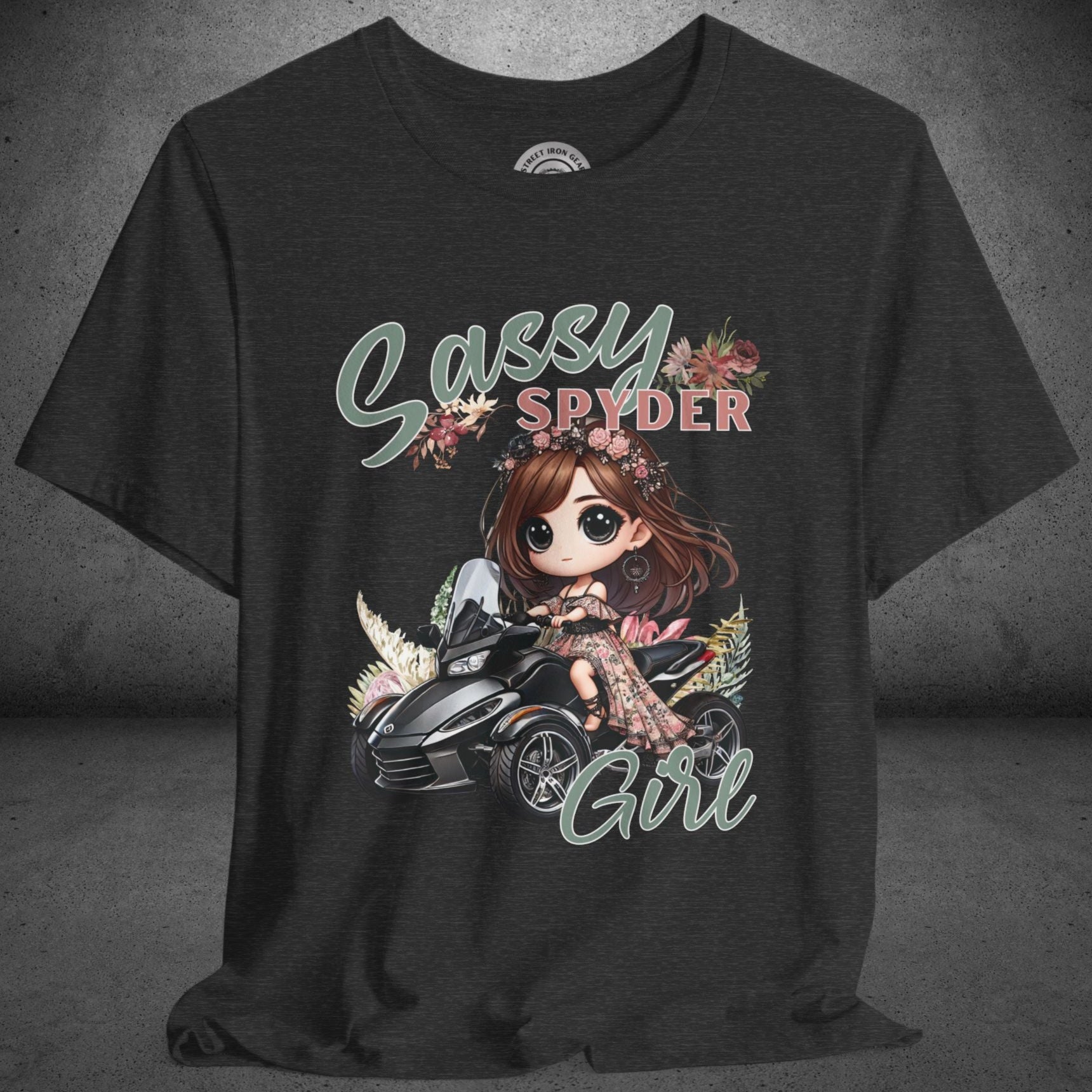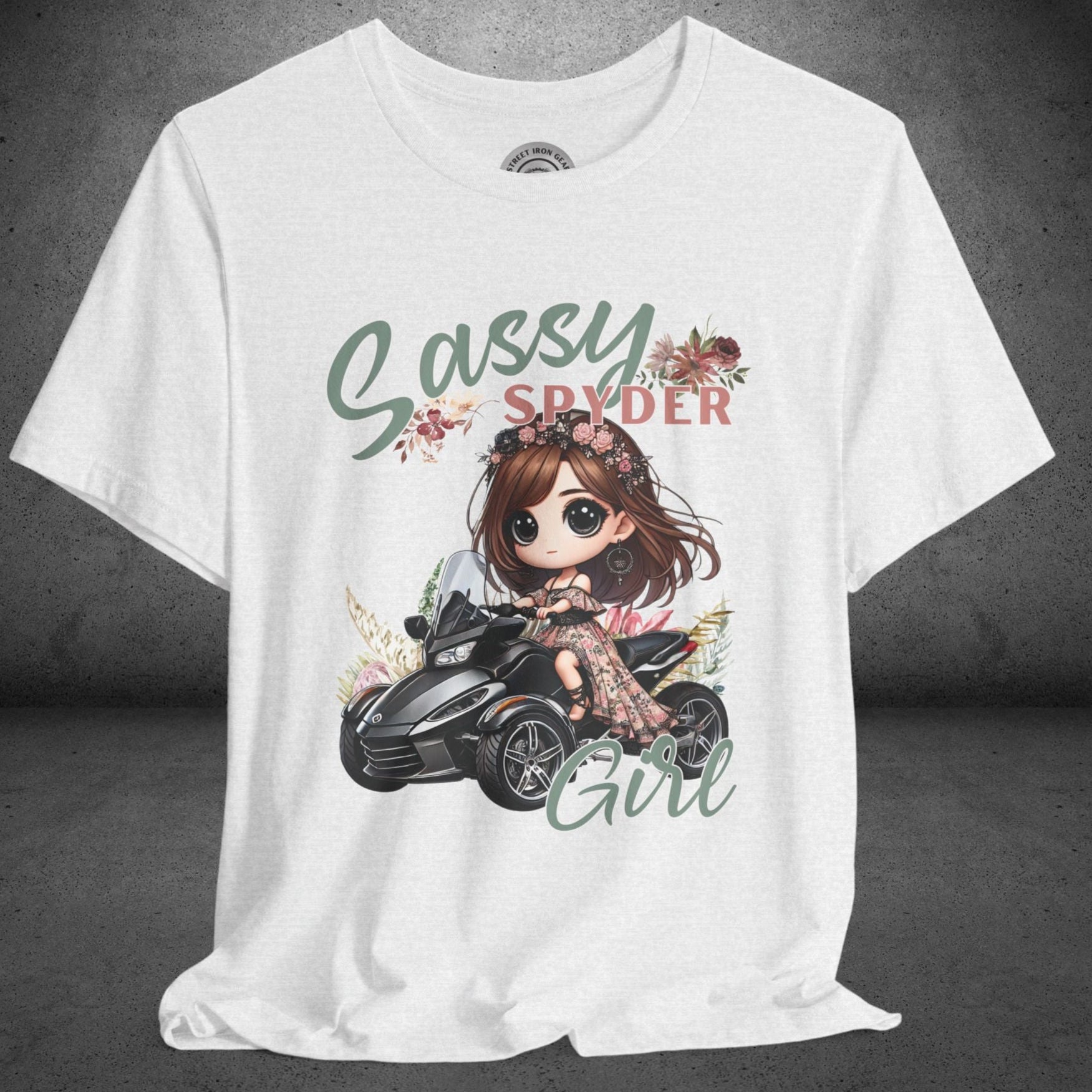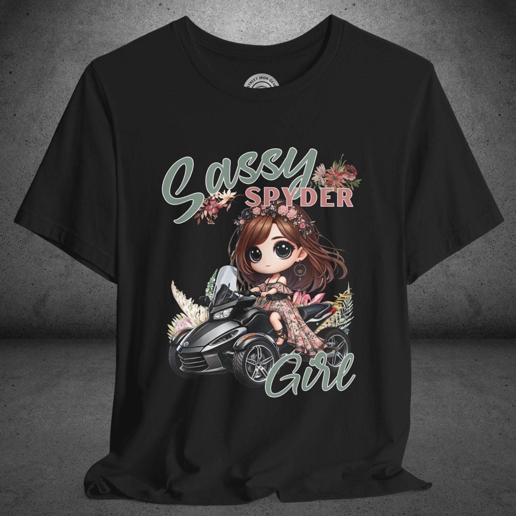 Celebrate your love for the open road with our "Sassy Spyder Girl" ladies' T-shirt, featuring a charming Chibi Girl riding a Can-Am Spyder surrounded by boho flower elements. This stylish and fun design is perfect for expressing your adventurous spirit while showcasing your passion for Spyder riding. Available in a variety of colors, this high-quality T-shirt makes a perfect gift for Can-Am Spyder enthusiasts or a must-have addition to your riding wardrobe.