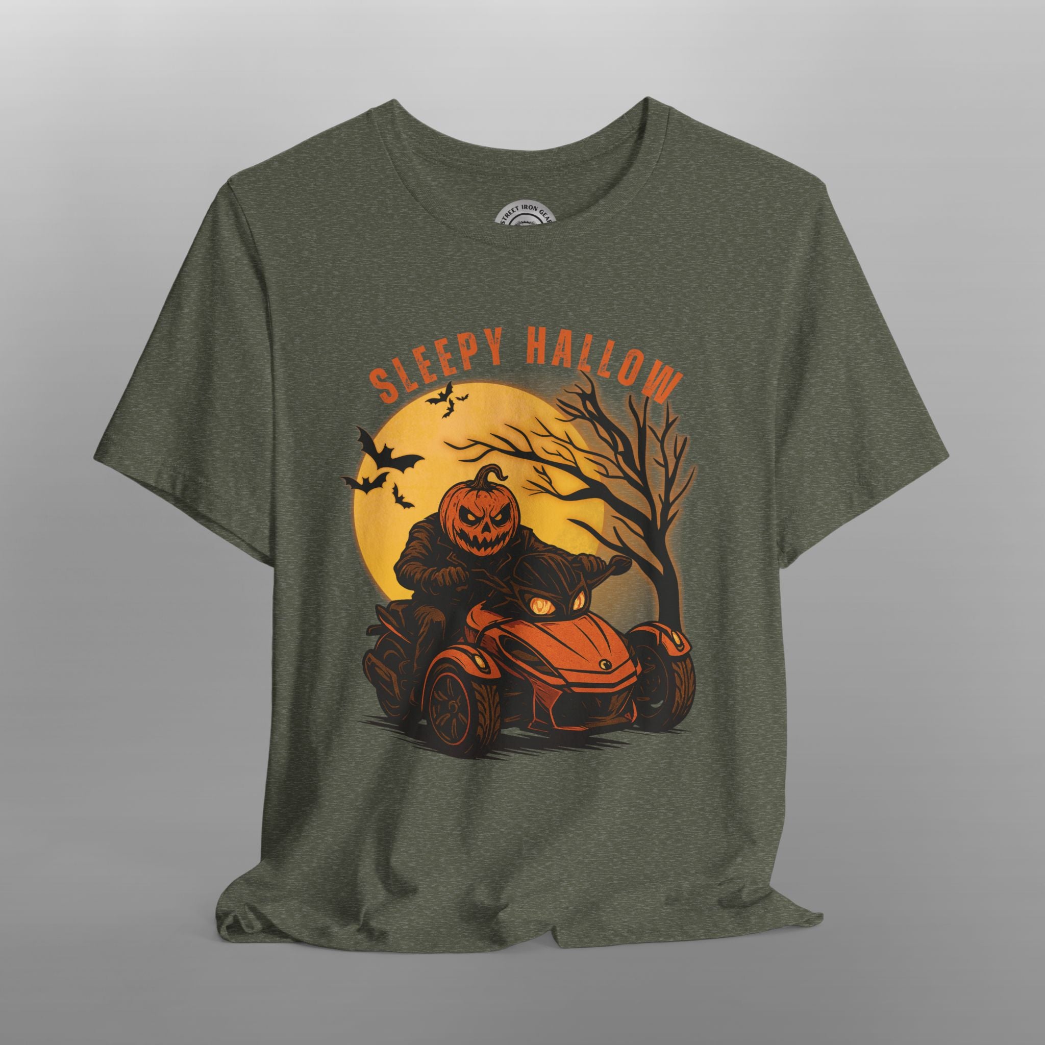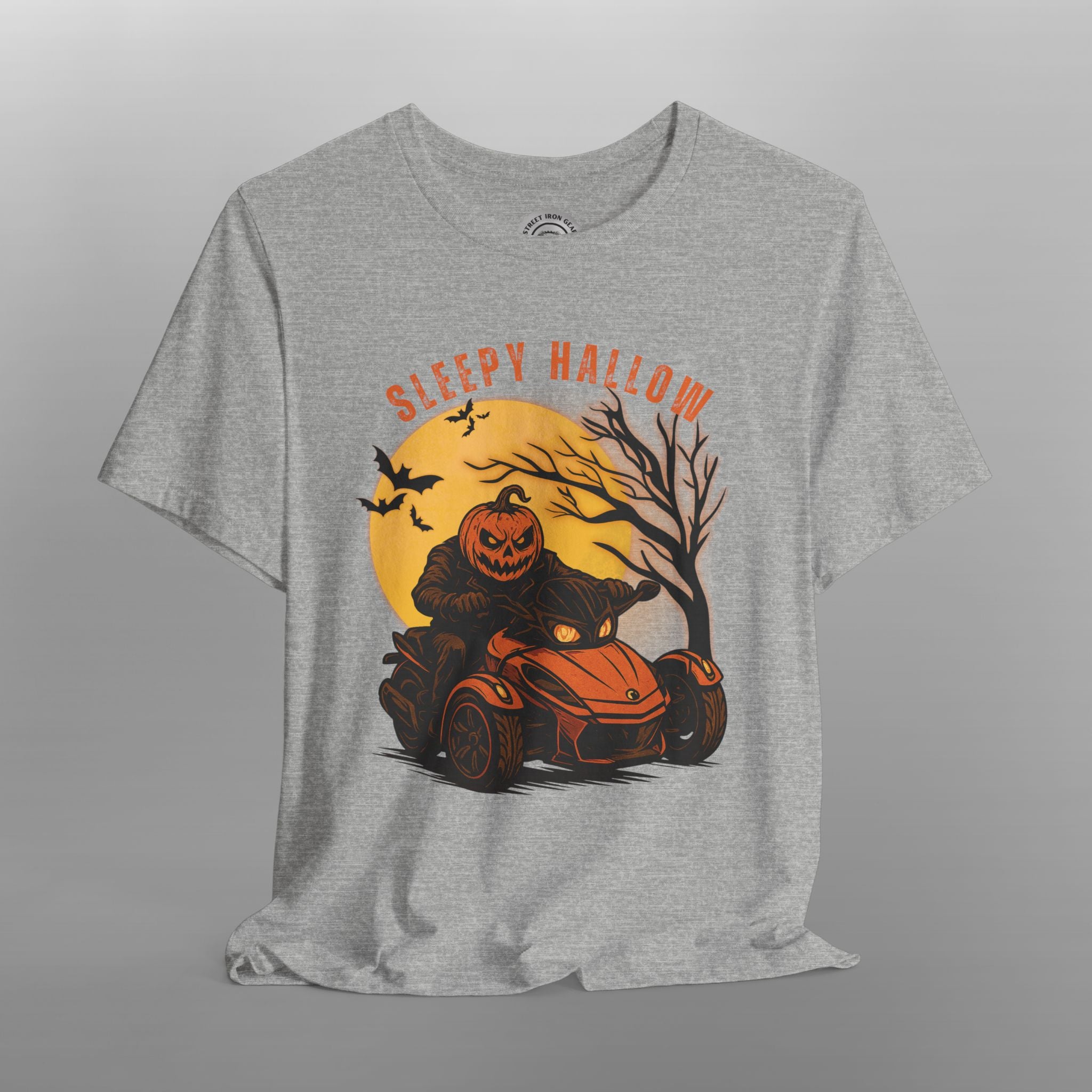 Get into the spooky spirit with this Can-Am Spyder Halloween T-Shirt for men, featuring a hauntingly cool design of a pumpkin-headed ghoul riding a Can-Am Spyder through a chilling Halloween night. Set against a large full moon with flying bats and a gnarled tree silhouette, this vibrant and bold graphic uses a vivid fall color palette of orange, black, and green to make the design pop. The eerie phrase "Sleepy Hallow" adds the perfect haunted touch, making it an ideal choice for Halloween parties, October rides, or just showing off your seasonal biker style. Made with soft, high-quality material, this tee is built for comfort, durability, and spooky flair.