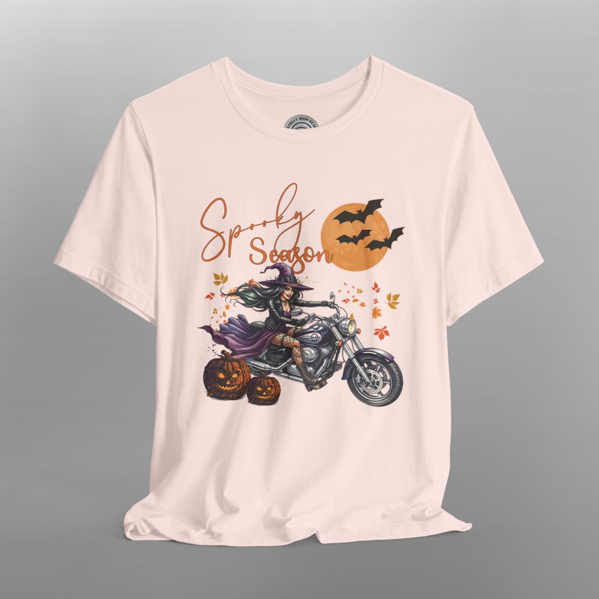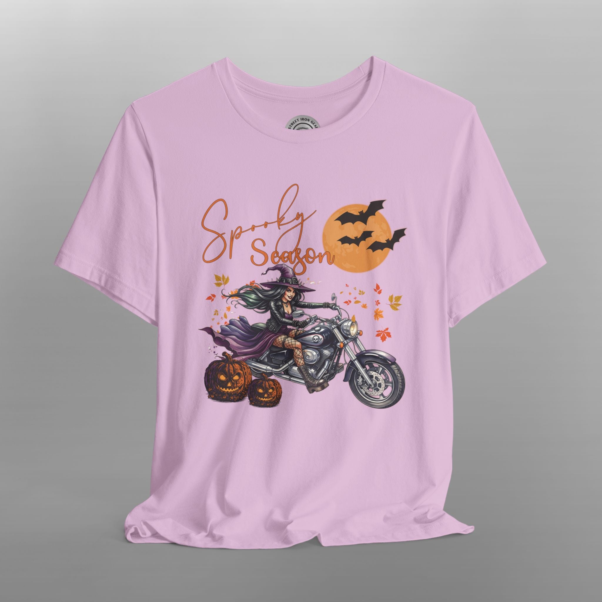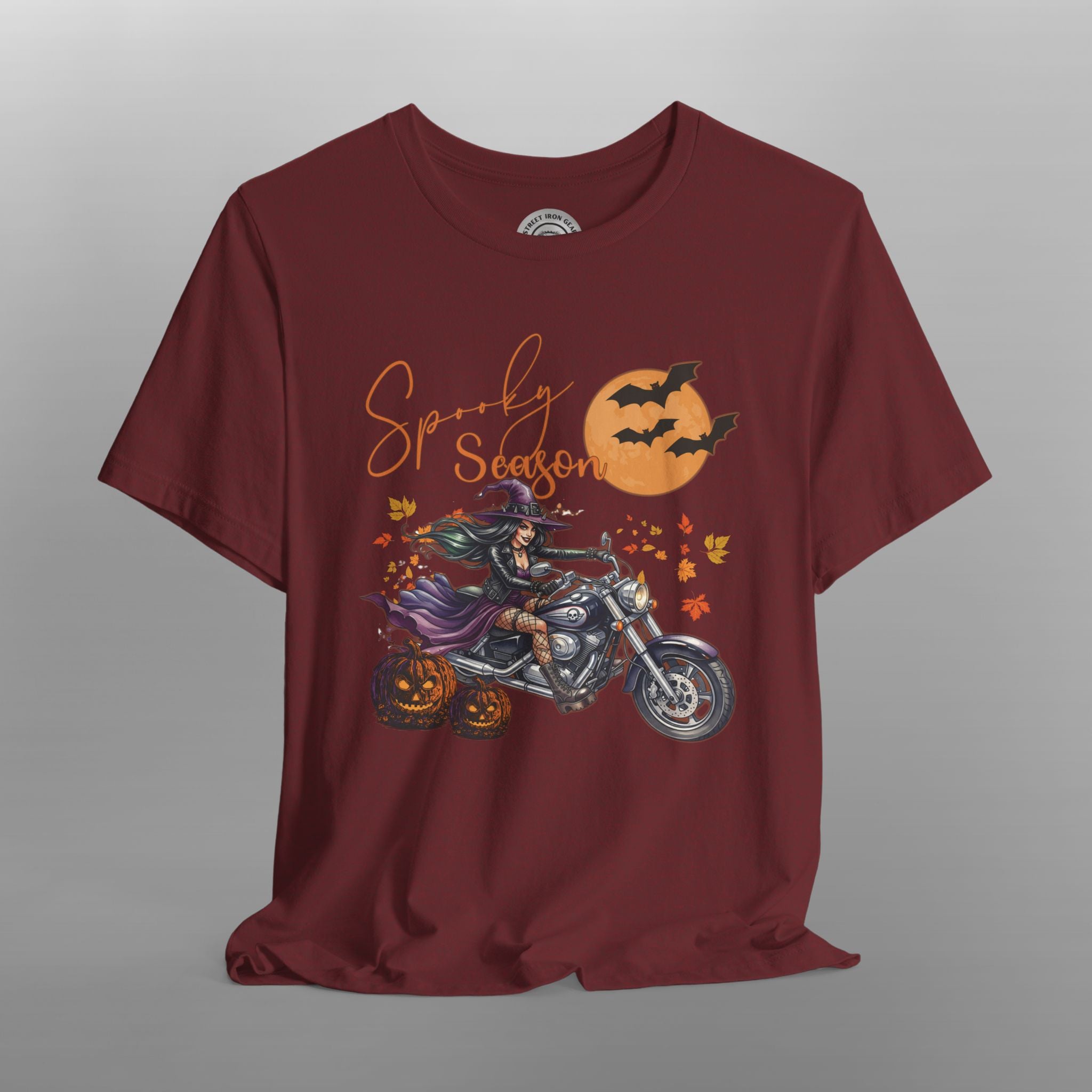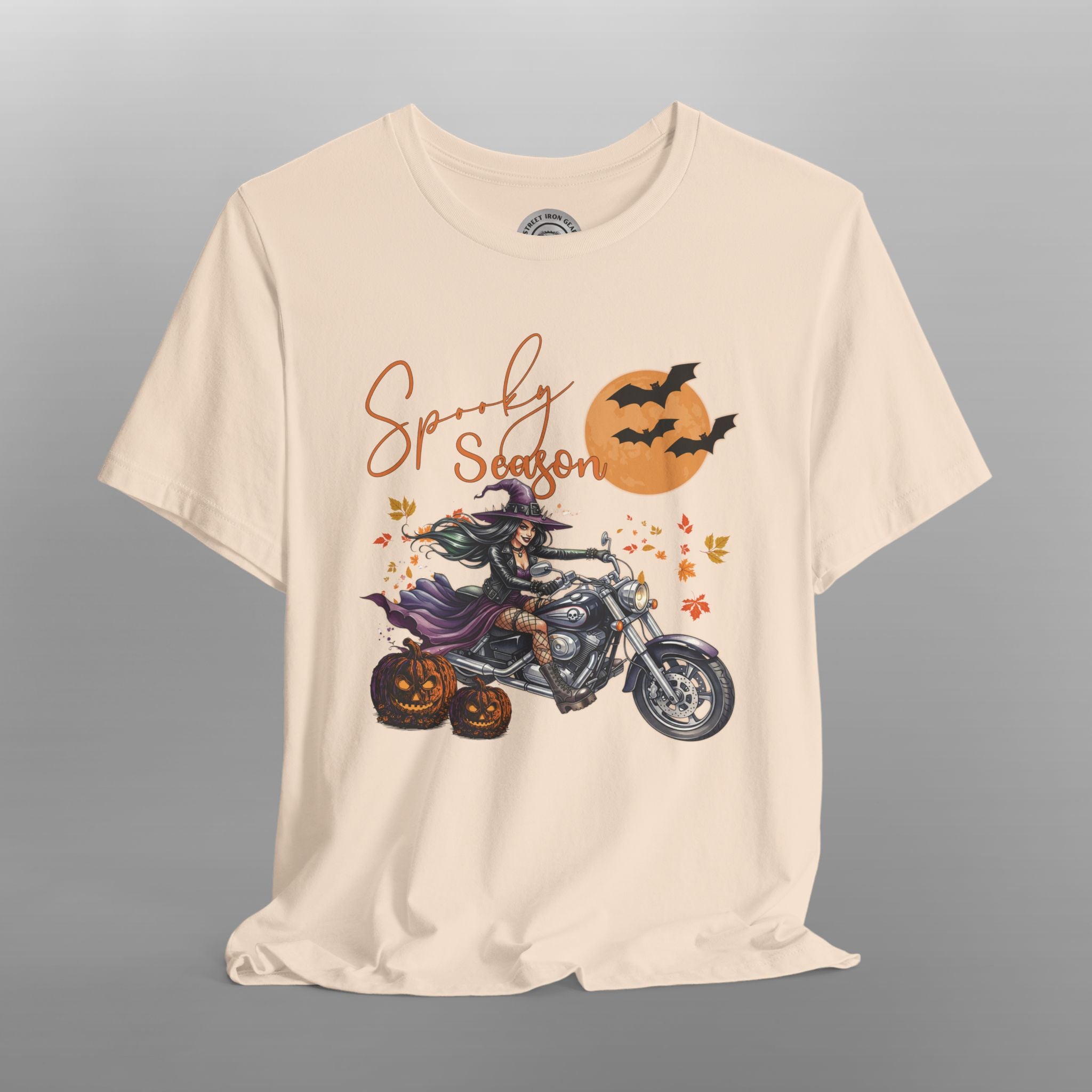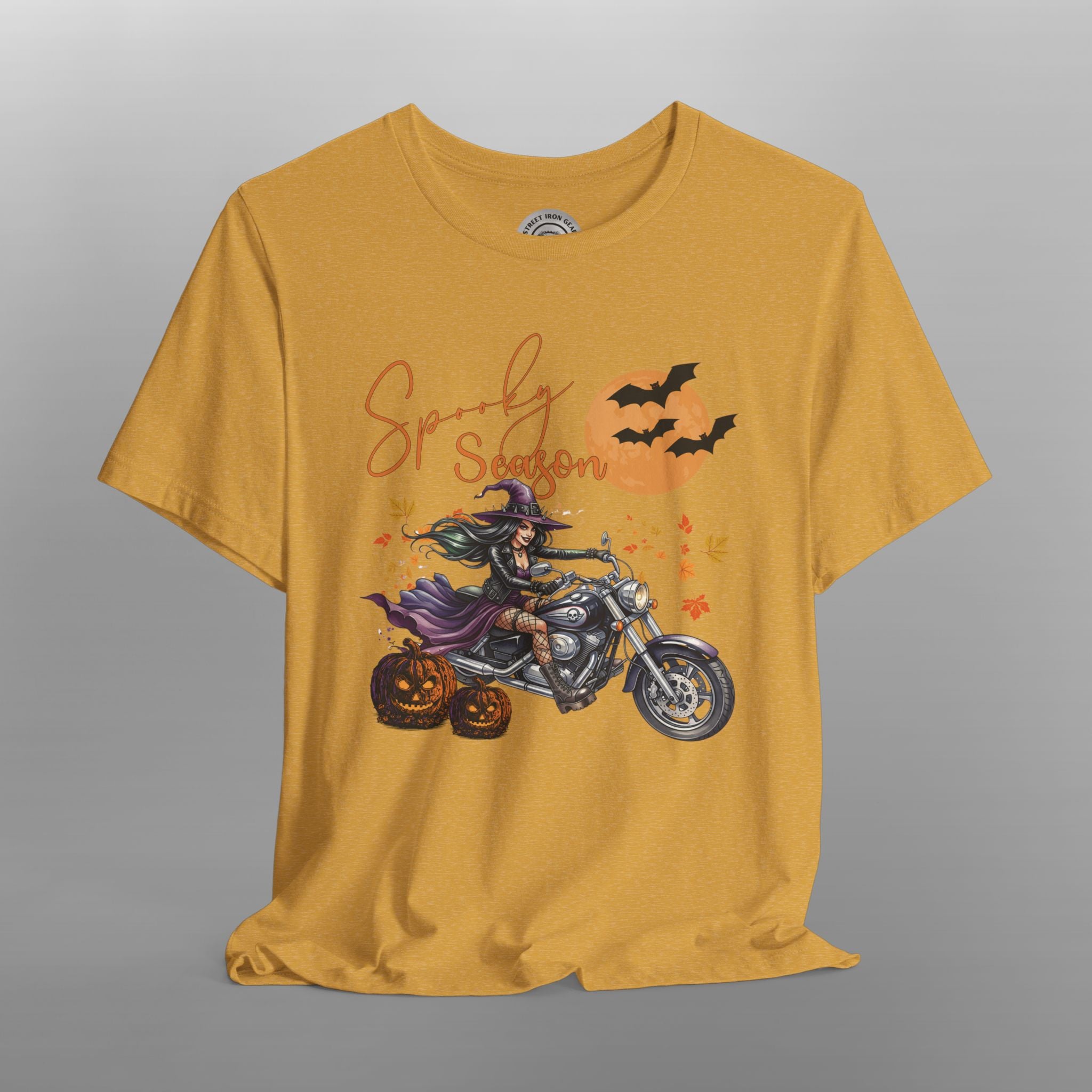 Embrace the open road and the magic of autumn with our Spooky Season short-sleeve tee. This shirt is for every lady who loves to ride and wants to celebrate the Halloween season. It features a female rider on a classic cruiser, surrounded by jack-o-lanterns, bats, and a full moon. Crafted for comfort, it's perfect for a crisp fall ride or a spooky party. This biker chick shirt is a great gift for any lady rider or motorcycle enthusiast.