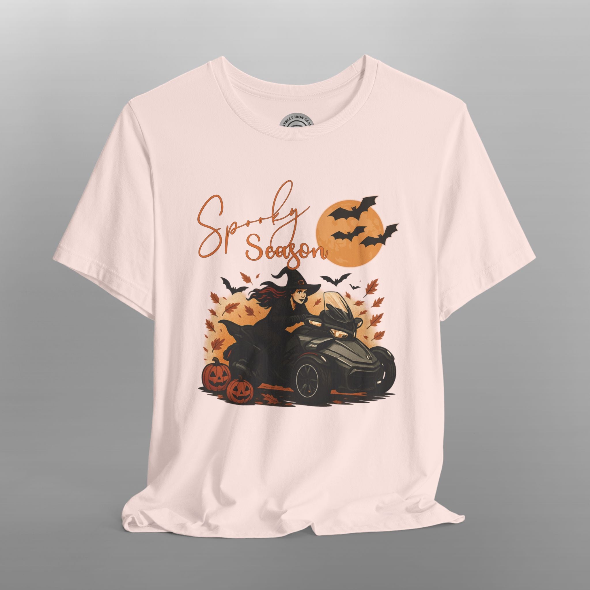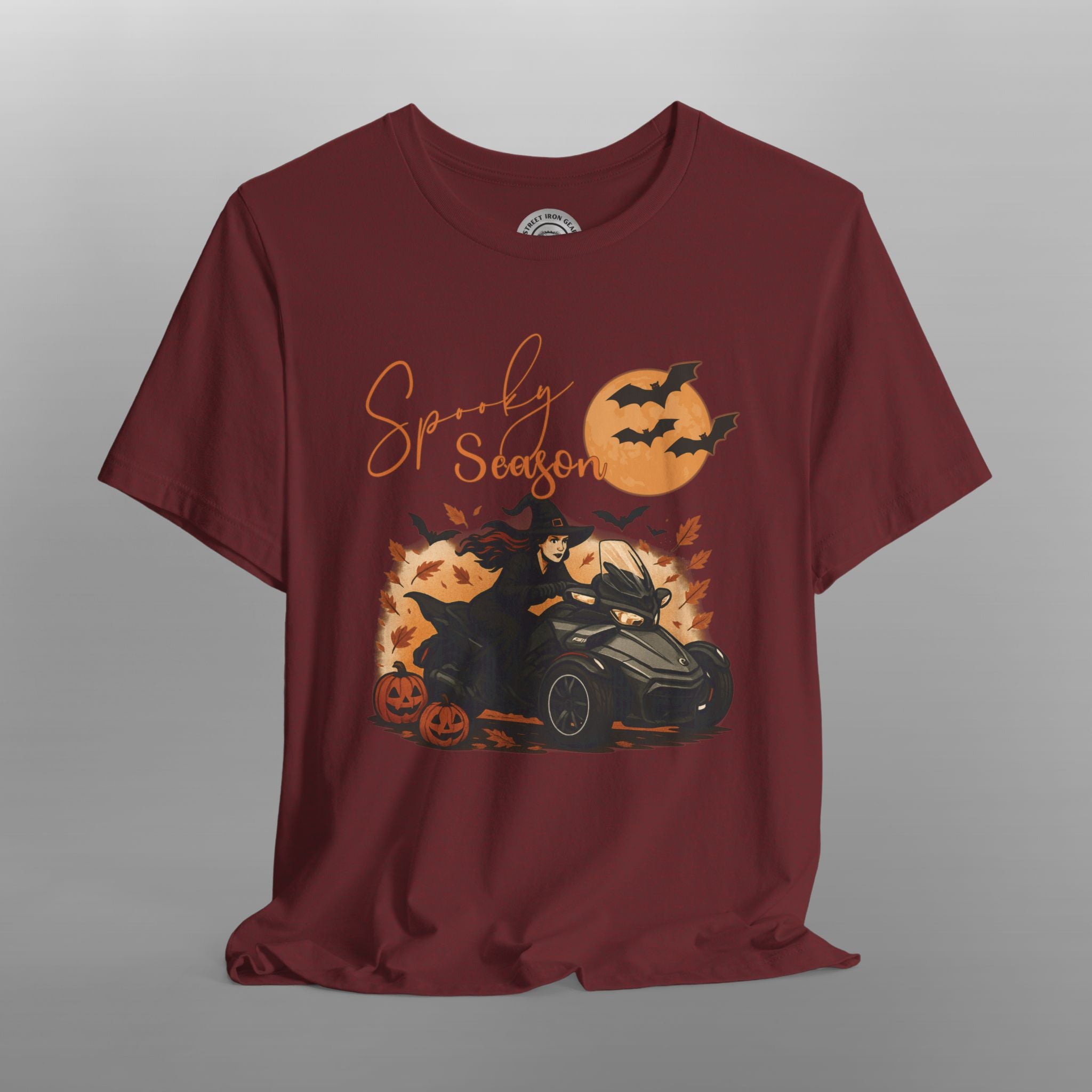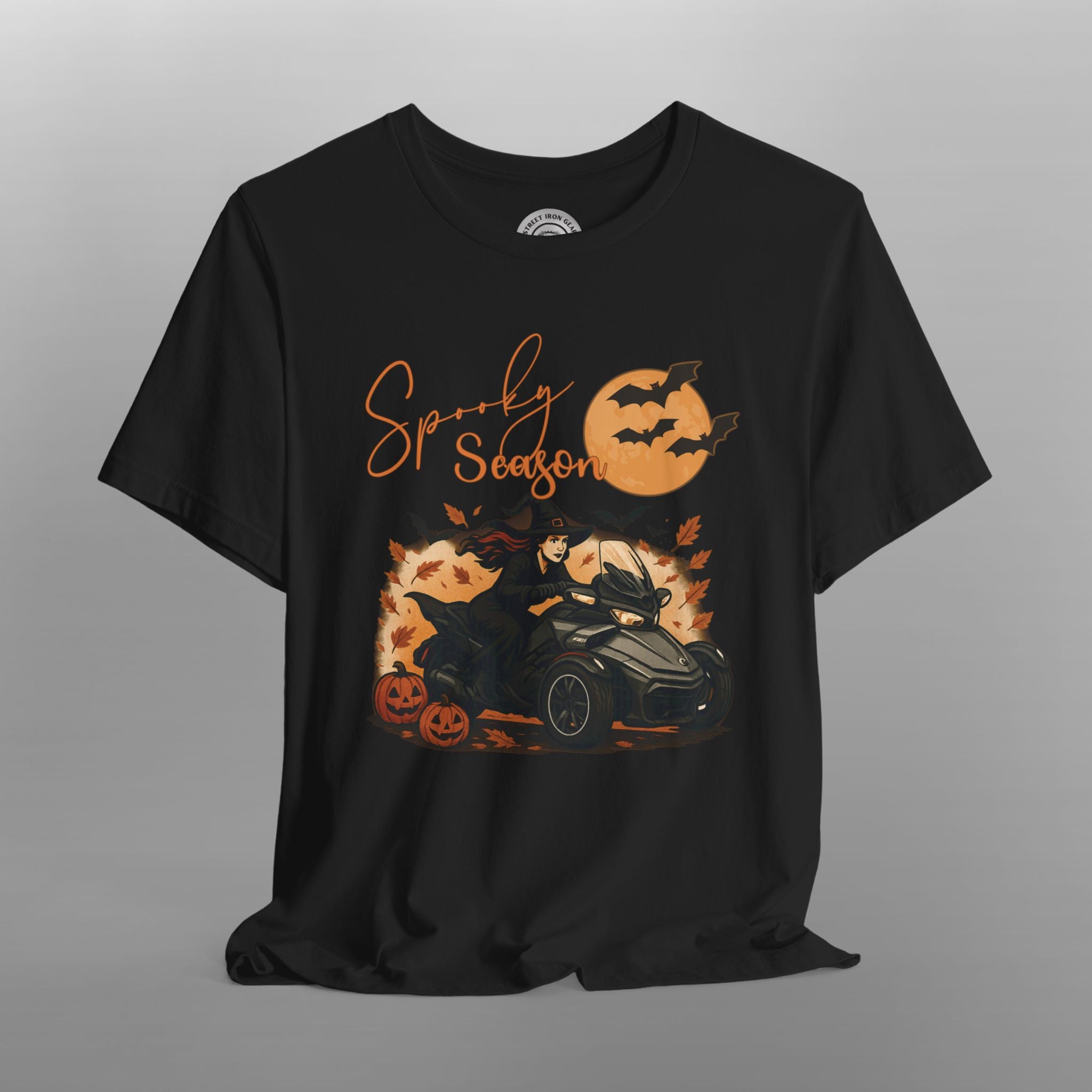 Celebrate spooky season in style with this Can-Am Spyder themed Halloween T-Shirt, featuring a fun fall design that’s perfect for riders who love the thrill of the season. This unique graphic tee showcases a playful witch riding a Can-Am Spyder, surrounded by Halloween icons like a glowing full moon, swirling autumn leaves, carved pumpkins, and flying bats—all brought together in a muted, fall-inspired color palette. Whether you're riding through crisp October air or handing out candy at home, this soft and comfortable shirt is a must-have for Can-Am fans who want to show off their Halloween spirit.