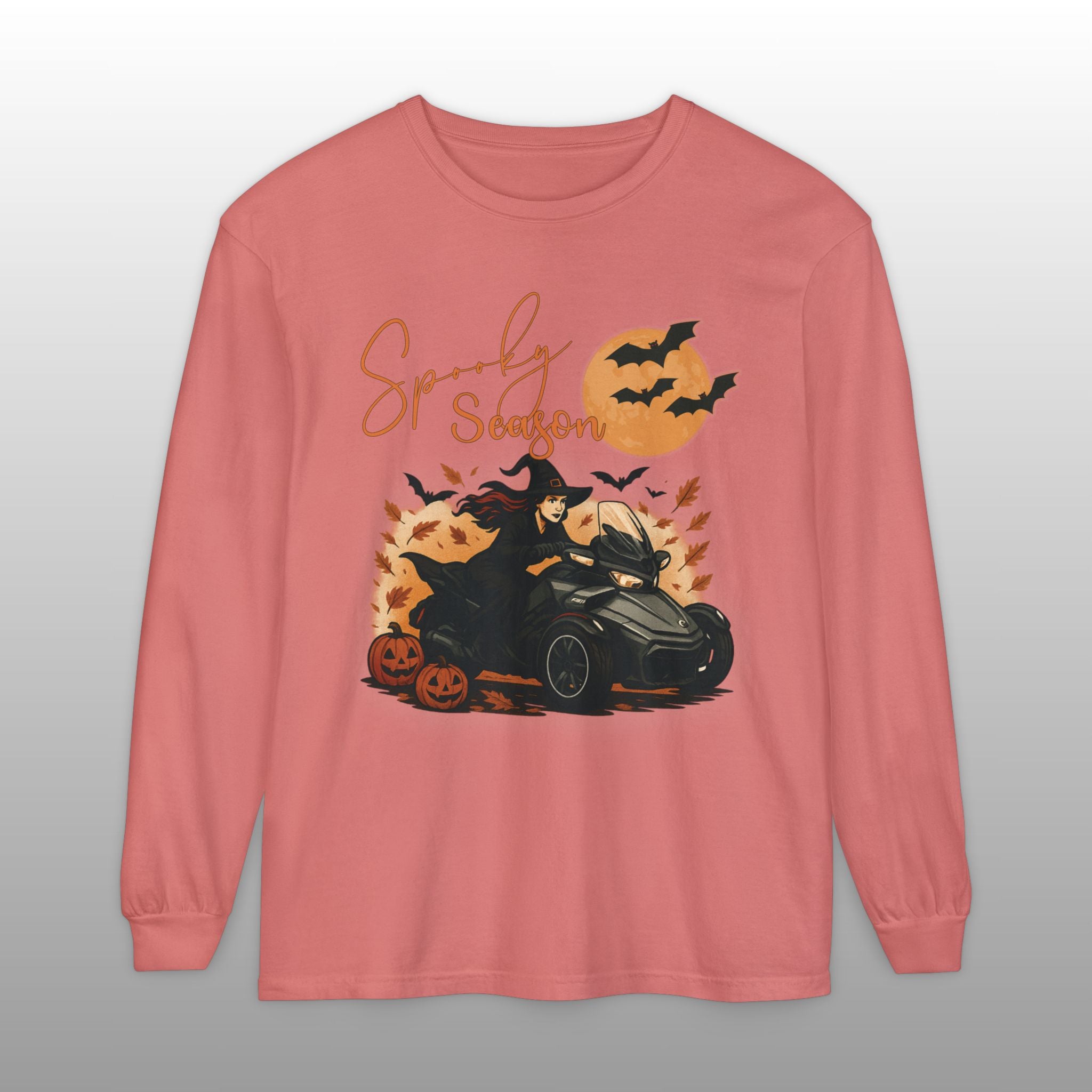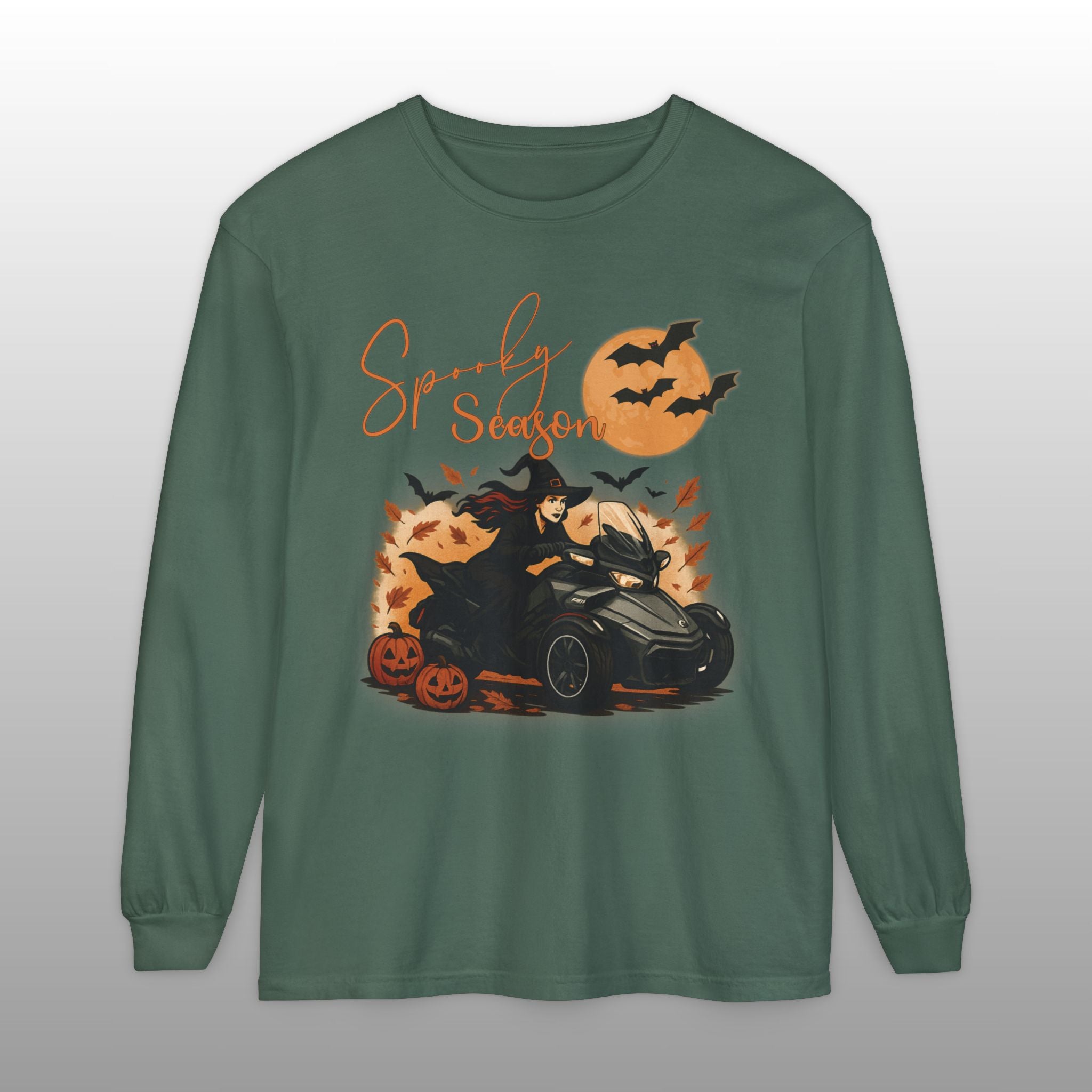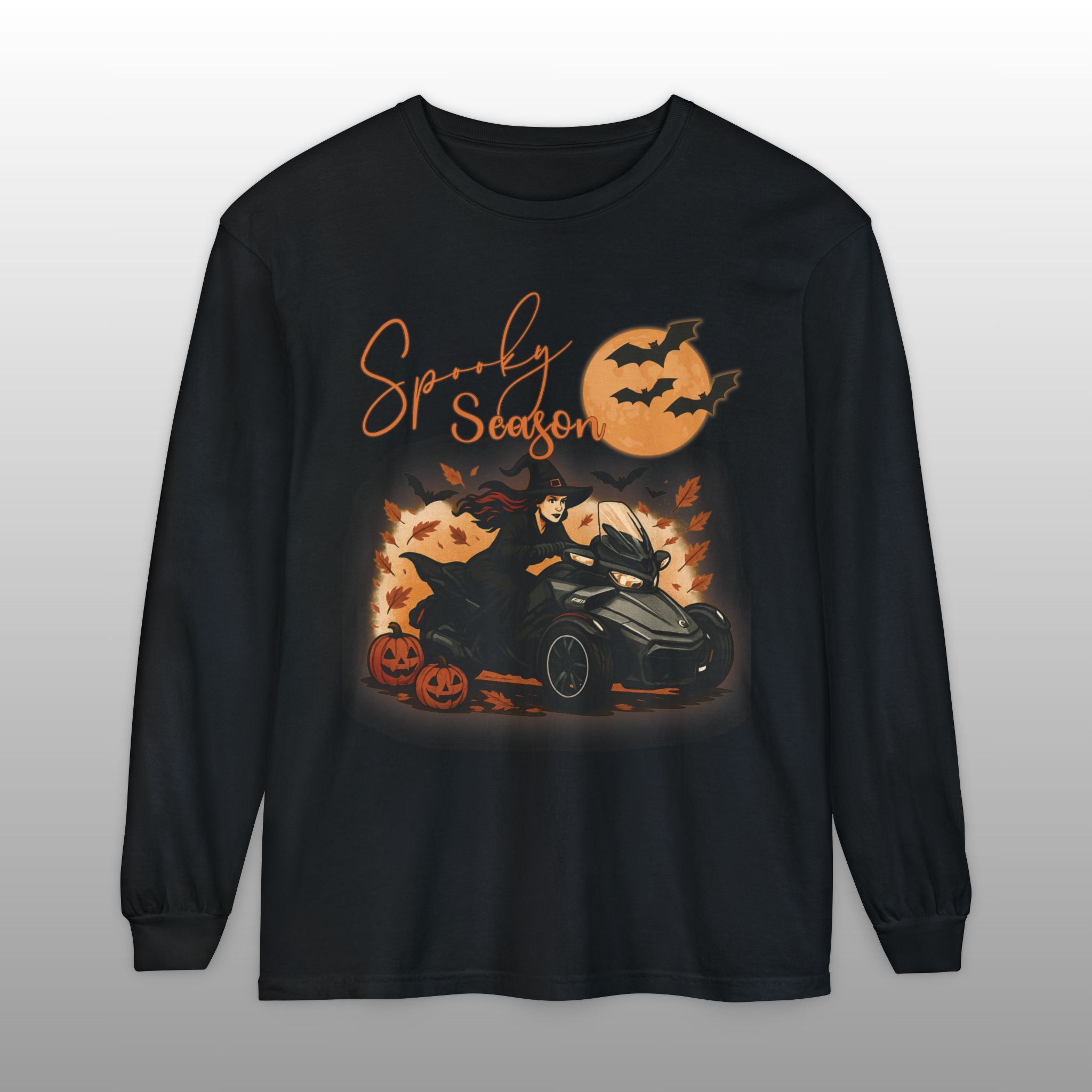 Celebrate spooky season in style with this Can-Am Spyder themed long sleeve Halloween T-Shirt, featuring a fun fall design that’s perfect for riders who love the thrill of the season. This unique graphic tee showcases a playful witch riding a Can-Am Spyder, surrounded by Halloween icons like a glowing full moon, swirling autumn leaves, carved pumpkins, and flying bats—all brought together in a muted, fall-inspired color palette. Whether you're riding through crisp October air or handing out candy at home, this soft and comfortable shirt is a must-have for Can-Am fans who want to show off their Halloween spirit.