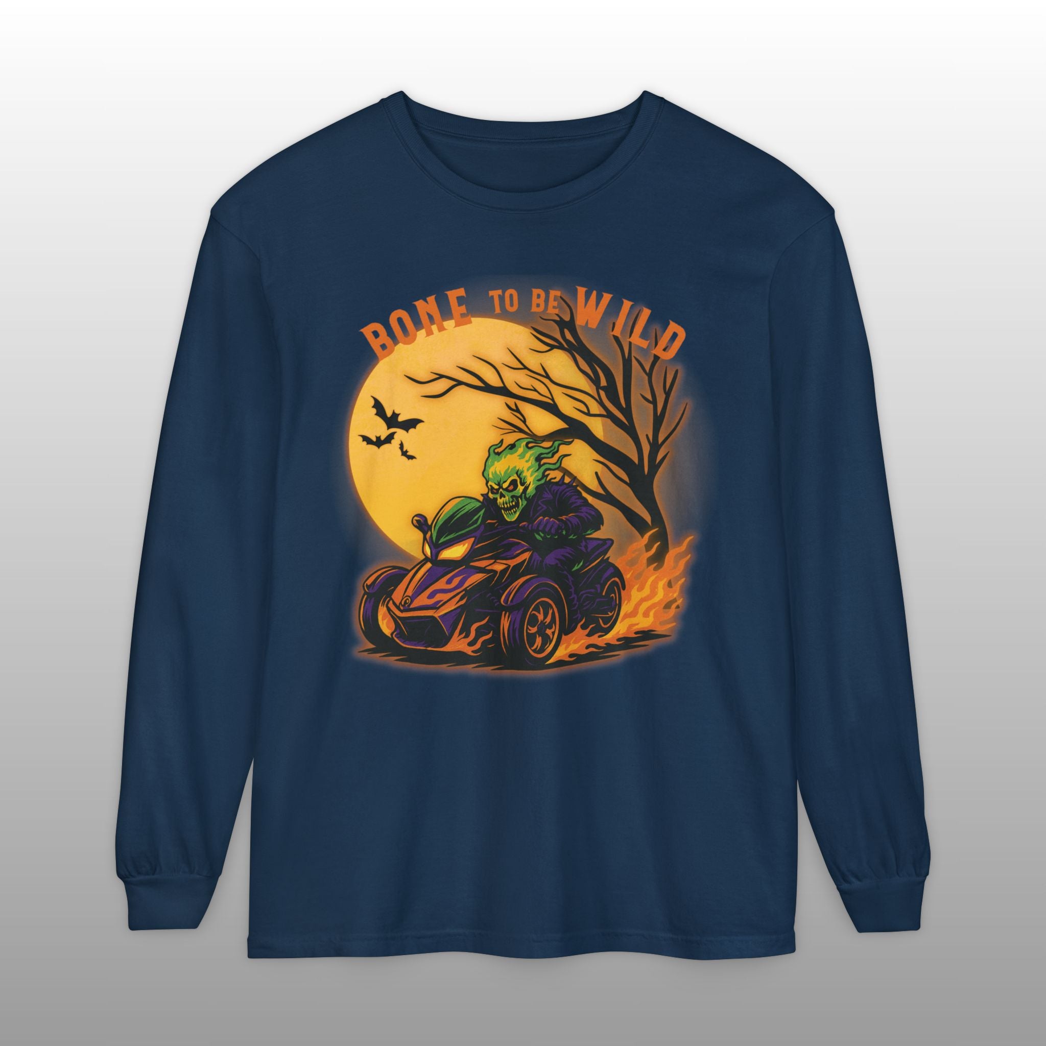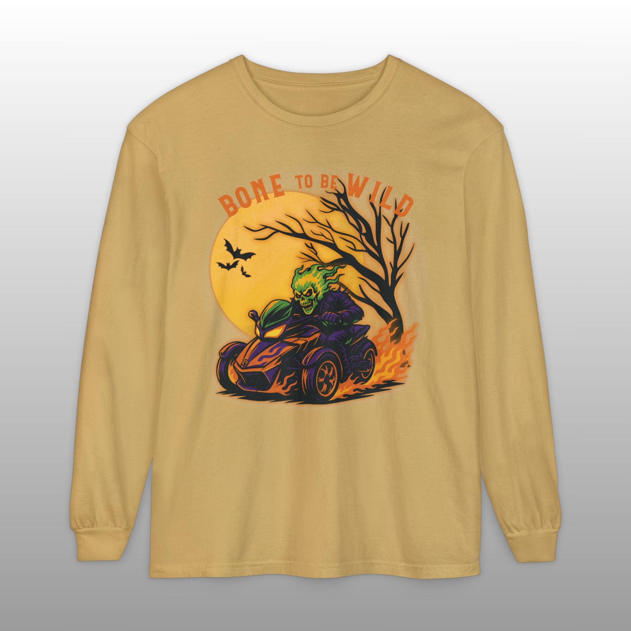 Get spooky and ride in style with this bold Can-Am Spyder Halloween long sleeve T-Shirt for men featuring a flaming skeleton tearing through the night on a Can-Am Spyder. Surrounded by classic Halloween elements like a glowing full moon, eerie twisted tree, and flying bats, this vibrant design pops with rich oranges, purples, greens, and black for that perfect October vibe. The phrase "Bone to be Wild" adds a playful twist for any Spyder rider who lives for the thrill—no matter the season.