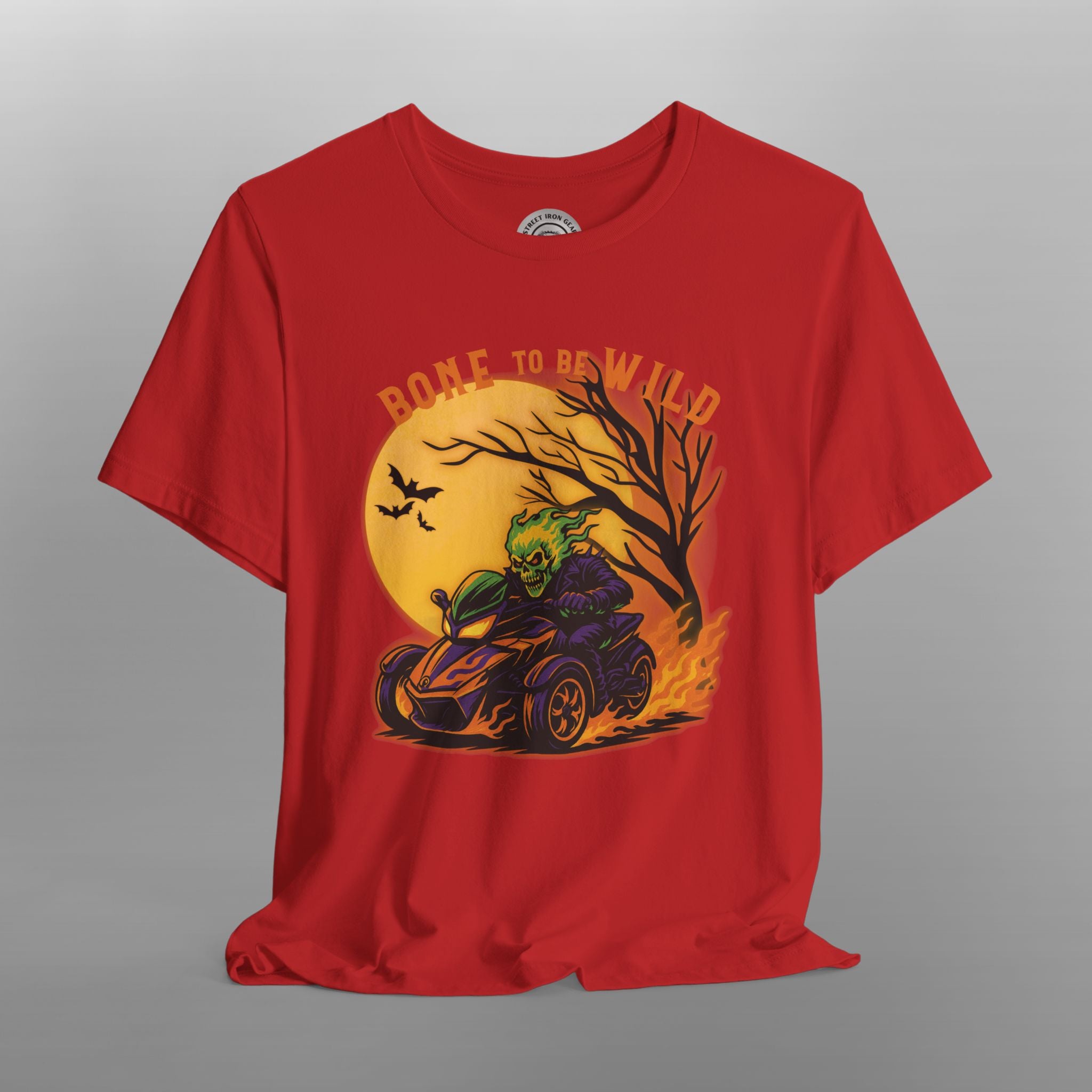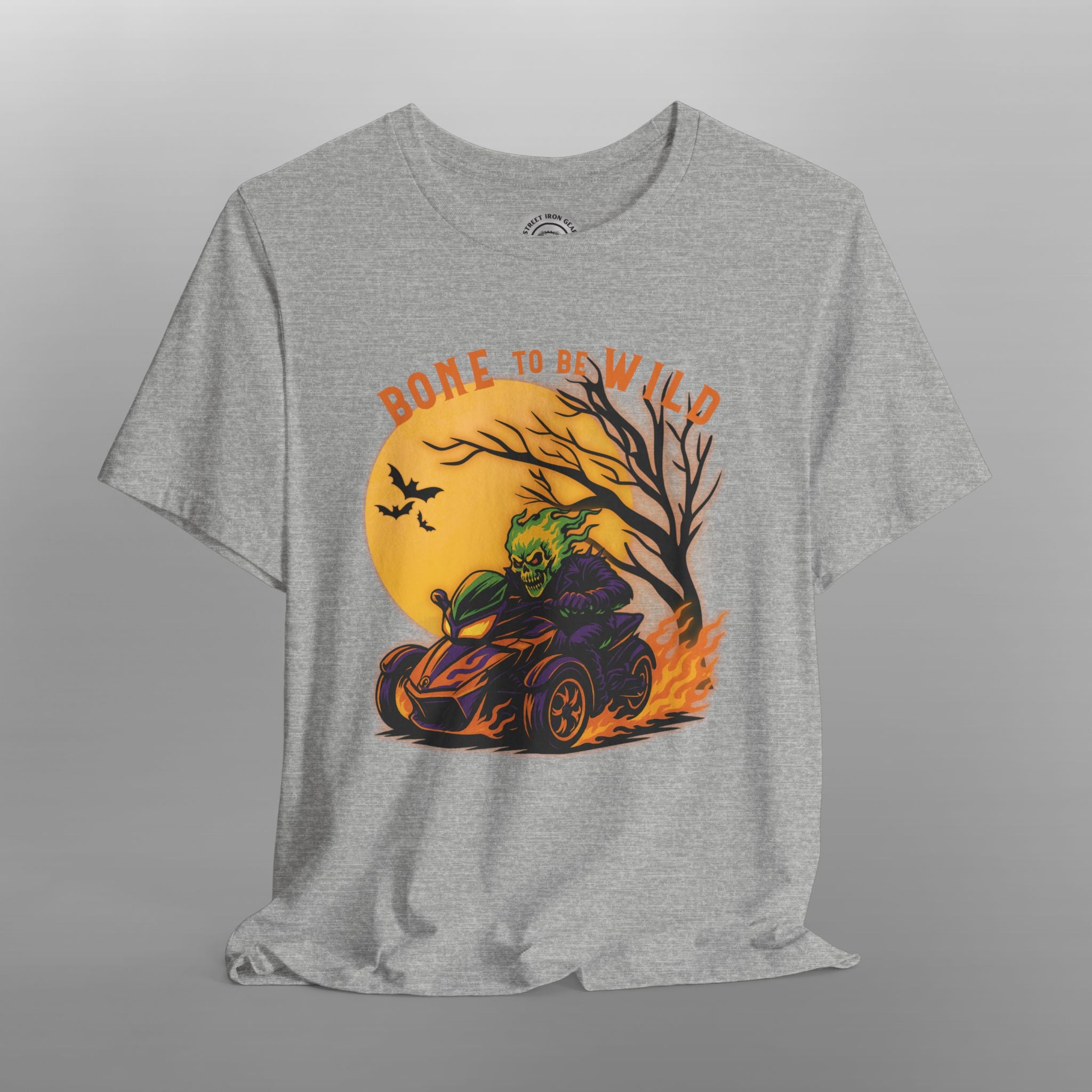 Get spooky and ride in style with this bold Can-Am Spyder Halloween T-Shirt for men featuring a flaming skeleton tearing through the night on a Can-Am Spyder. Surrounded by classic Halloween elements like a glowing full moon, eerie twisted tree, and flying bats, this vibrant design pops with rich oranges, purples, greens, and black for that perfect October vibe. The phrase "Bone to be Wild" adds a playful twist for any Spyder rider who lives for the thrill—no matter the season.