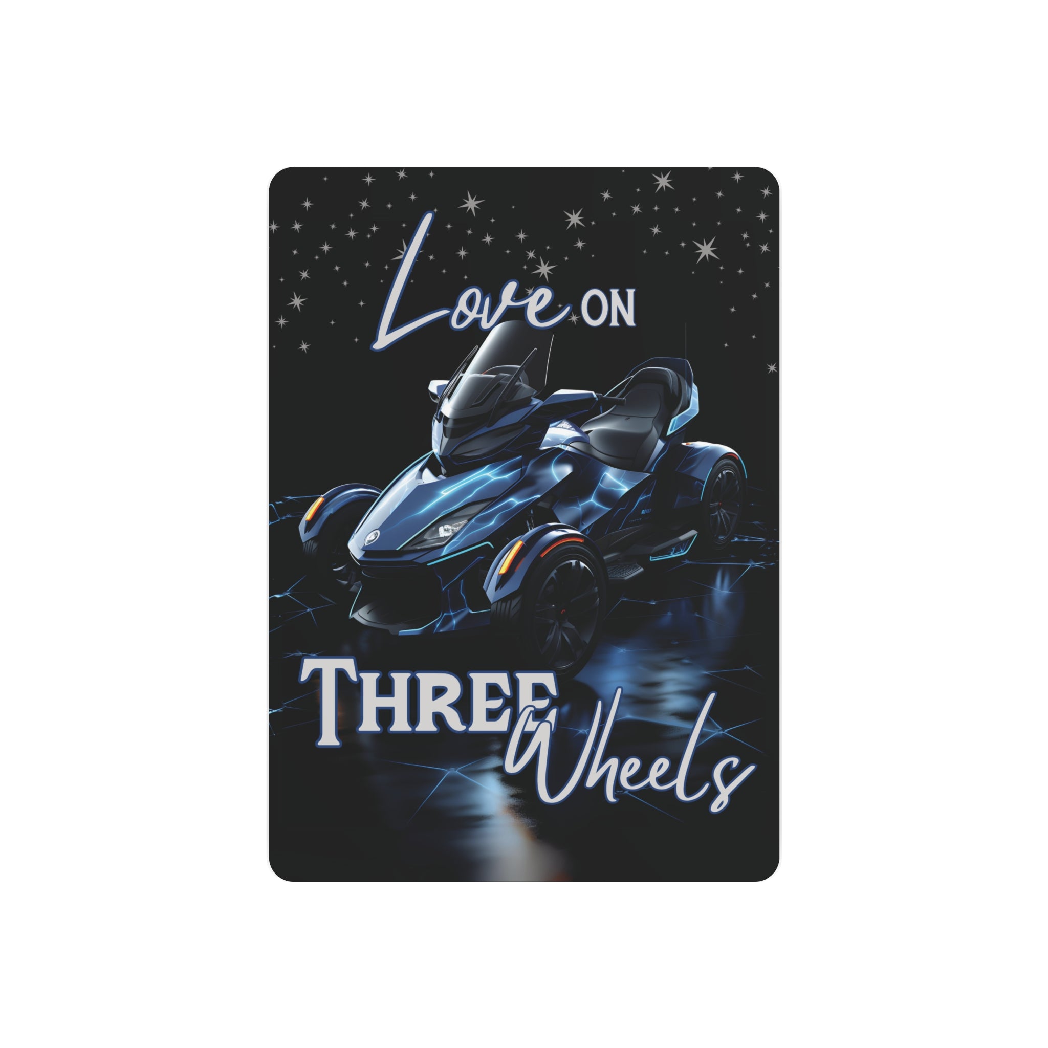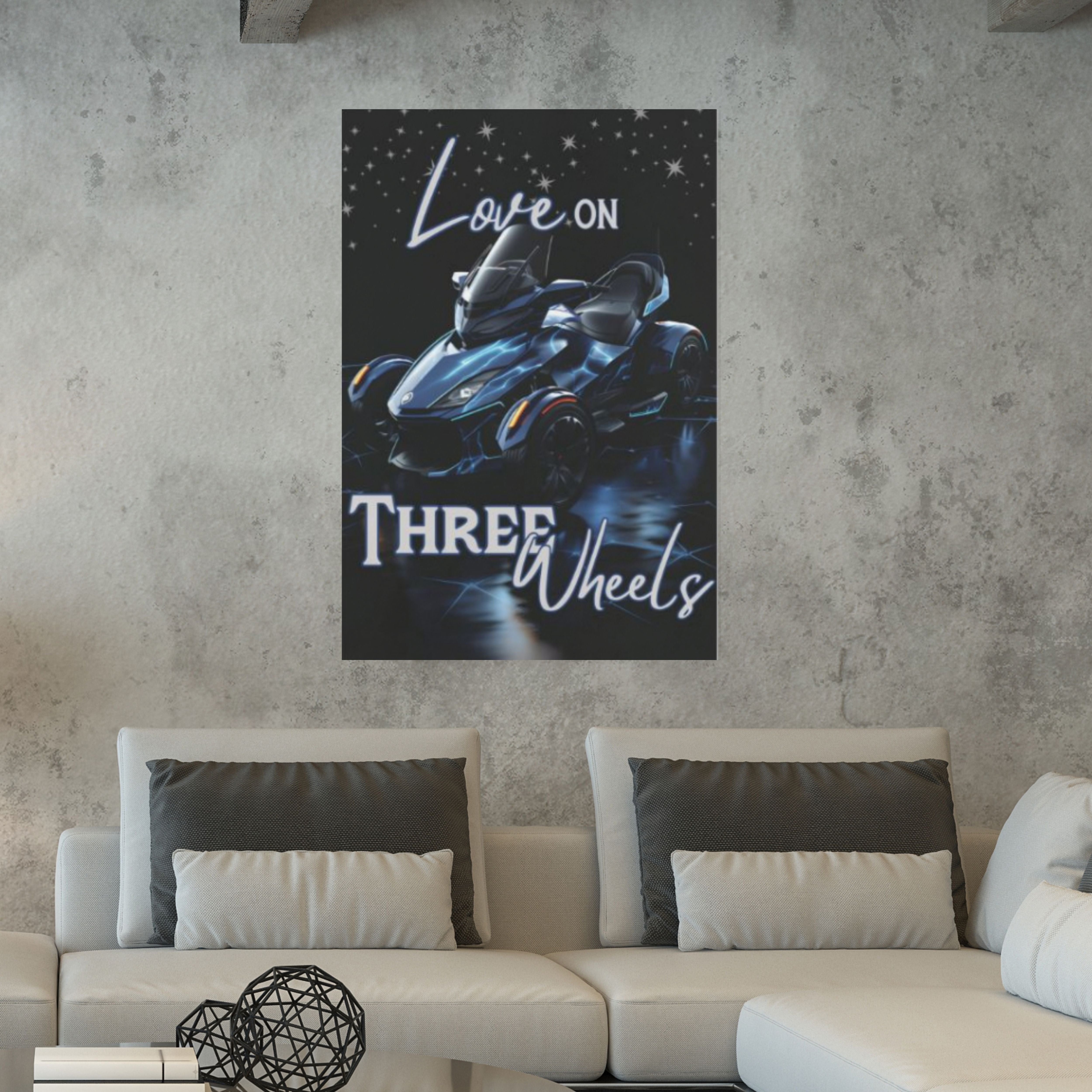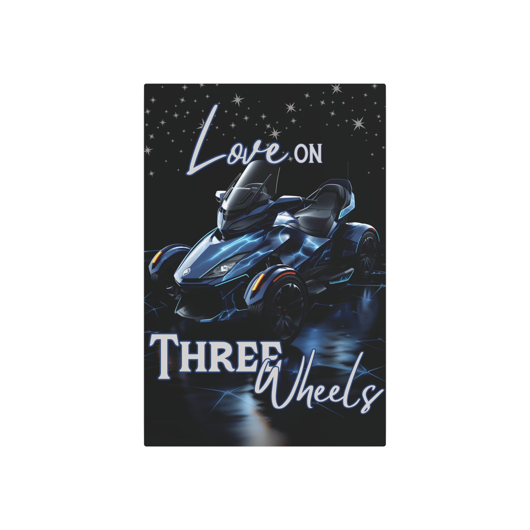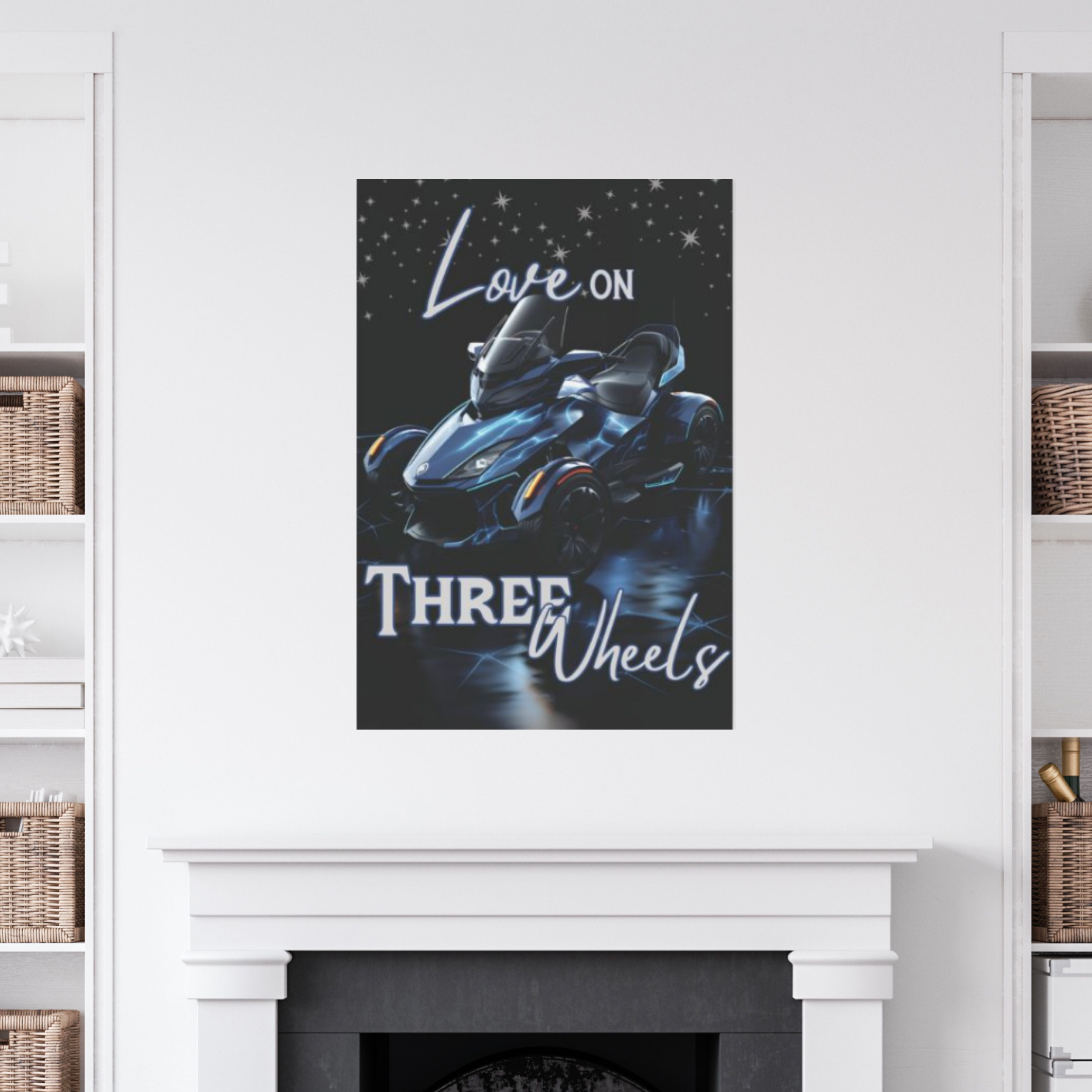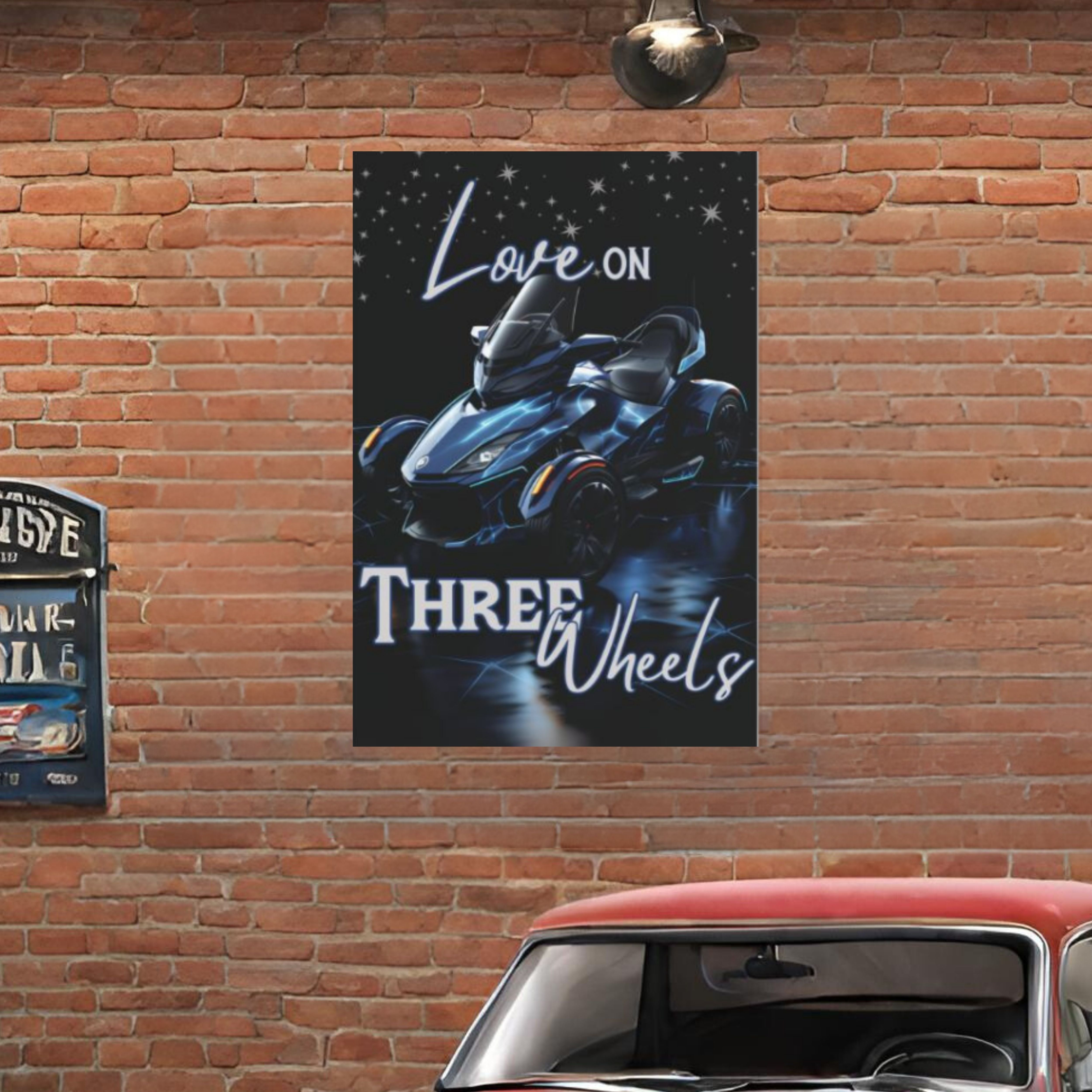 Rev up your decor with this striking metal tin poster, perfect for Can-Am Spyder motorcycle enthusiasts. It features a vibrant neon Spyder against a sleek black backdrop, emblazoned with the bold phrase 'Love on Three Wheels', making it an ideal statement piece for any Can-Am biker's space.
