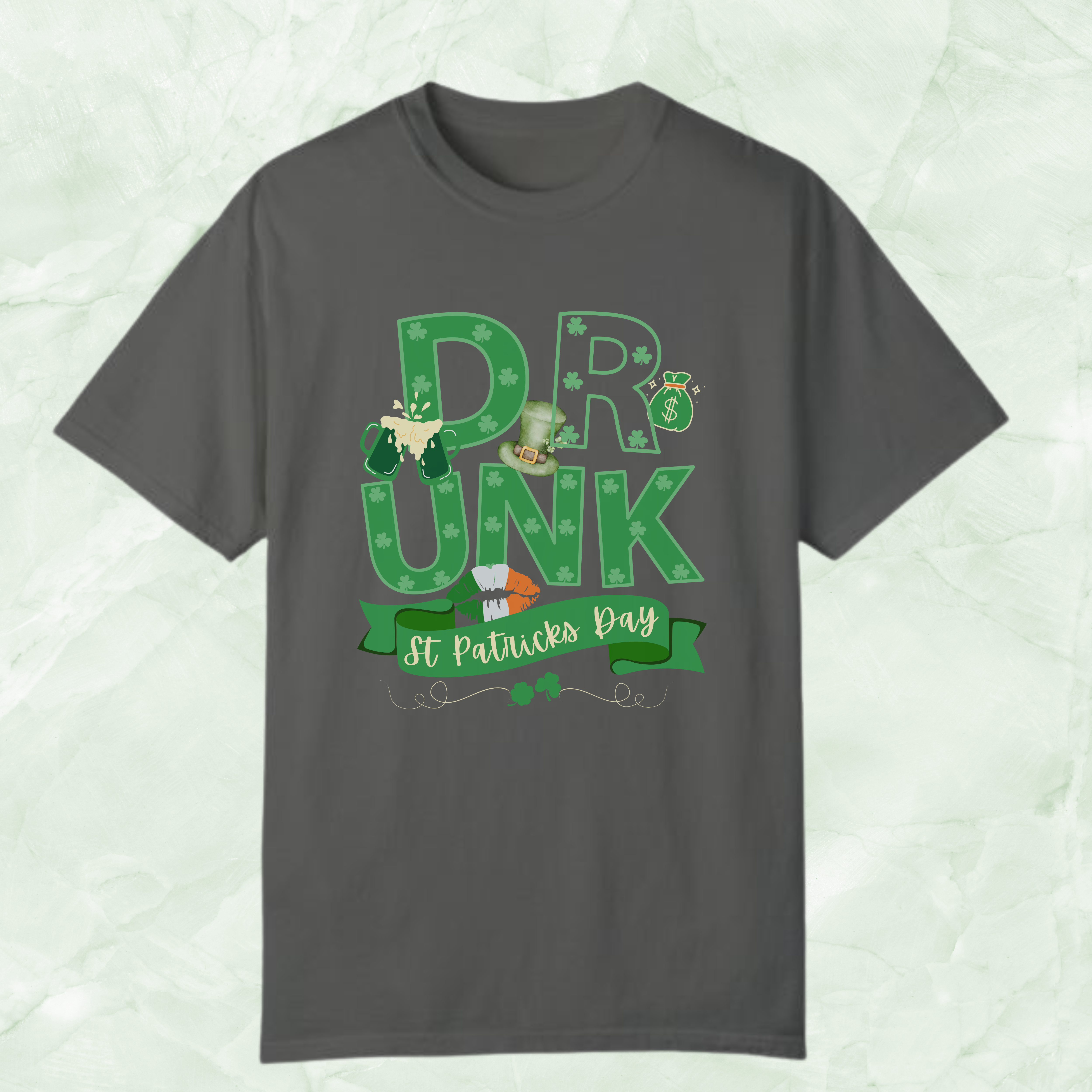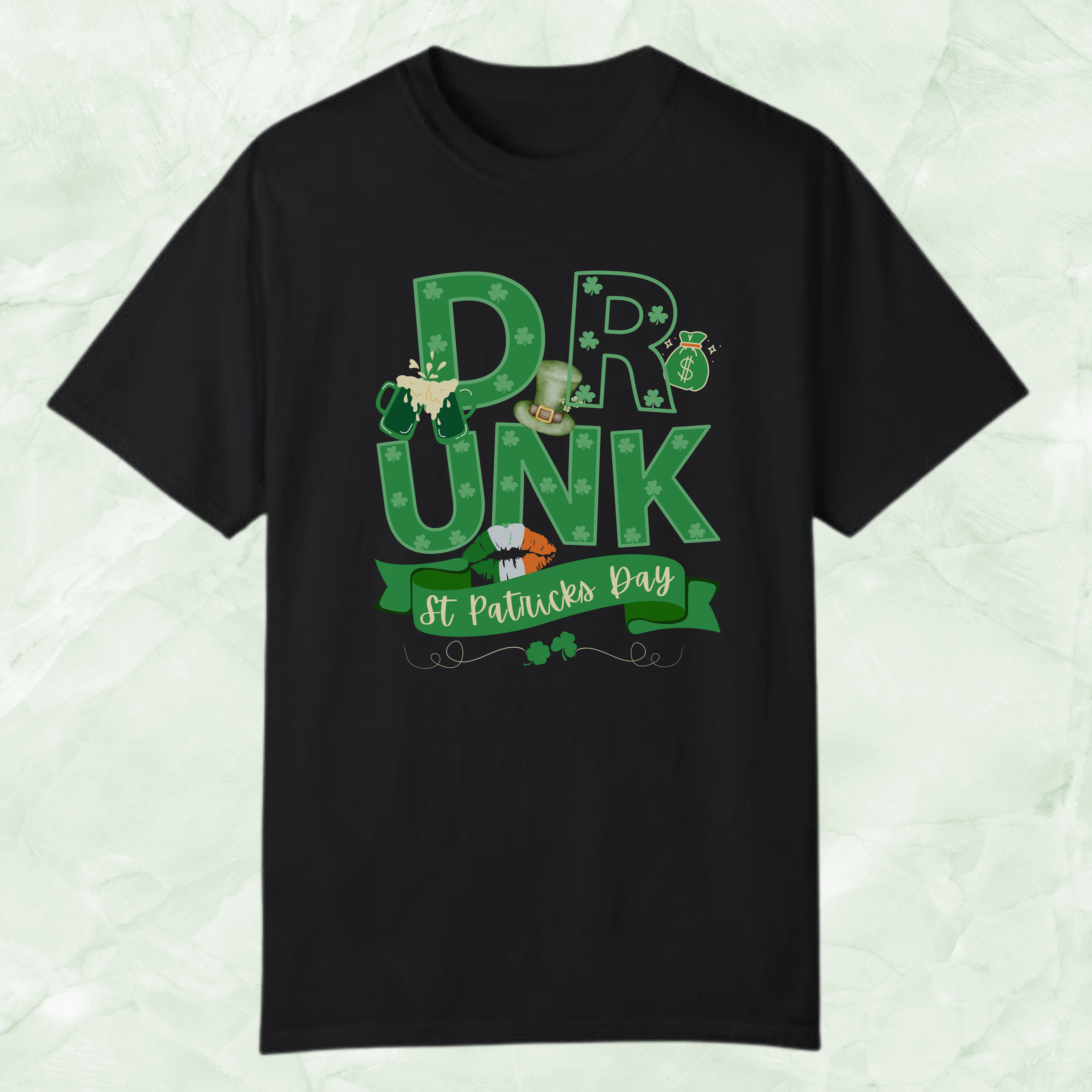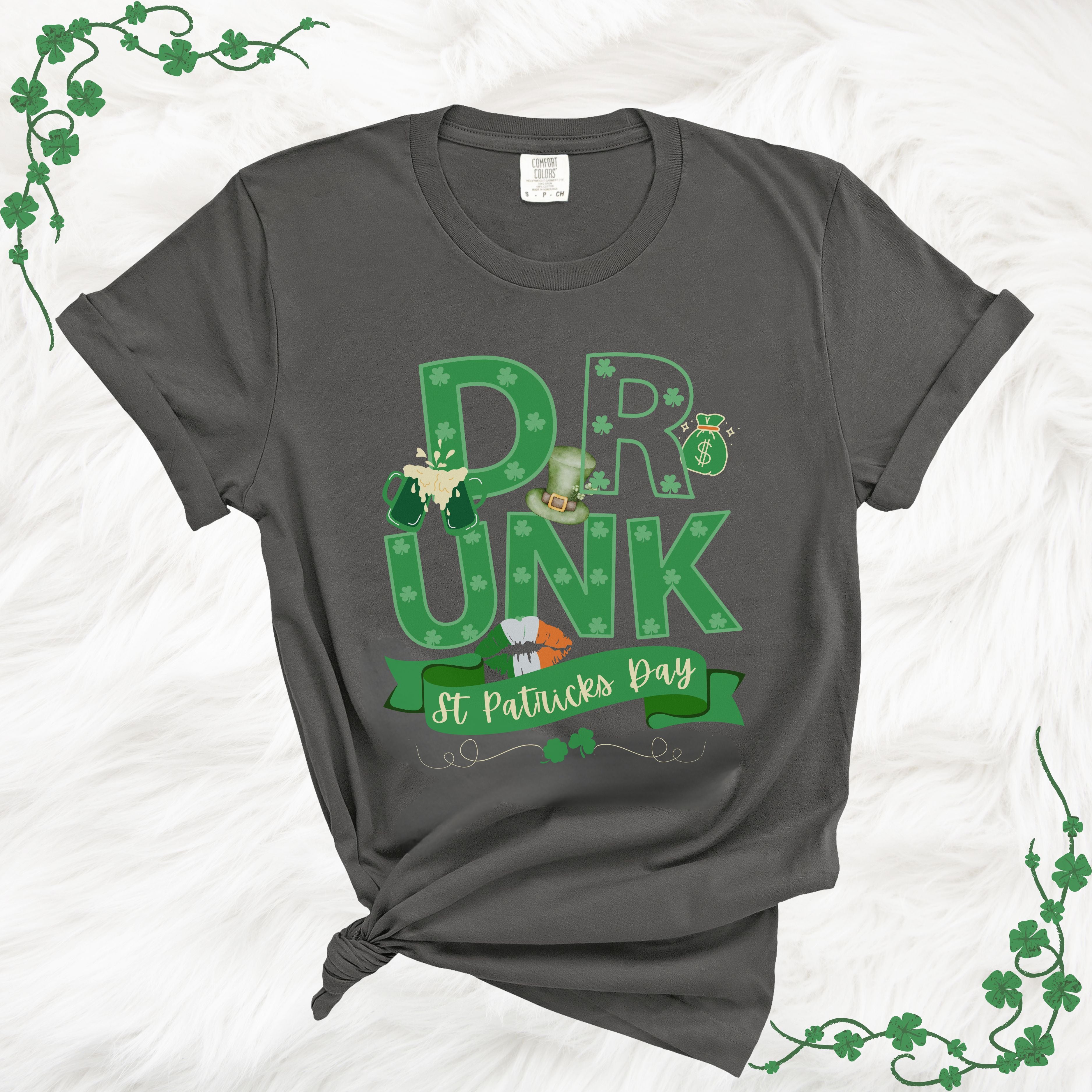 Get ready to make a bold statement this St. Patrick's Day with our eye-catching Irish Shirt, prominently featuring the word "DRUNK" in large, vibrant text across two rows. This festive design is elegantly framed by a ribbon at the bottom, declaring it a St. Patrick's Day essential, and is adorned with iconic symbols of the celebration: a leprechaun top hat, frothy green beer, a lucky money bag, and a playful set of lips in the Irish flag colors. Ideal for any shenanigans you plan to partake in, from bar hops to parades, this shirt is your ticket to embracing the holiday spirit with a blend of humor and style. Don't miss out on adding this shamrock-sprinkled, Shenanigans Shirt to your festive wardrobe!
