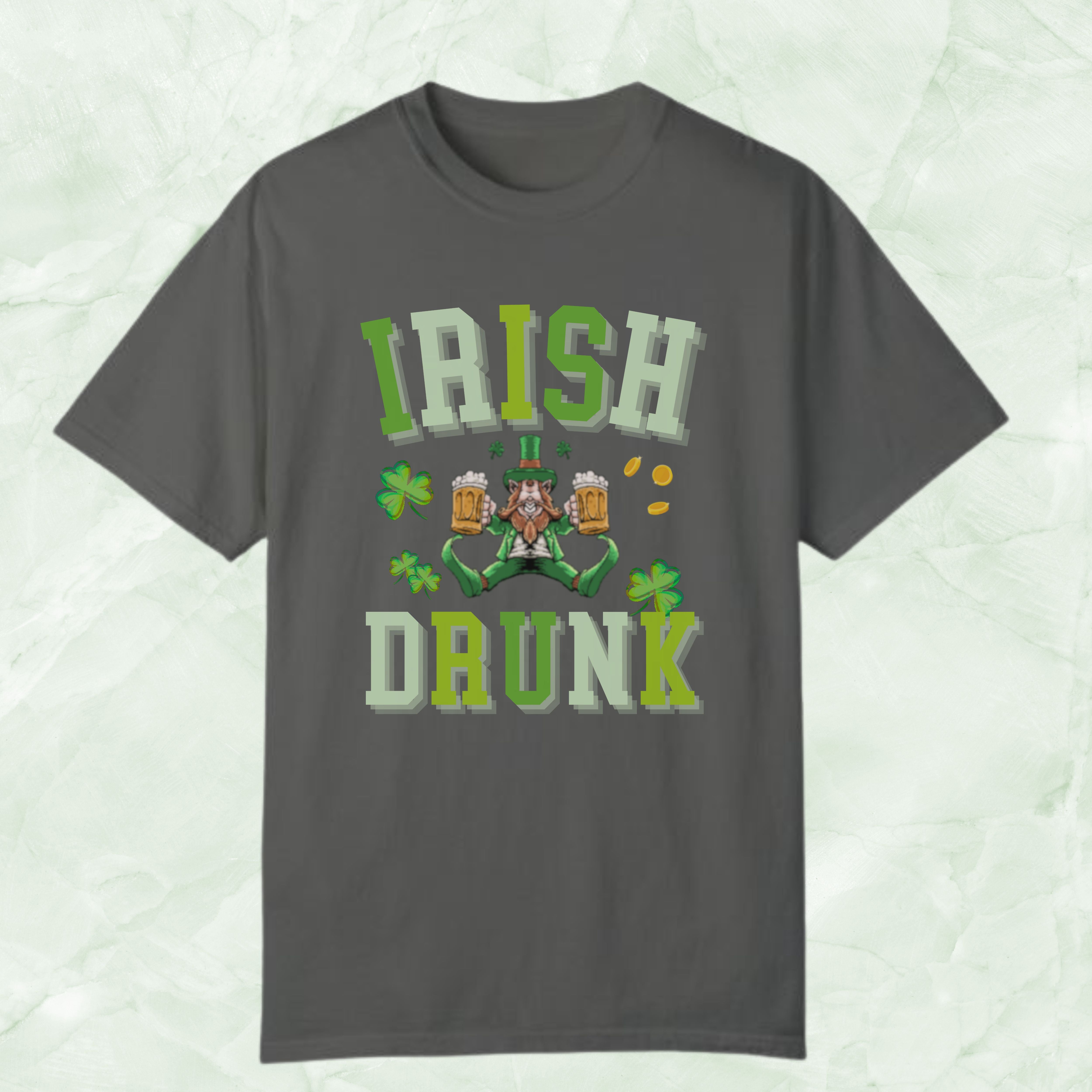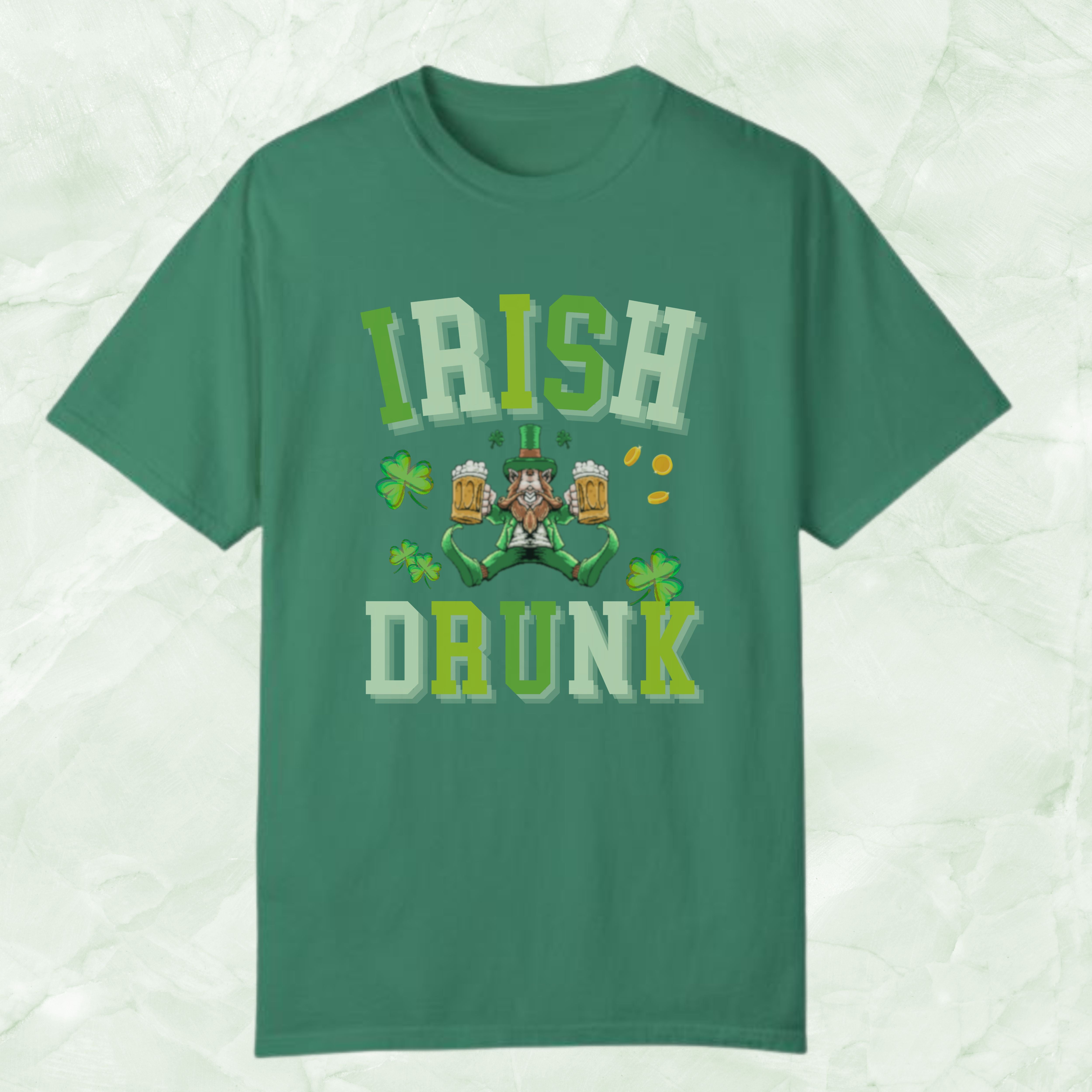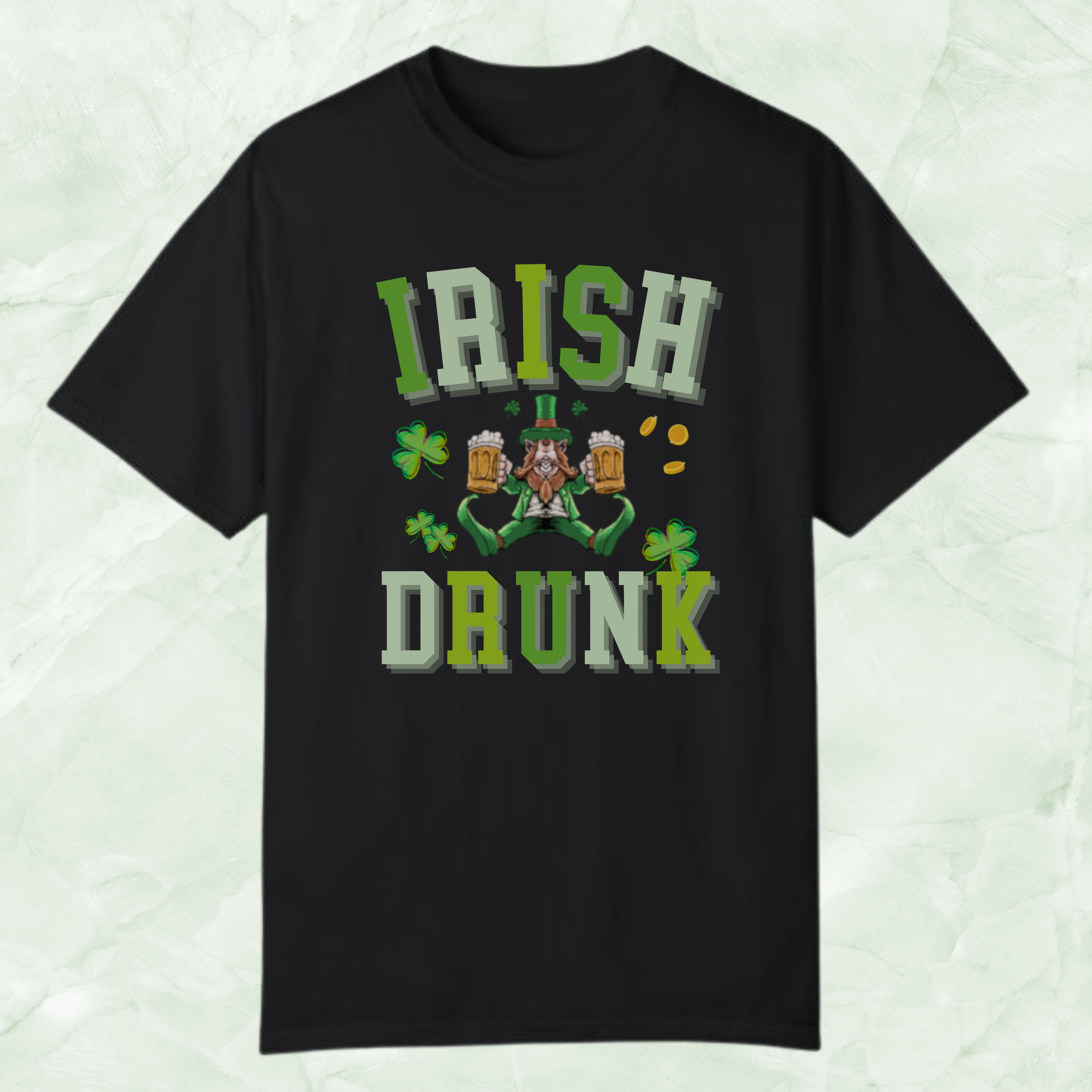 Celebrate St. Patrick's Day in style with our unique Irish Shirt, featuring a whimsical, blurred mirror image of a leprechaun taking a break on his butt, beer in hand, embodying the spirit of the holiday. The playful design is complemented by the blurred text "Irish Drunk," adding a touch of humor to your festivities. Perfect for parades, pub crawls, or any shenanigans you find yourself in, this shirt is adorned with shamrocks to bring luck and laughter to your celebrations. Make this St. Patrick's Day unforgettable with our Shenanigans Shirt, the ideal choice for anyone looking to blend tradition with a twist of fun.