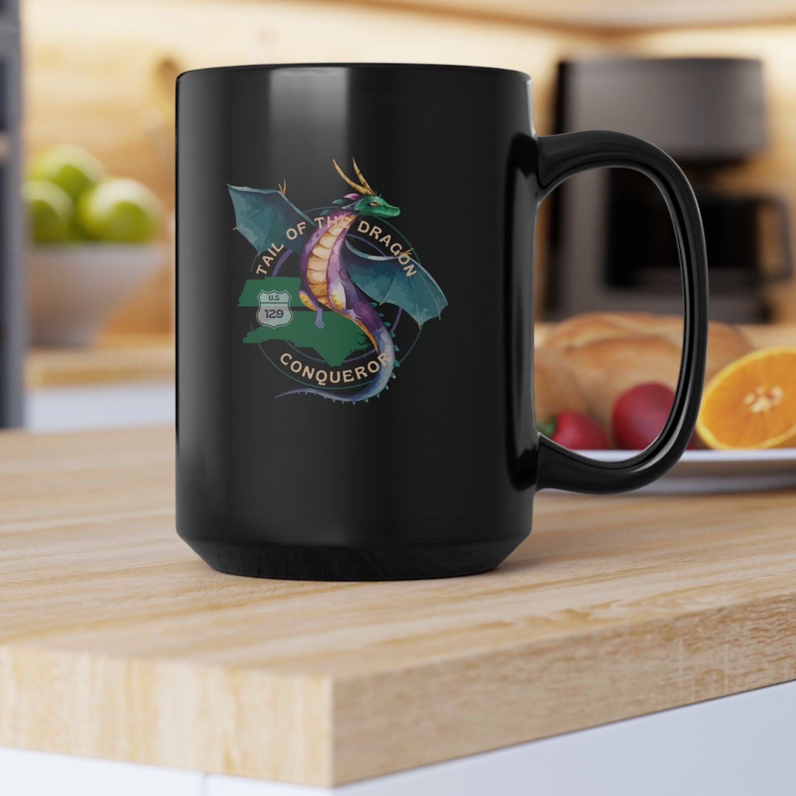 Start your day with bold energy using this 15 oz black coffee mug featuring a striking Tail of the Dragon design—perfect for motorcycle enthusiasts and road warriors alike. This unique mug showcases a mystical dragon layered over twin circles with Tennessee and North Carolina highlighted, celebrating one of the most legendary motorcycle routes in America. With 318 curves packed into 11 exhilarating miles, U.S. 129 is a rite of passage for serious riders, and this mug is the perfect way to show you’ve conquered the Dragon.
