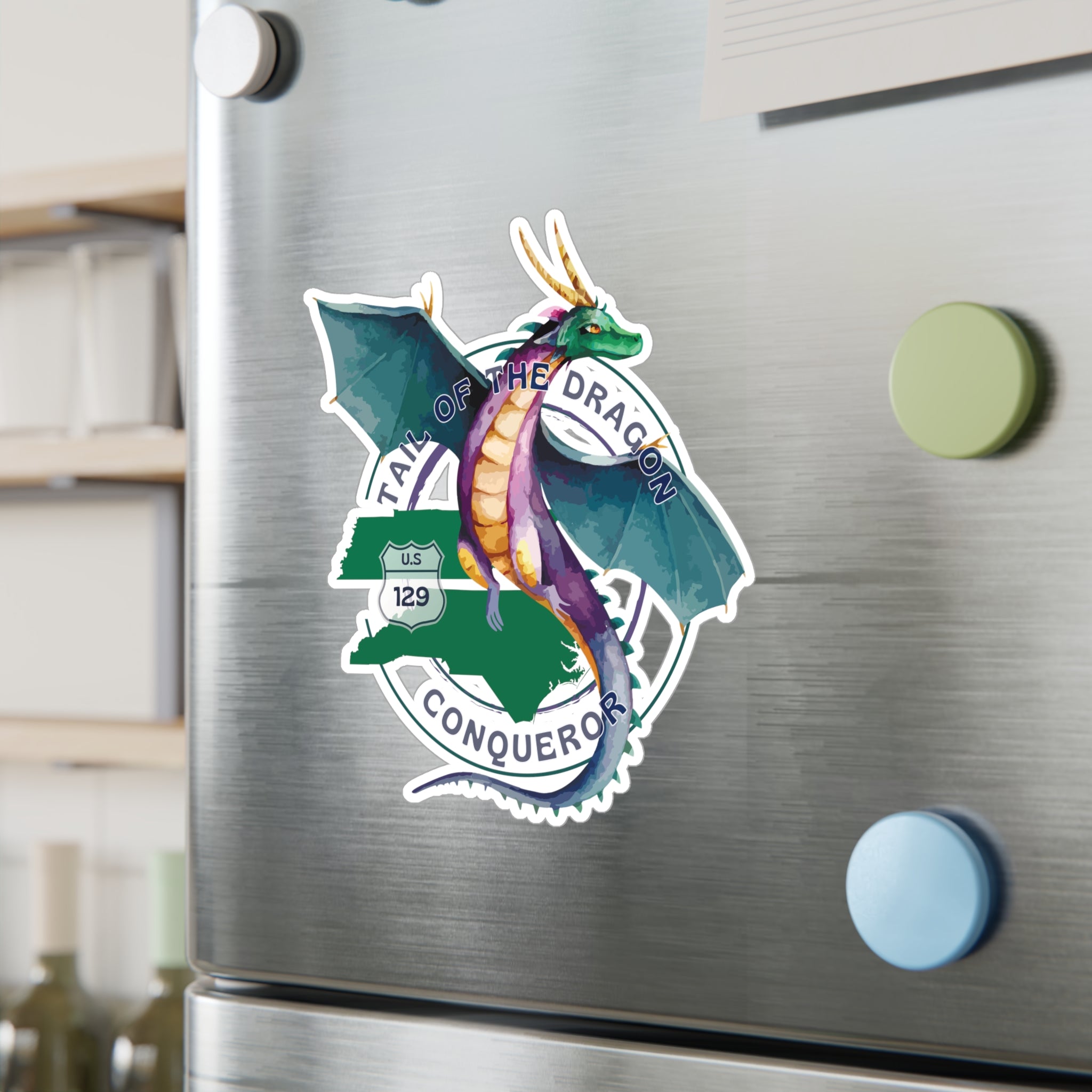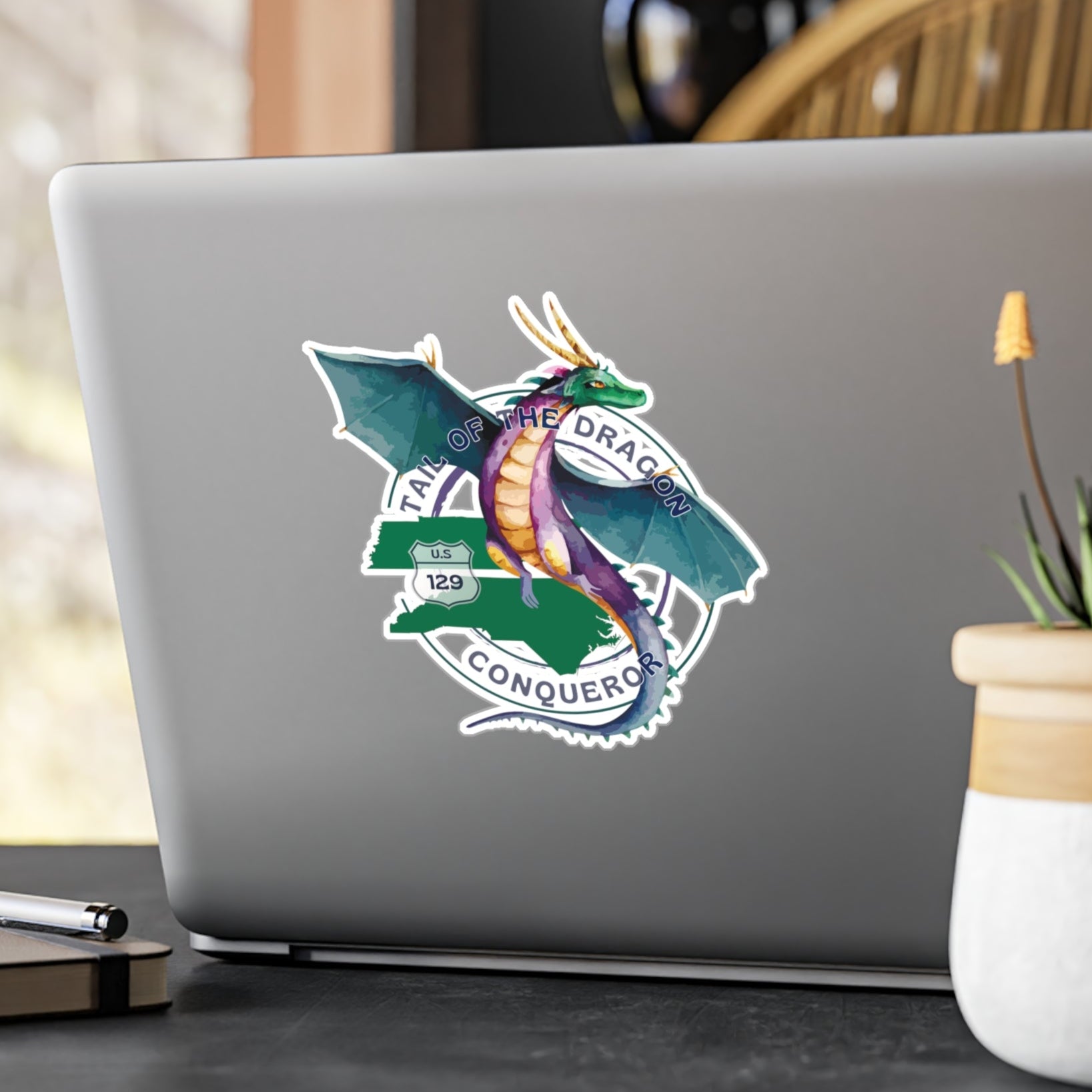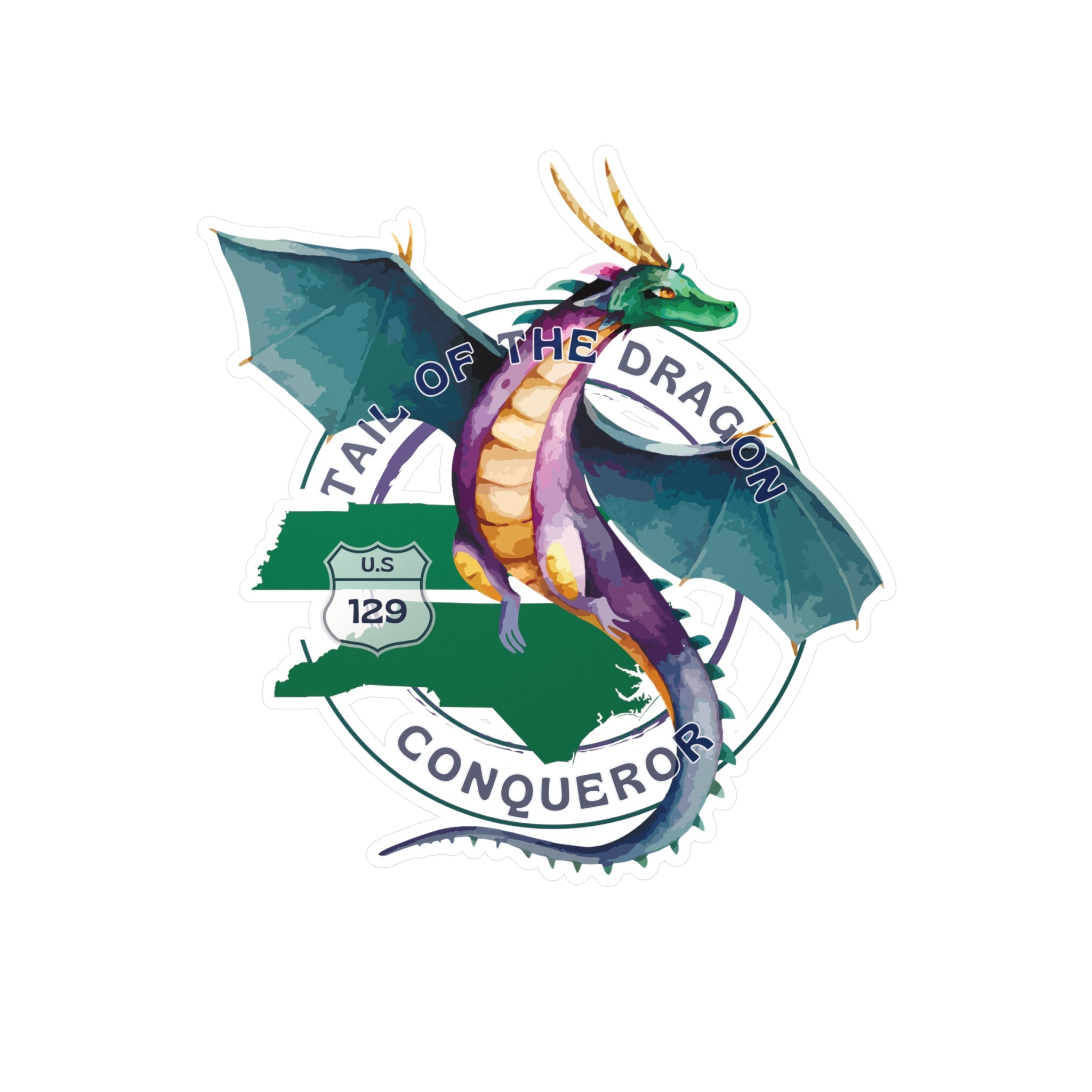 Celebrate your ride on America’s most legendary motorcycle route with this bold Tail of the Dragon Conqueror kiss-cut decal sticker. Featuring an intricate mystical dragon layered over intersecting rings and the states of Tennessee and North Carolina, this design honors your journey through 318 curves packed into just 11 unforgettable miles on U.S. Route 129. Perfect for helmets, bikes, toolboxes, car windows, or laptops, this premium vinyl sticker is a must-have for every serious rider who's tackled the Dragon.