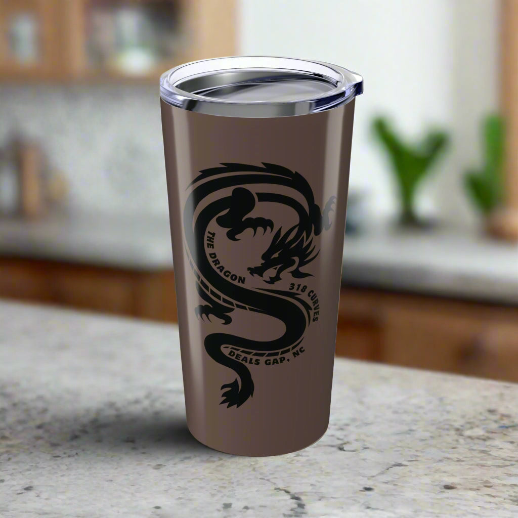 Take the ride with you wherever you go with this olive green 20 oz travel mug featuring a bold black design inspired by the legendary Tail of the Dragon route through Deals Gap, North Carolina. This durable, adventure-ready tumbler showcases a winding dragon graphic with curved text paying tribute to one of America’s most thrilling motorcycle roads—318 curves packed into 11 unforgettable miles. Ideal for bikers, road trip lovers, and motorsport fans, this insulated mug keeps drinks hot or cold while fueling your passion for the ride.