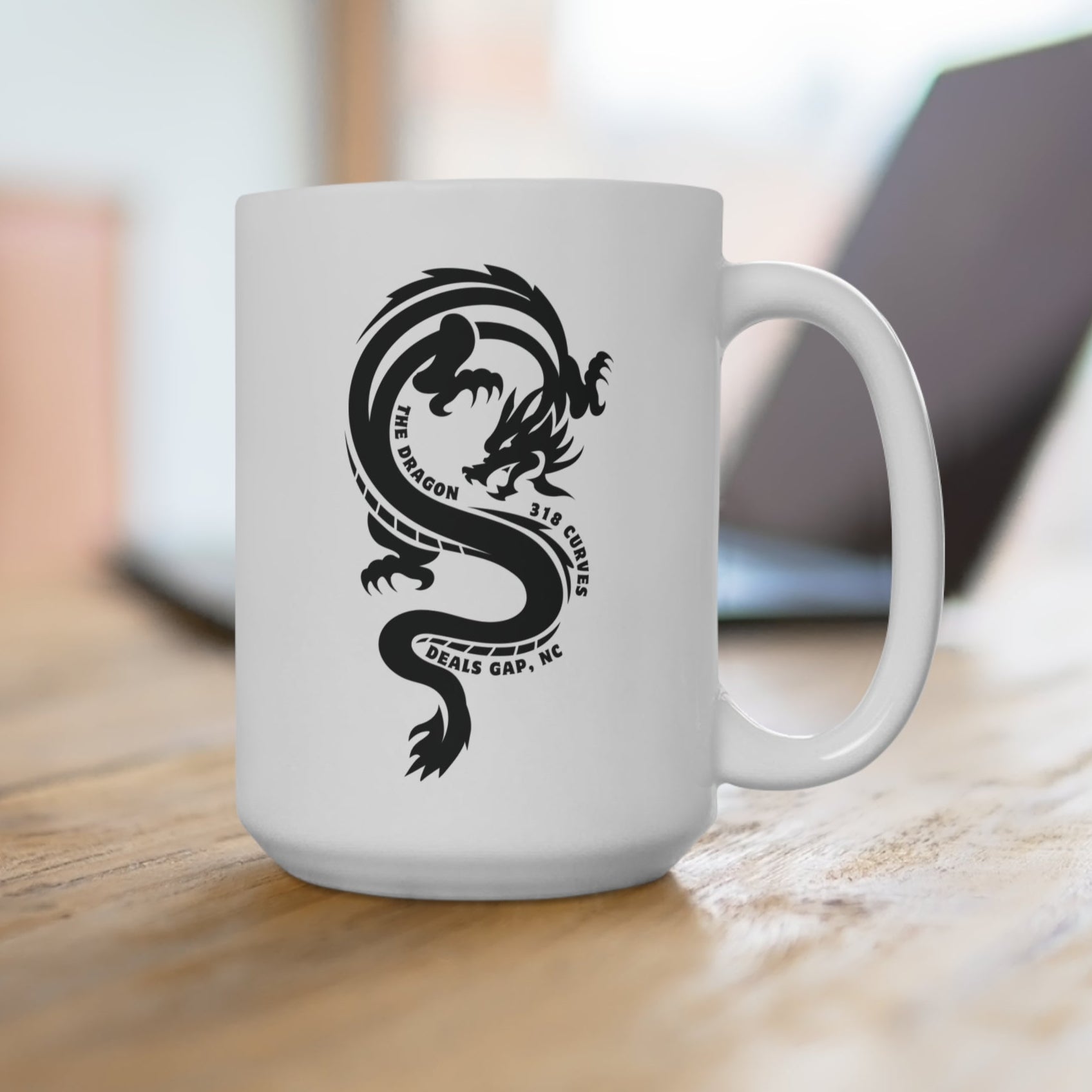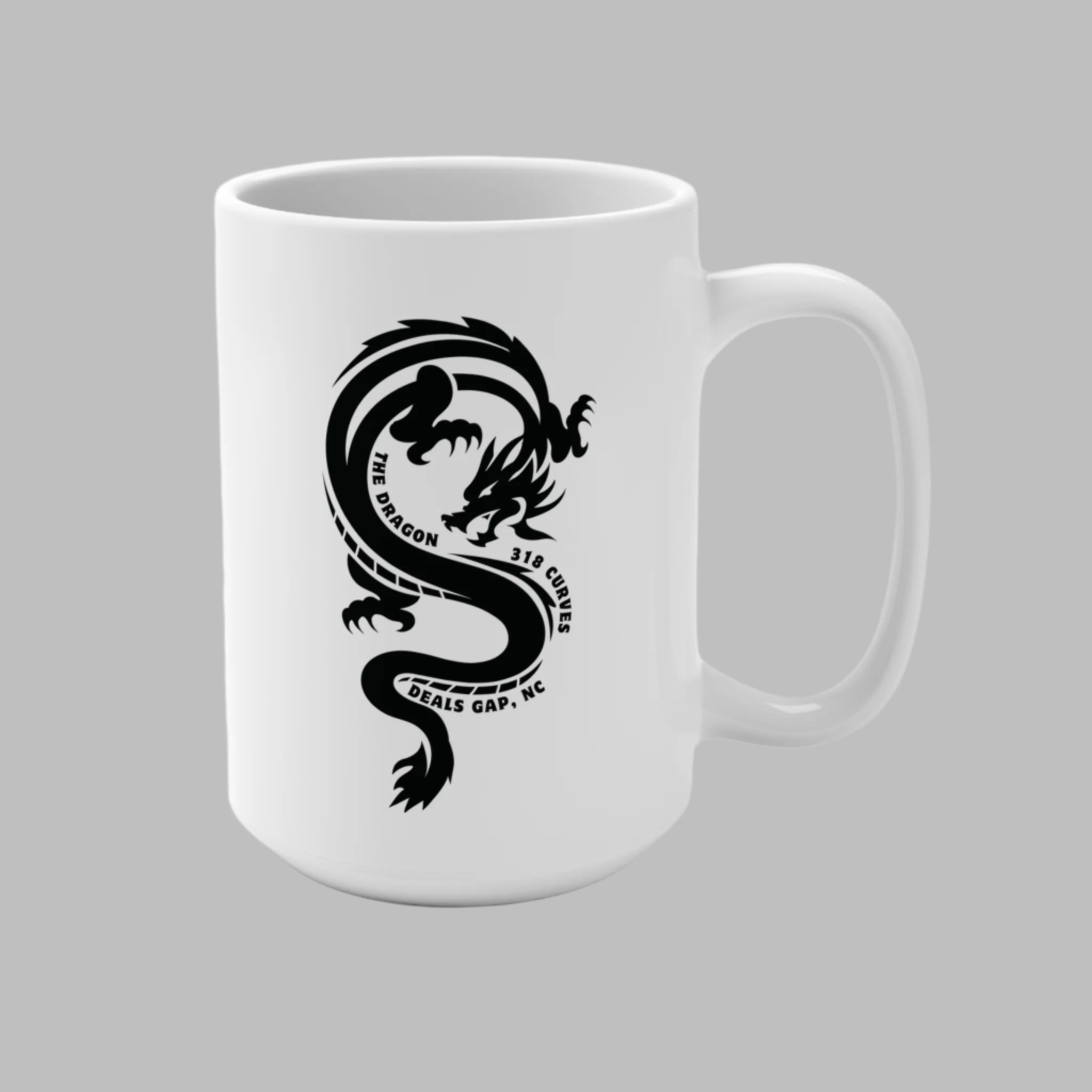 Fuel your morning with the thrill of the ride using our white 15 oz ceramic coffee mug featuring a bold black Tail of the Dragon design. Showcasing a fierce dragon graphic and curved text that honors the legendary 318-curve route through Deals Gap, North Carolina, this mug is perfect for motorcycle enthusiasts who’ve tackled—or dream of tackling—America’s most iconic motorcycle road. Durable and stylish, it’s an ideal gift or daily reminder of the adventure that waits just around the next turn.