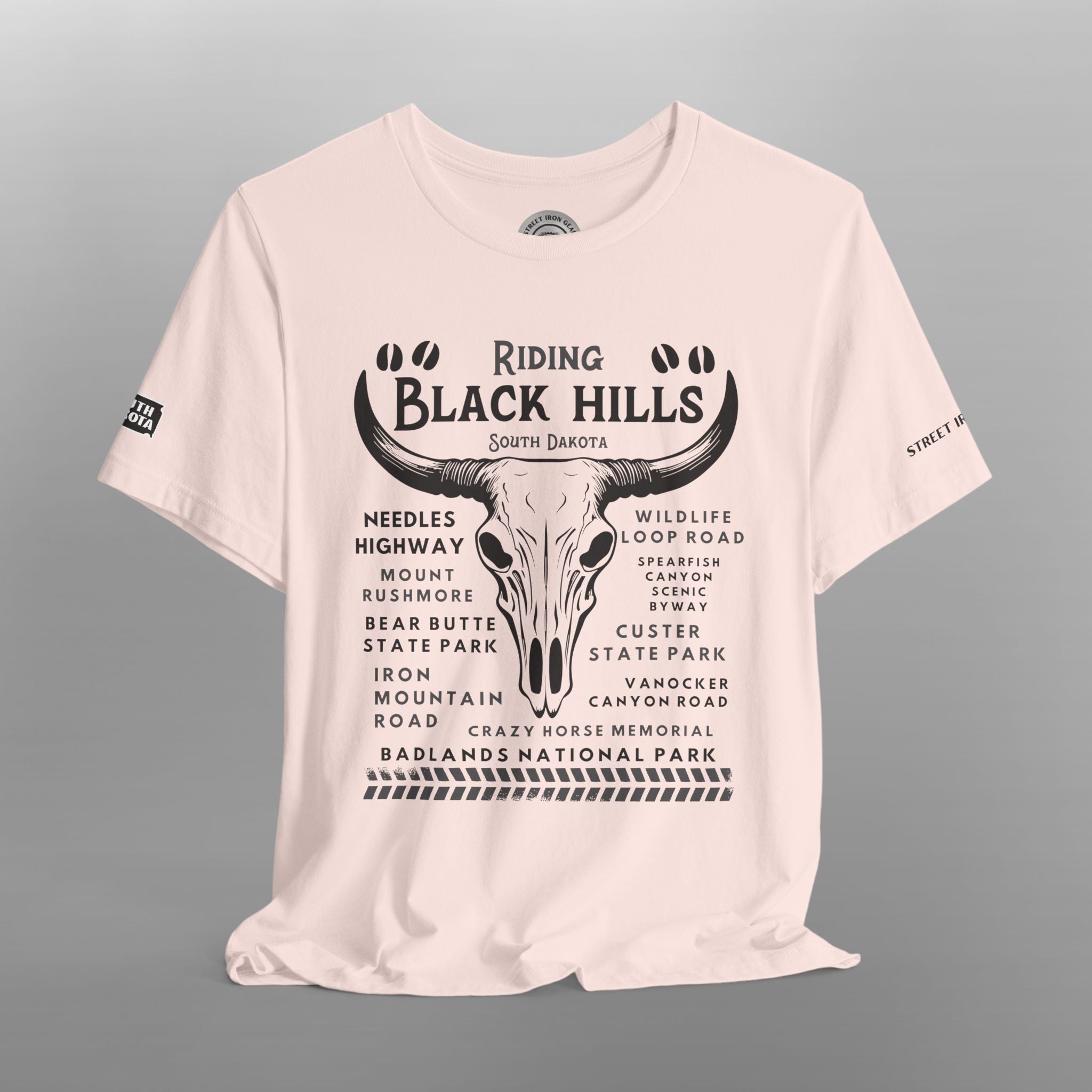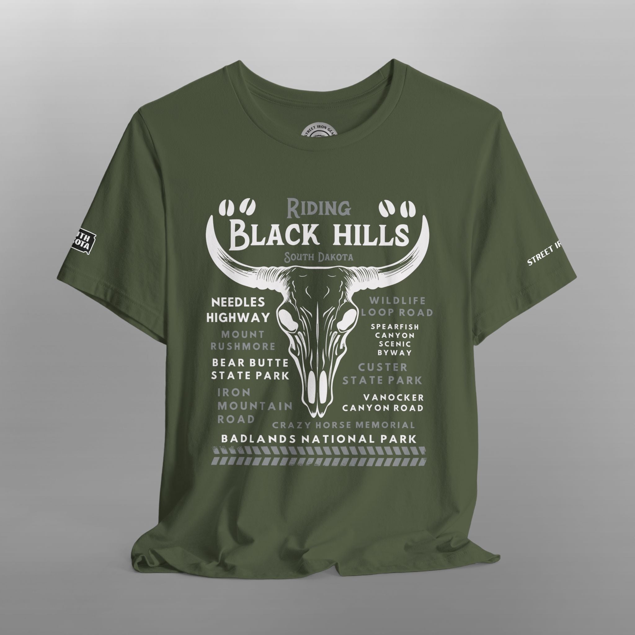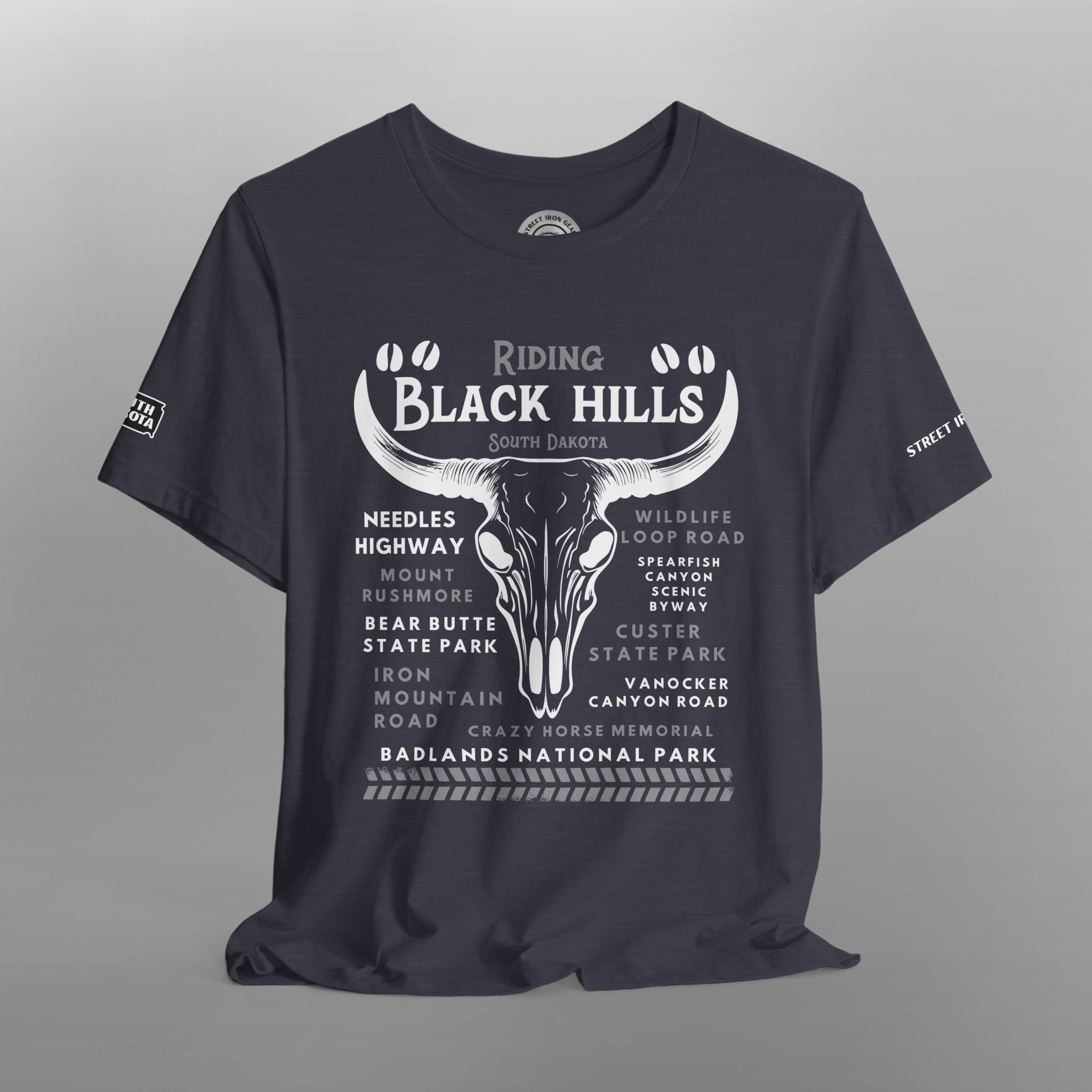 Experience the thrill of South Dakota’s most iconic motorcycle routes with our Black Hills Riding T-Shirt — a must-have for any rider who’s explored or dreams of riding the legendary roads of the Black Hills. This custom motorcycle-themed T-shirt features a bold bison skull graphic surrounded by the names of South Dakota's top rides, including Needles Highway, Mount Rushmore, Iron Mountain Road, Wildlife Loop Road, Spearfish Canyon, Bear Butte State Park, Vanocker Canyon Road, Custer State Park, Badland National Park and the Crazy Horse Memorial. Available in two print styles—light design on dark tees and dark design on lighter tees—with your choice of front or back placement, plus a subtle SD state outline on the right sleeve and Street Iron Gear branding on the left for added style.