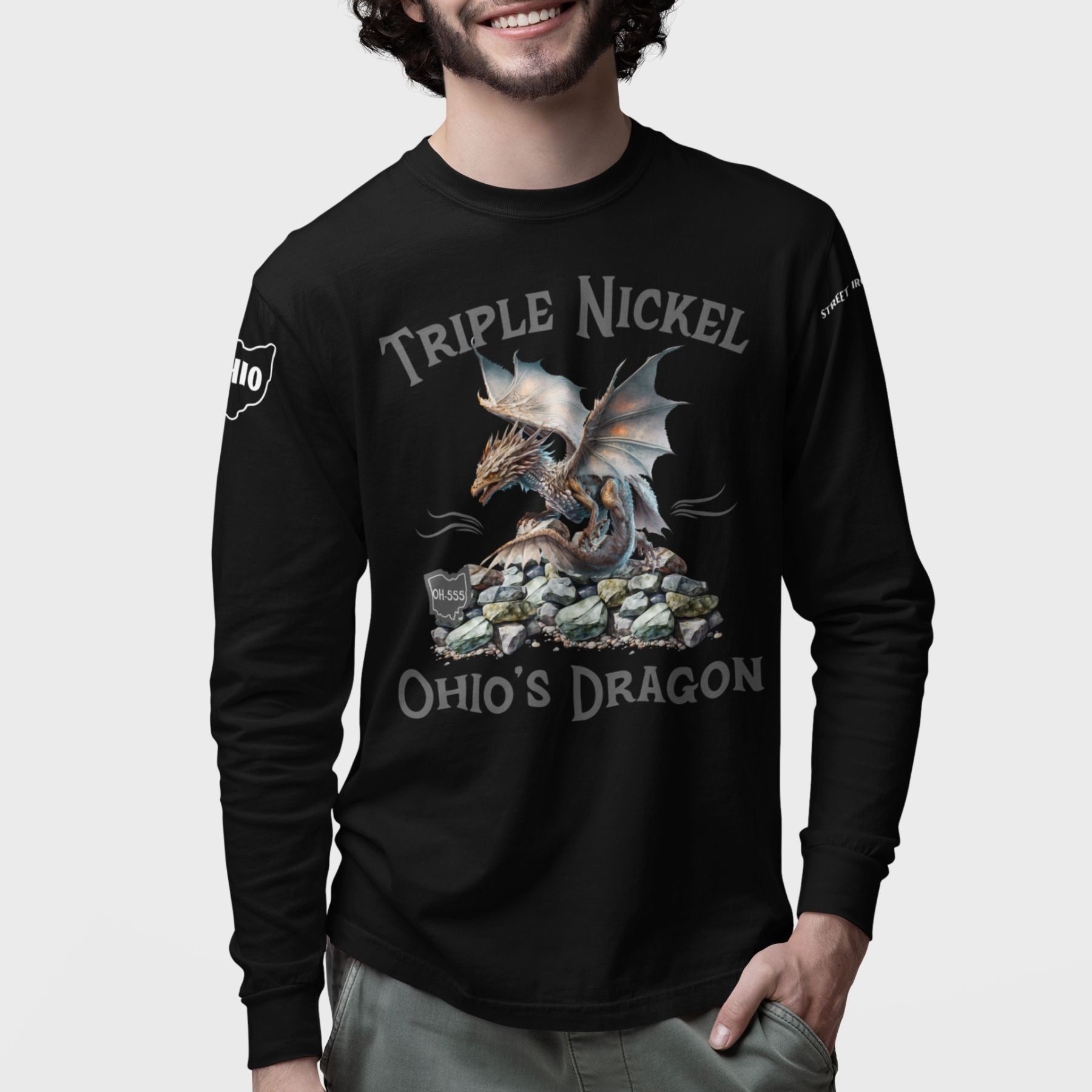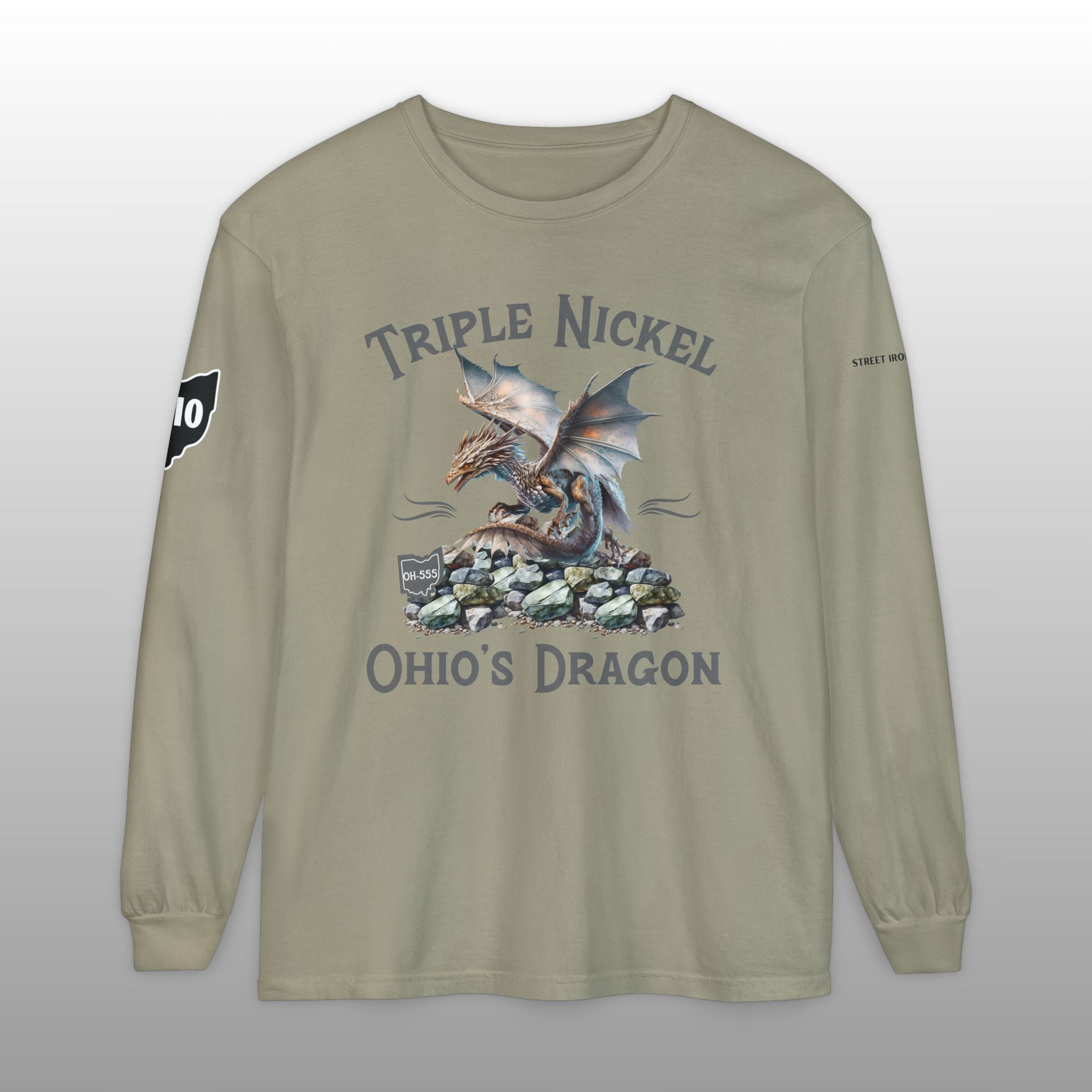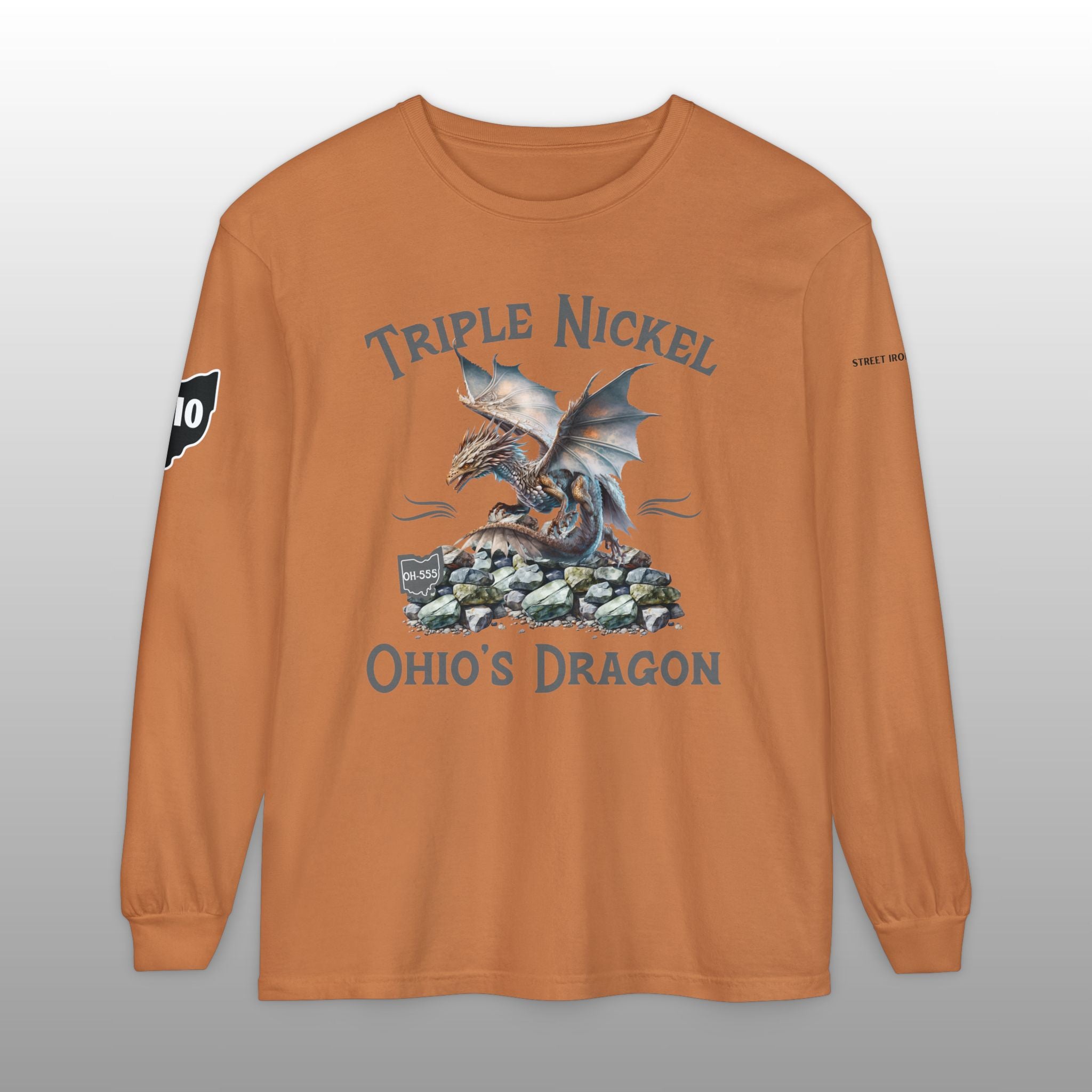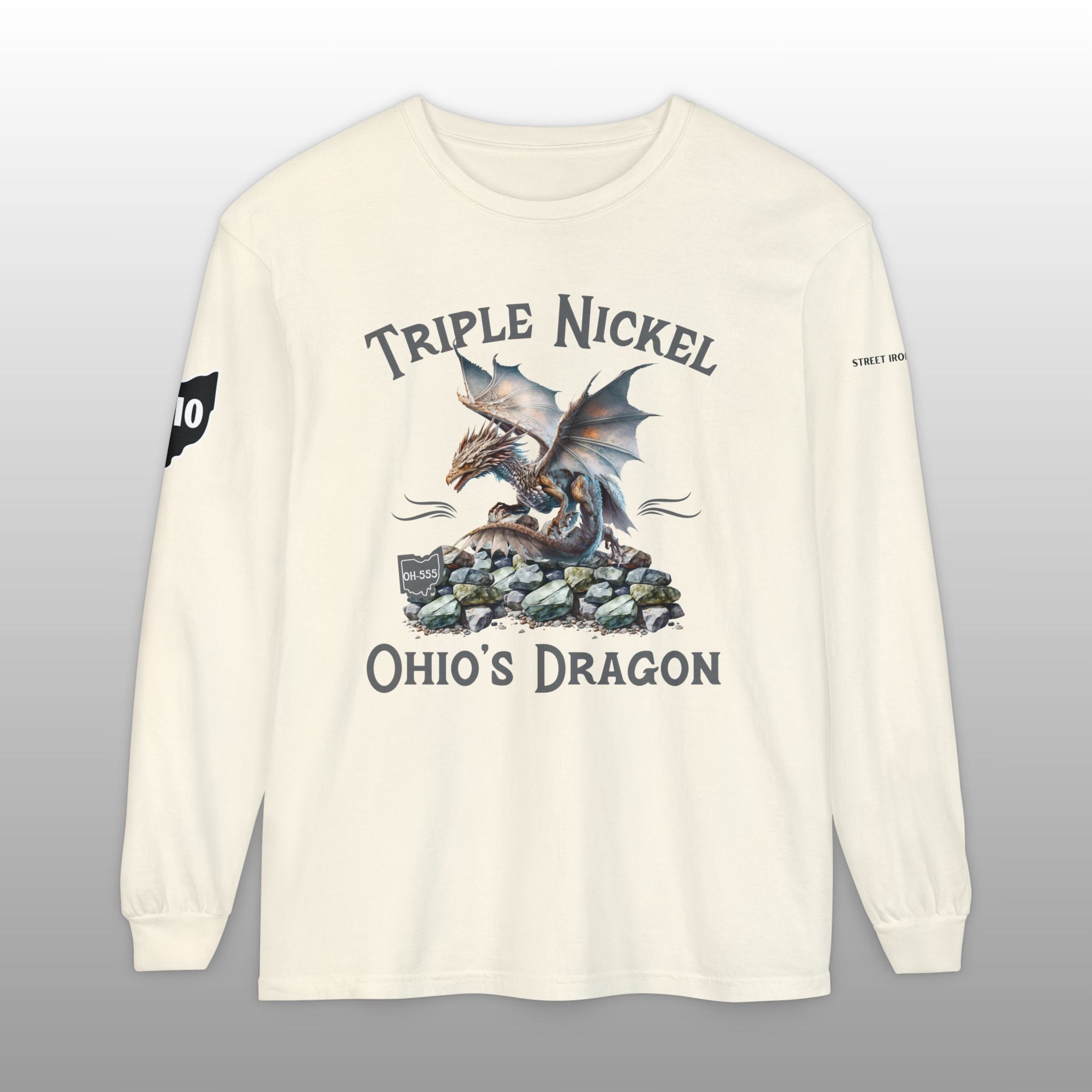 Conquer the curves of the legendary Triple Nickel in comfort and style with this premium long sleeve T-shirt, perfect for any serious motorcycle rider or road trip enthusiast! This high-quality Comfort Colors garment-dyed tee features a mystical serpentine creature graphic alongside the popular nickname "Triple Nickel Ohio's Dragon," celebrating the challenging OH-555 route through Ohio. Made from soft, durable cotton, this long sleeve shirt is ideal for layering on cool riding days or wearing casually to show off your accomplishment. This unique piece of motorcycle apparel is a must-have rider gift and a fantastic souvenir for those who've mastered the twists and turns of this famous US scenic route.