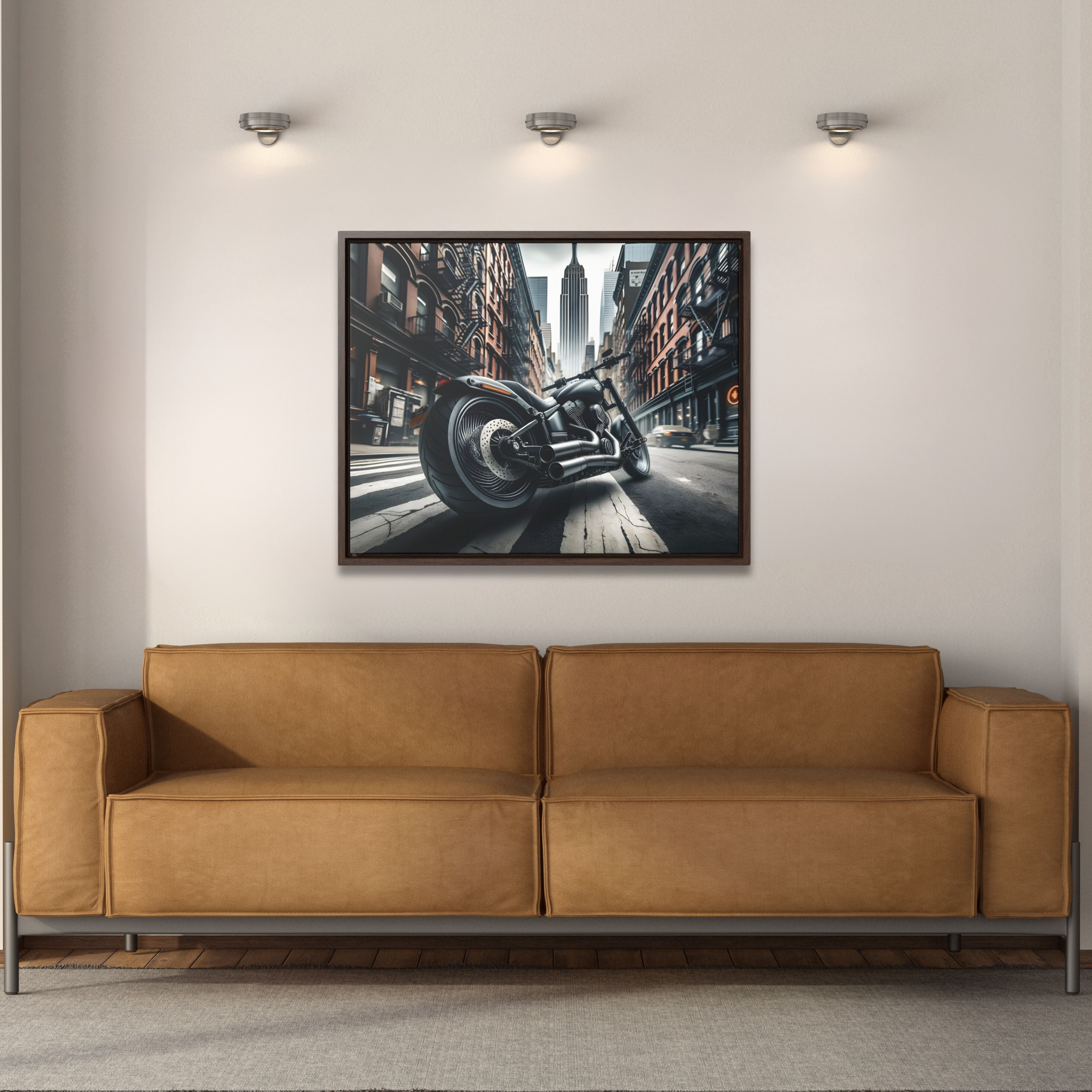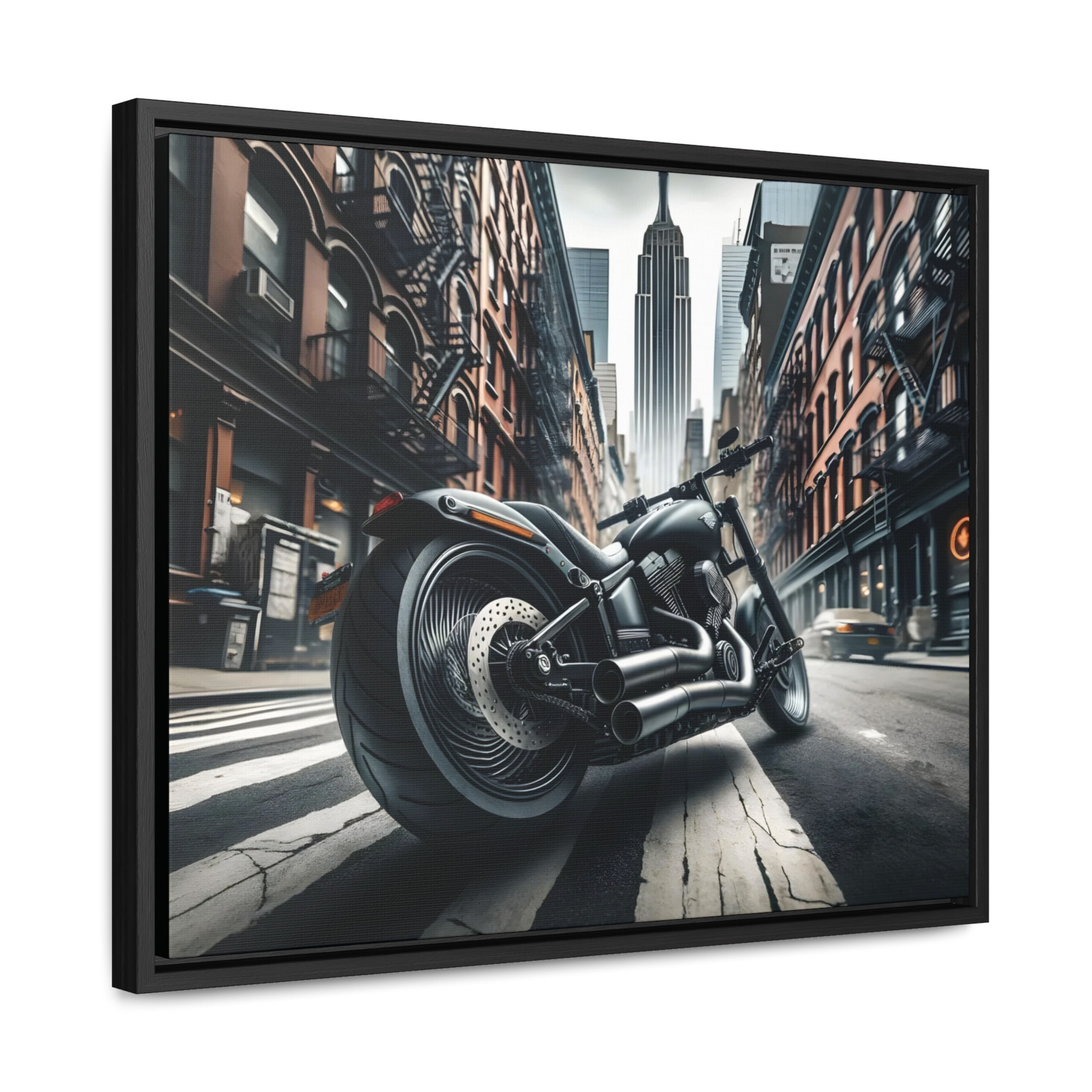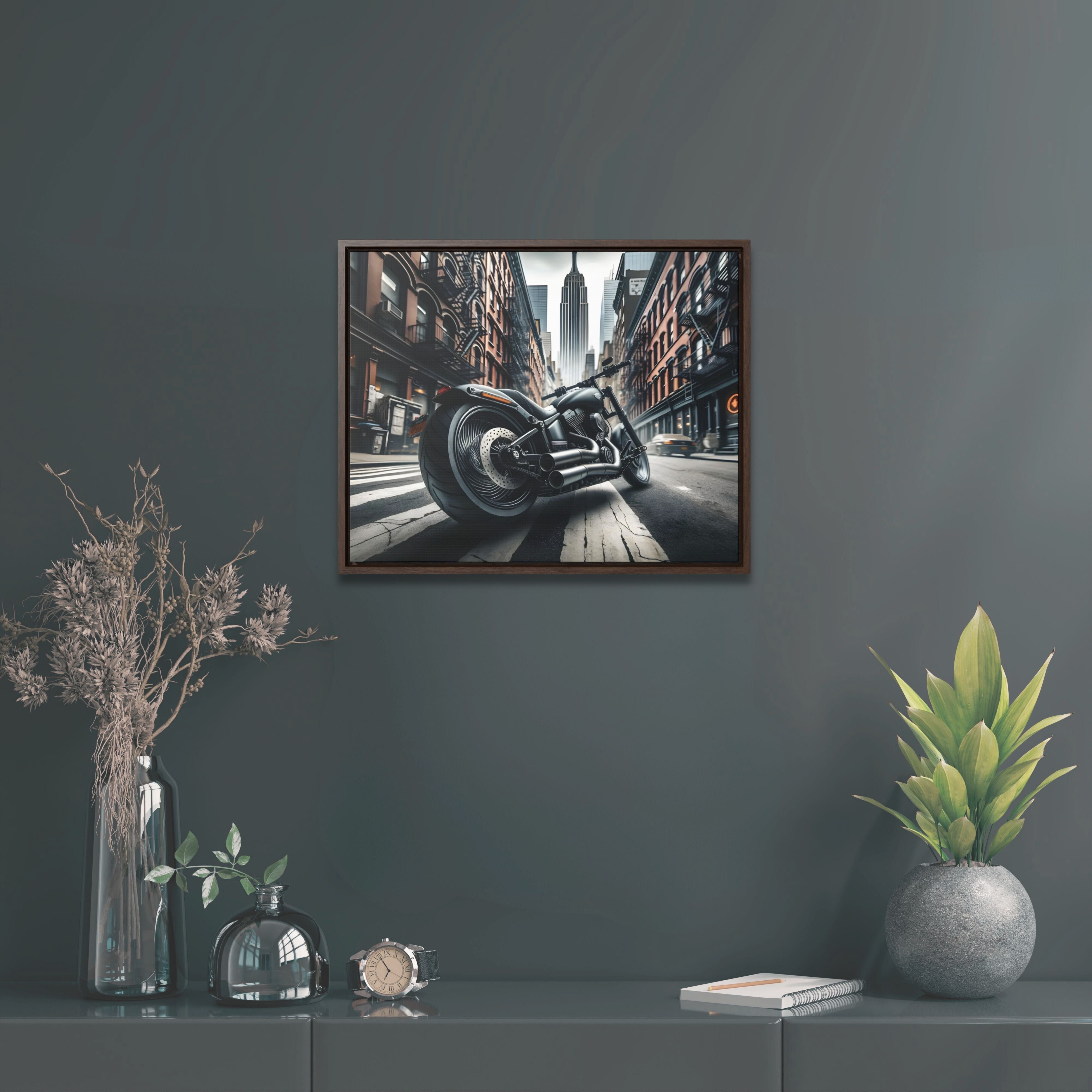 Transform your space with our 'Urban Motorcycle' framed canvas wall art, a stunning piece that merges the thrill of biking with urban elegance. This huge biker canvas wall decor, featuring a moody classic motorcycle design, is the perfect gift for motorcycle lovers and a striking addition to any collection of motorcycle art prints. Let your personality be reflected on the artwork adorning your walls. This horizontal gallery wrapped canvas print will always look as tight and flat as the day it was made. Every frame is built with a solid face to support the canvas and prevent deforming. Available in multiple sizes, comes in walnut and black frame options.