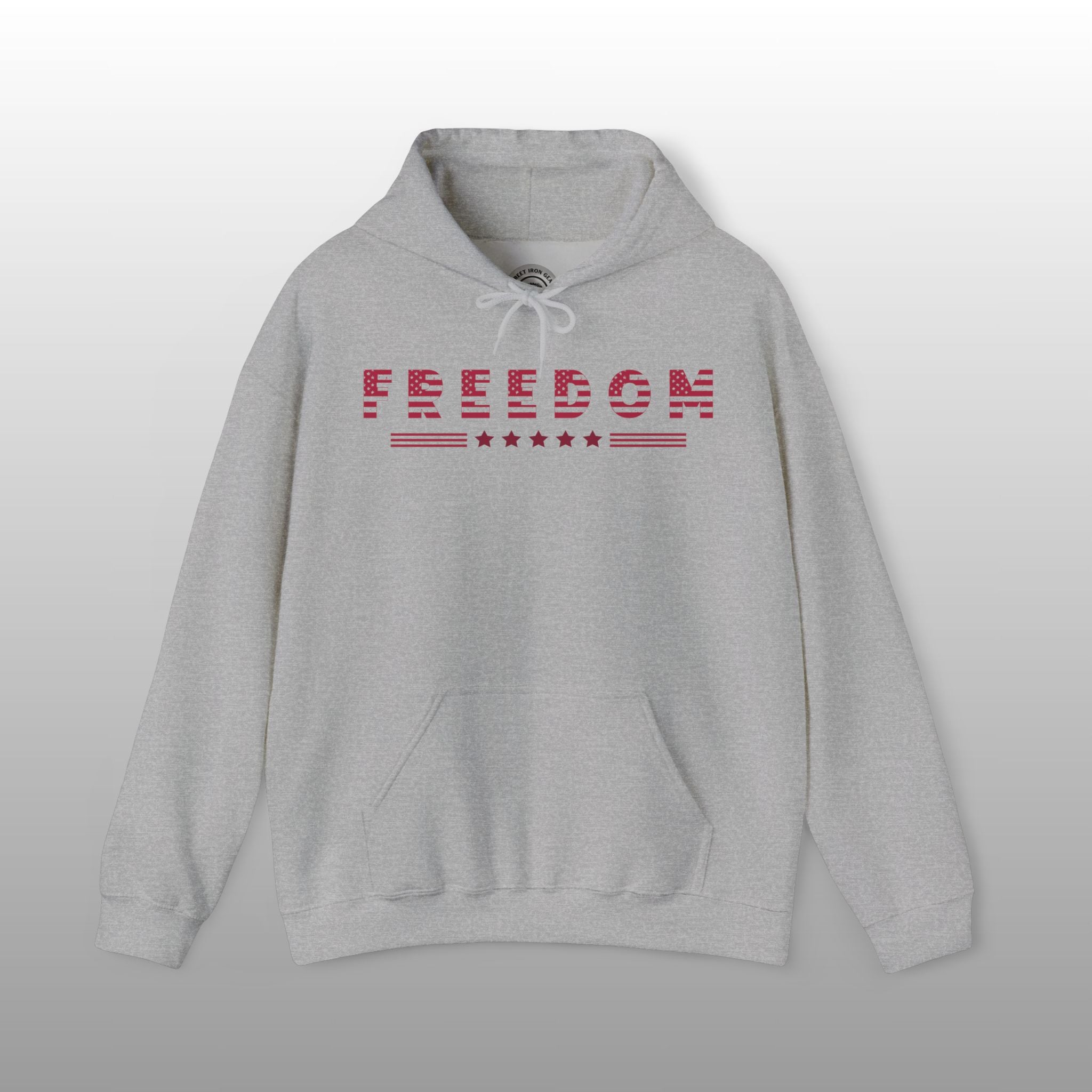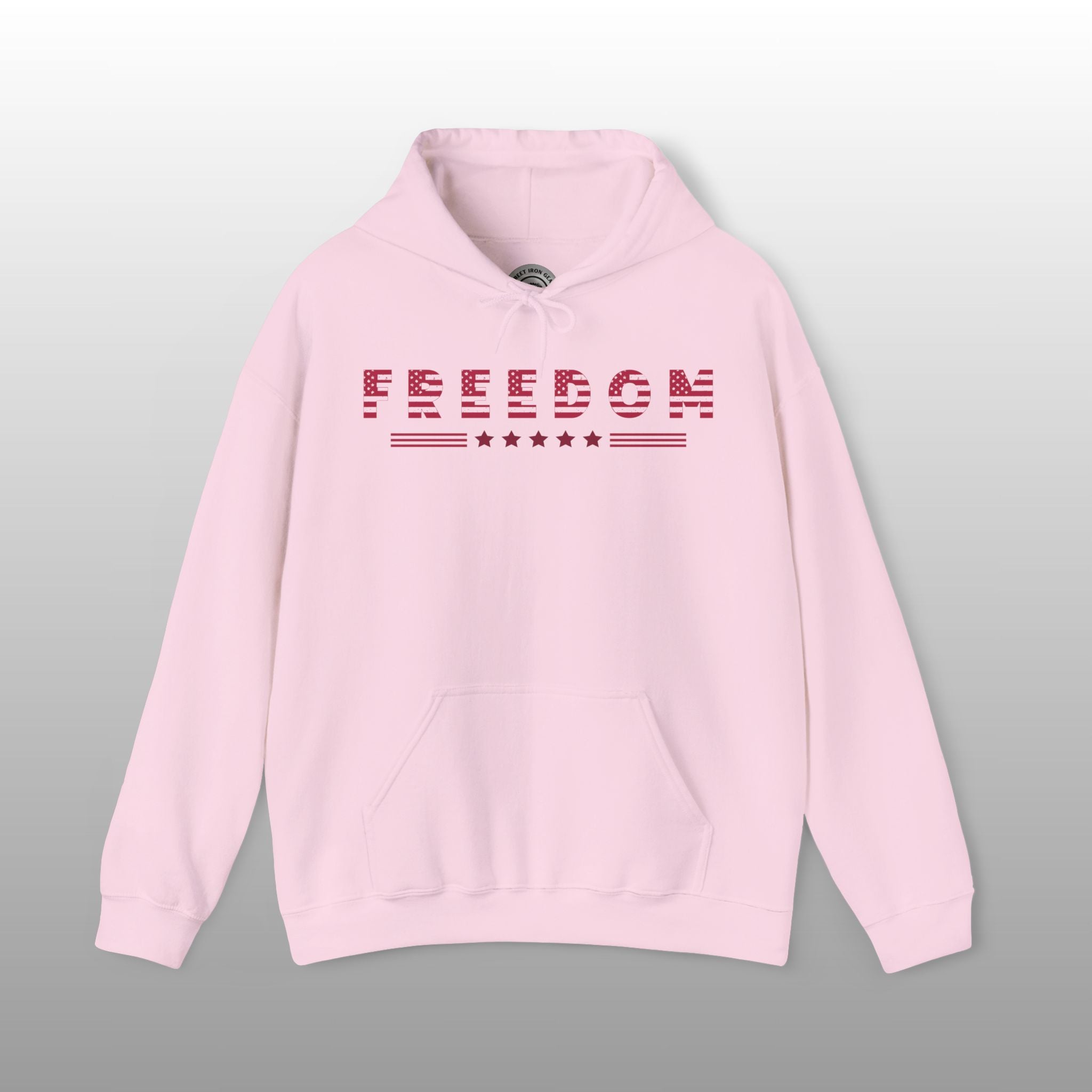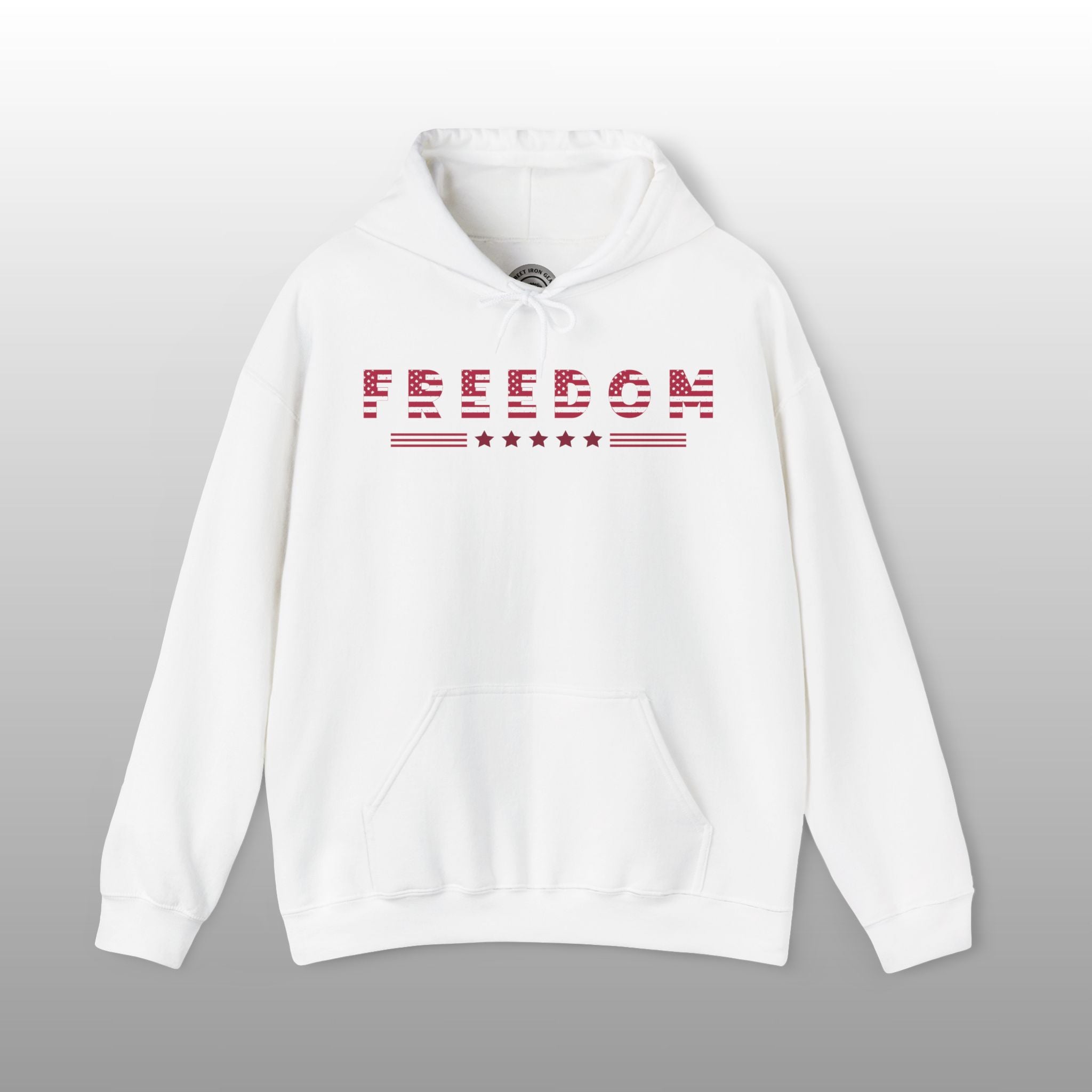 Show your American pride and your love for liberty with this cozy patriotic hooded pullover sweatshirt. The simple yet powerful design features the word 'FREEDOM' displayed prominently in a large, unique block font that incorporates a red, white, and blue stars and stripes pattern within the lettering, making a bold statement. This warm, high-quality fleece hoodie is perfect for men and women and makes an excellent American patriot gift for the Fourth of July, Veteran's Day, or any day you want to celebrate the USA. It's a great piece of pro-America apparel to layer up in during cooler weather and is a must-have addition to any patriotic clothing collection.