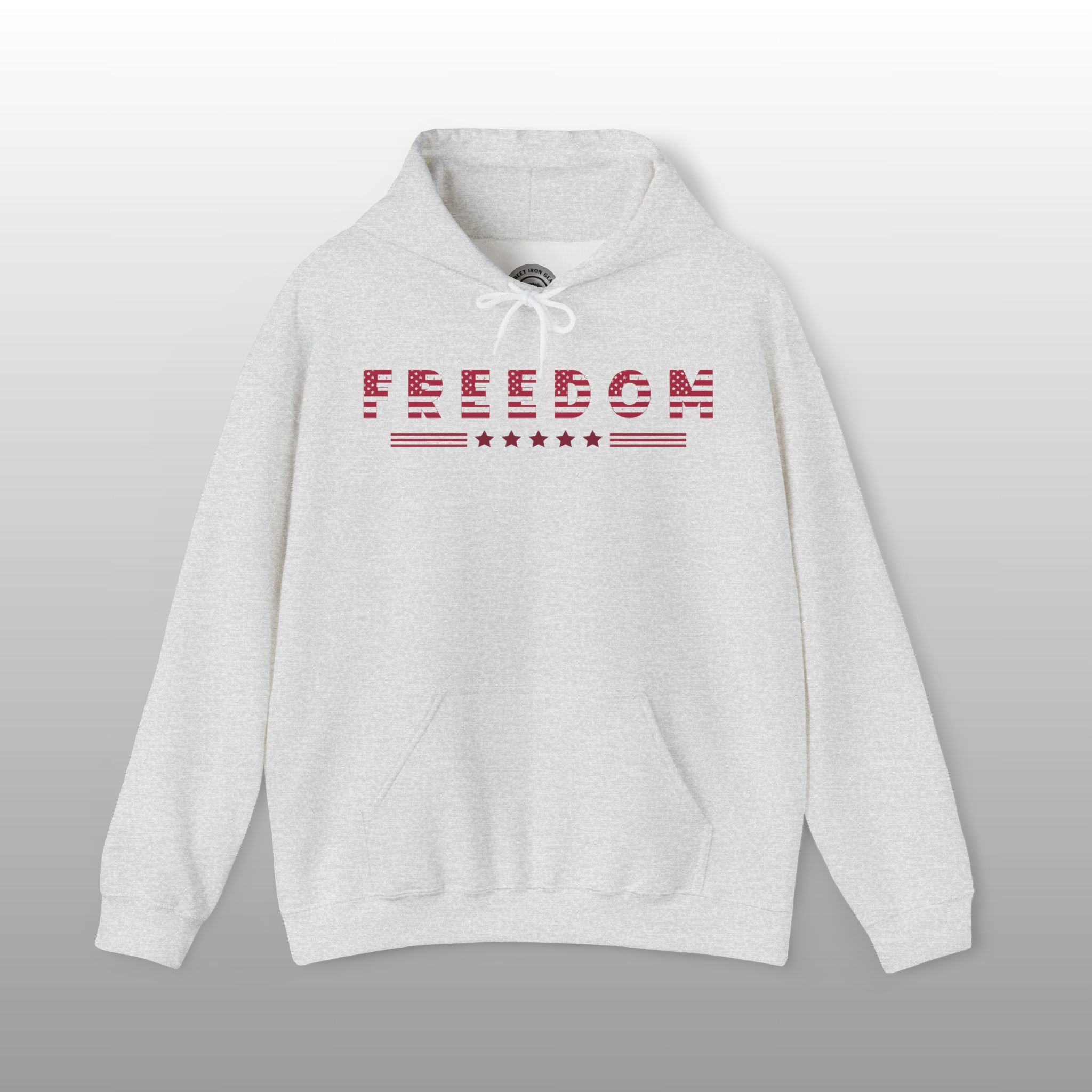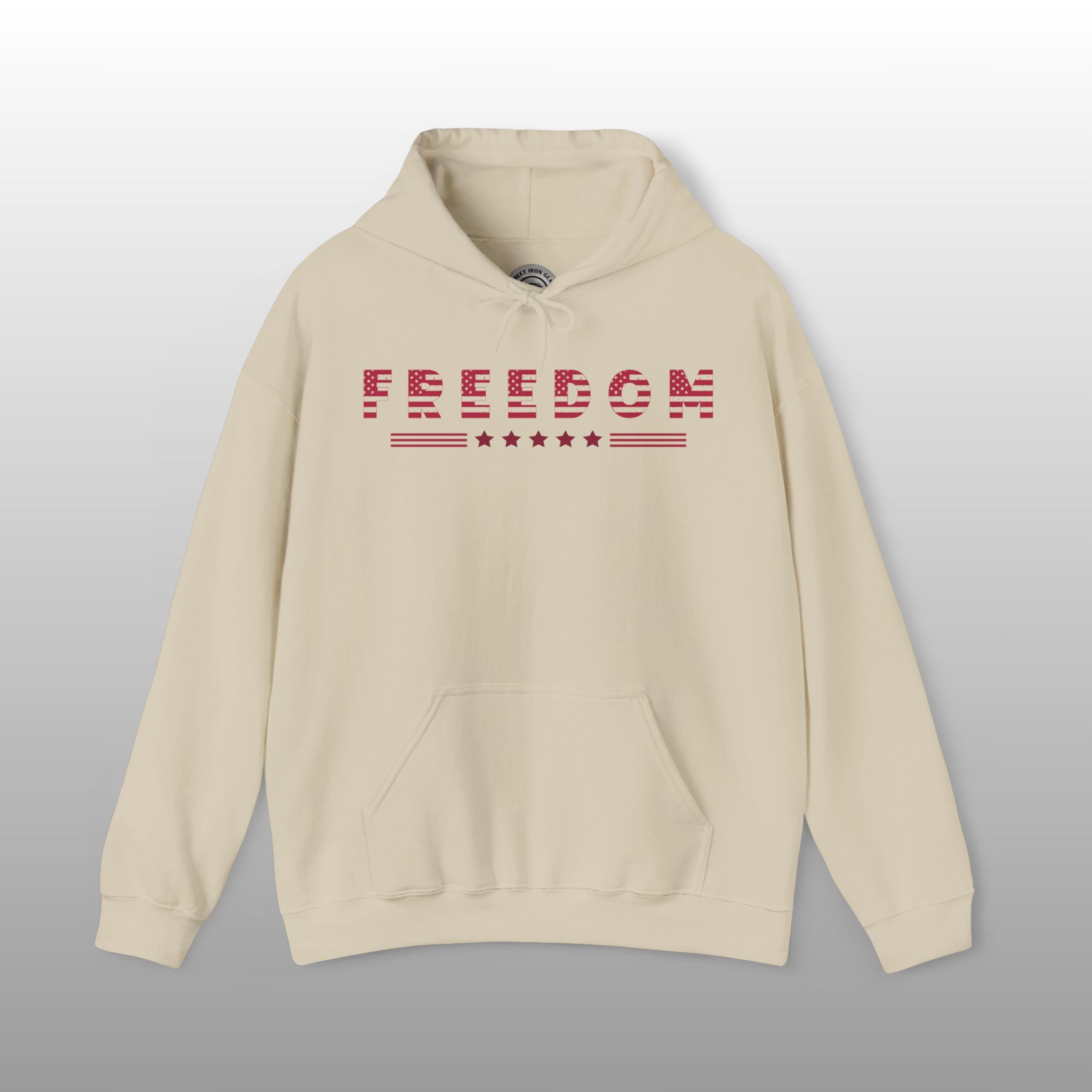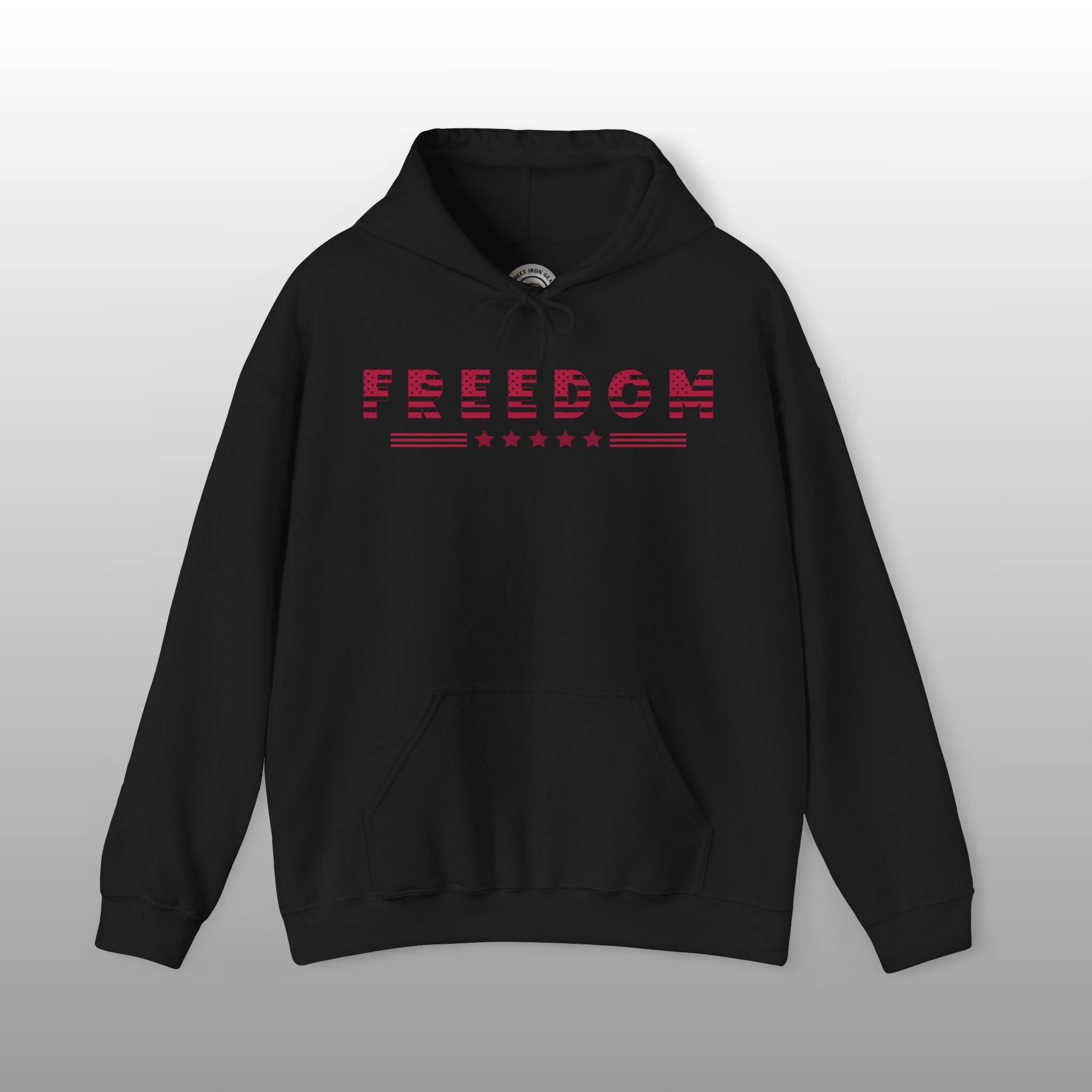 Show your American pride and your love for liberty with this cozy patriotic hooded pullover sweatshirt. The simple yet powerful design features the word 'FREEDOM' displayed prominently in a large, unique block font that incorporates a red, white, and blue stars and stripes pattern within the lettering, making a bold statement. This warm, high-quality fleece hoodie is perfect for men and women and makes an excellent American patriot gift for the Fourth of July, Veteran's Day, or any day you want to celebrate the USA. It's a great piece of pro-America apparel to layer up in during cooler weather and is a must-have addition to any patriotic clothing collection.