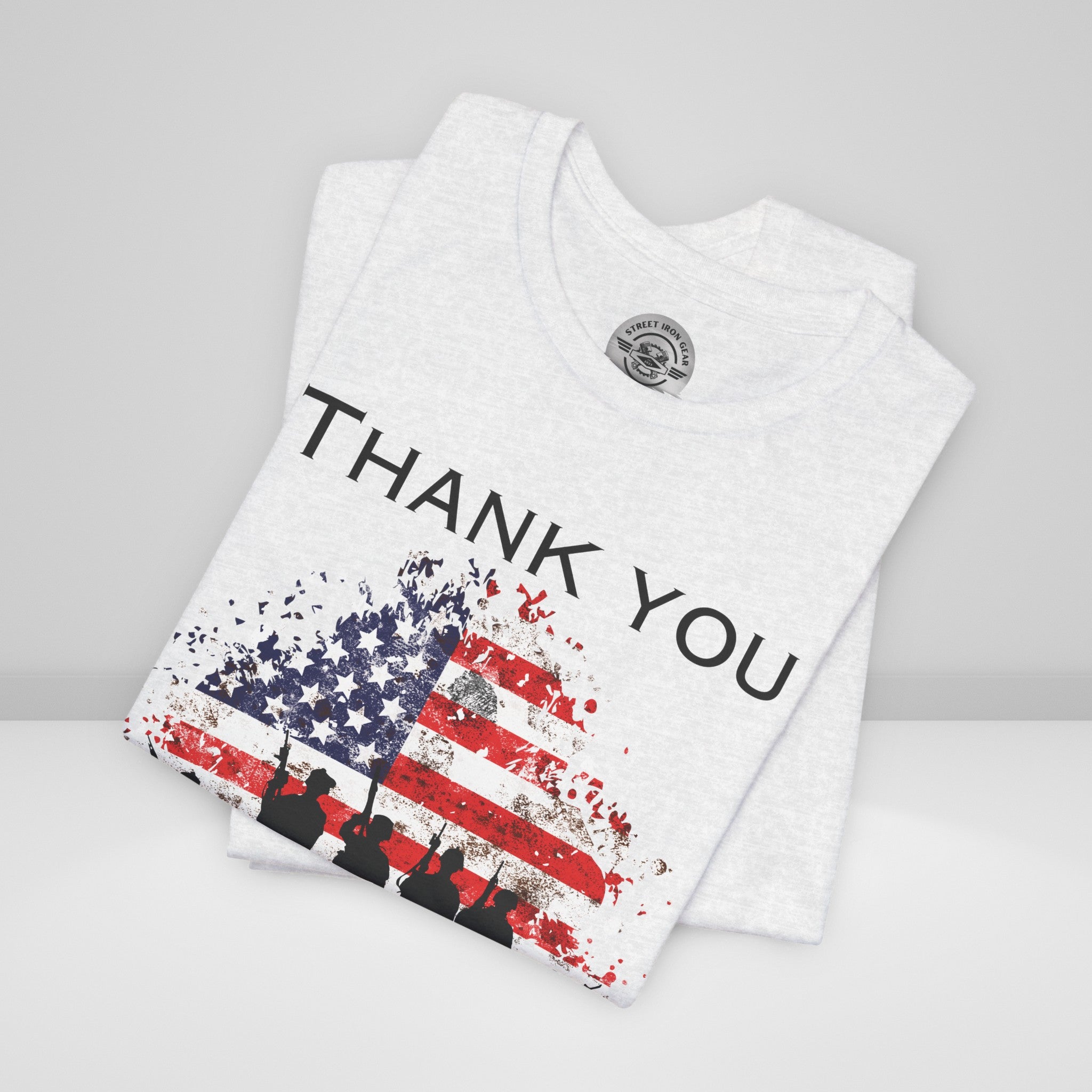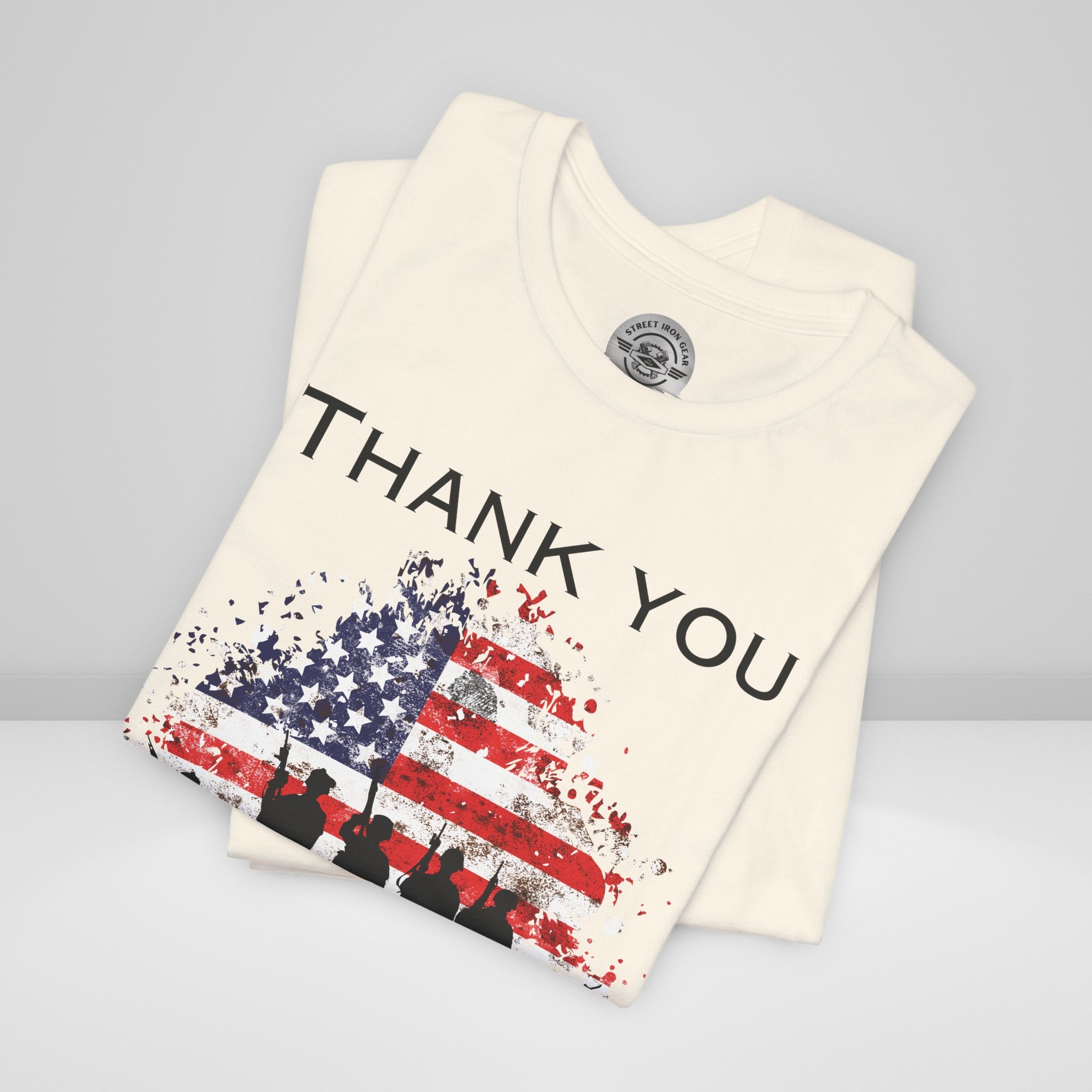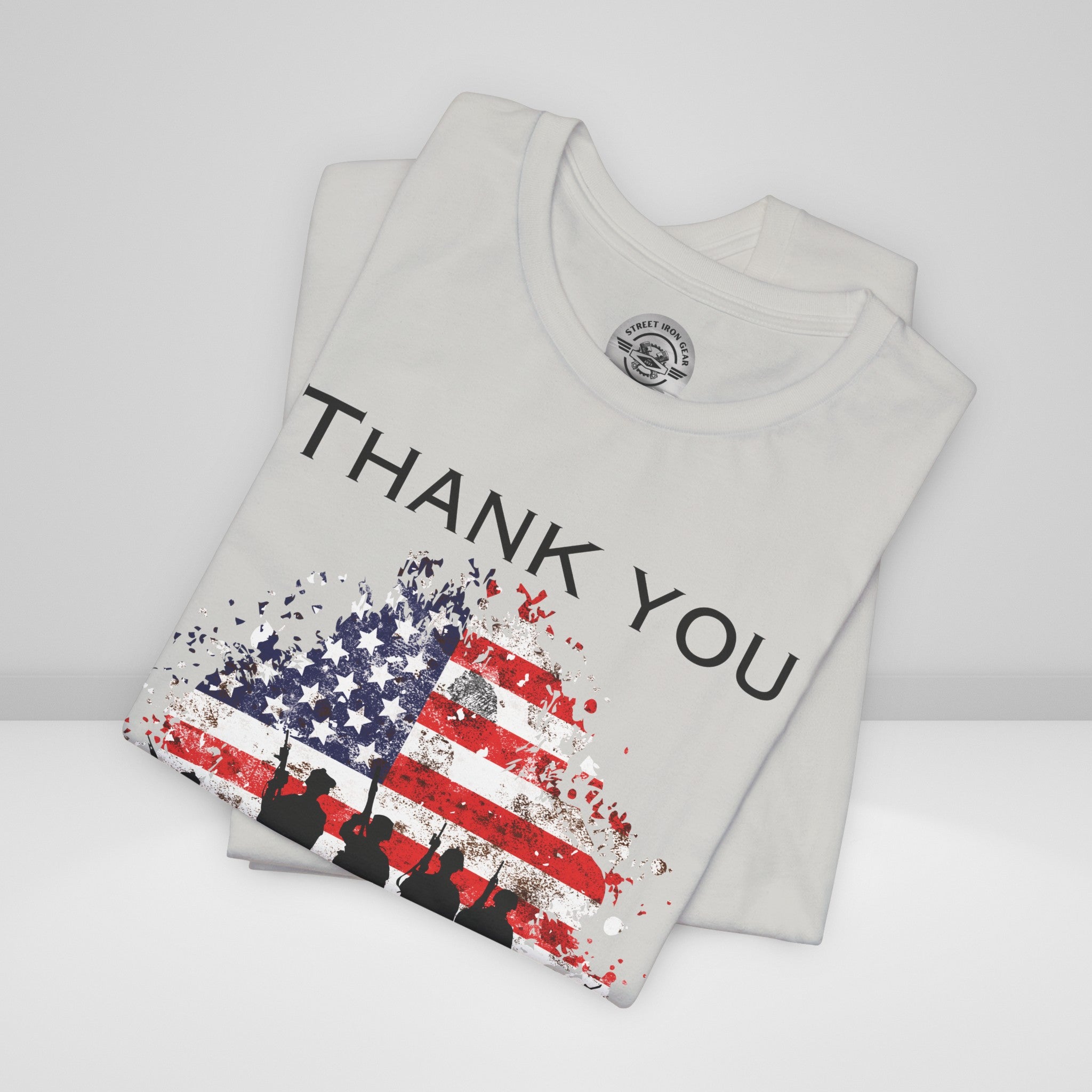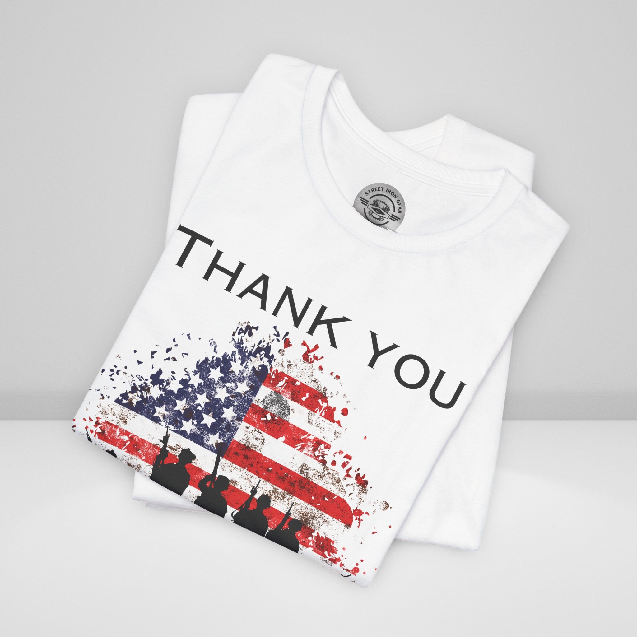 Honor our veterans with our "Thanks Veterans" Patriot Shirt. The front of the shirt features a weathered vintage American flag, with the silhouette of troops lined up on a combat field, paying tribute to the sacrifice and service of our military heroes. Wear it with pride and express your gratitude for their dedication.