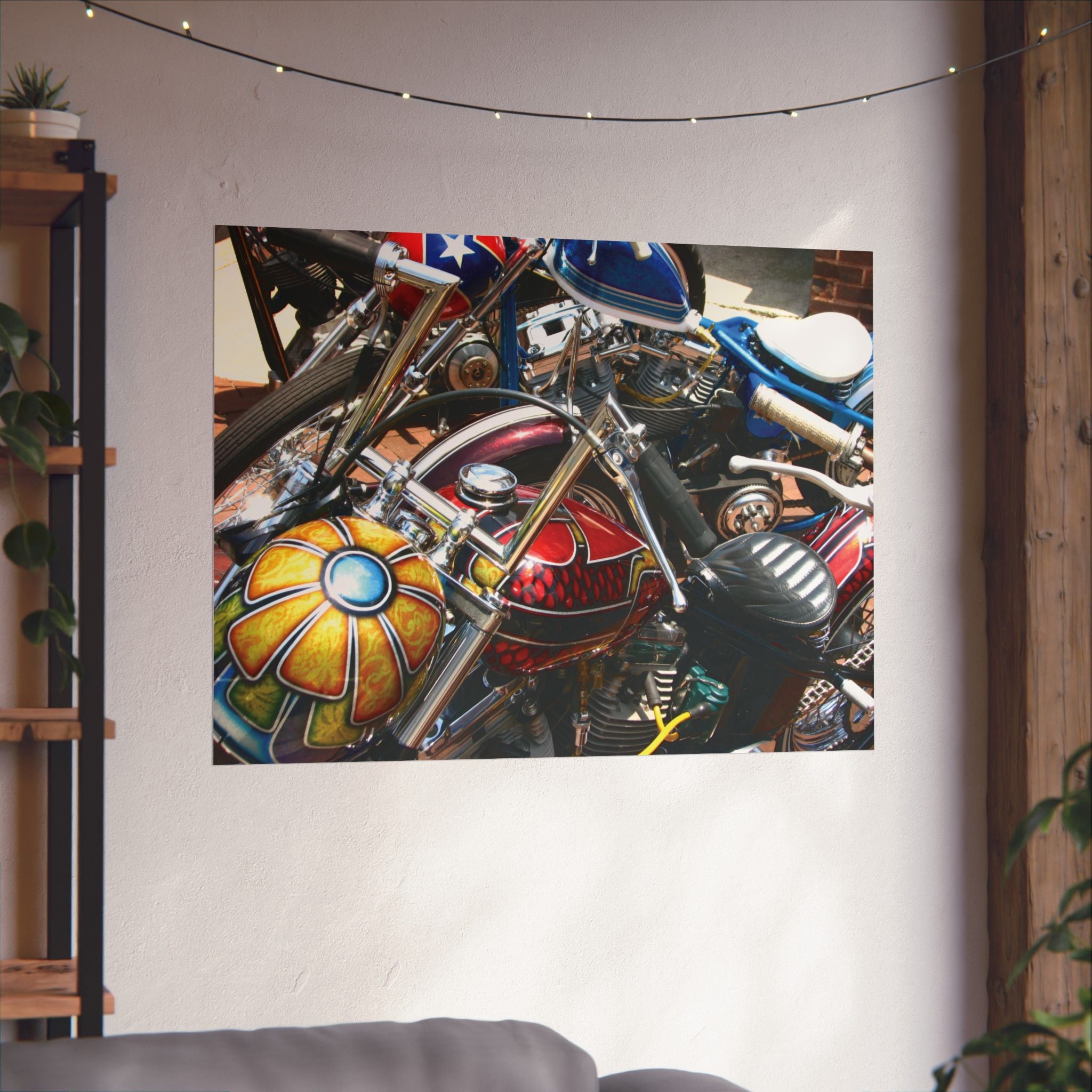Add a bold statement to your space with this Chopper Motorcycle Print Poster, featuring a vibrant, retro-inspired close-up of parked chopper motorcycles in funky, eye-catching colors. Perfect for motorcycle enthusiasts, garage decor, or anyone who loves classic biker culture, this high-quality print brings the free-spirited energy of custom choppers right to your walls. Whether you're decking out a man cave, home office, or motorcycle shop, this poster is a must-have for those who appreciate vintage motorcycle art and chopper lifestyle.