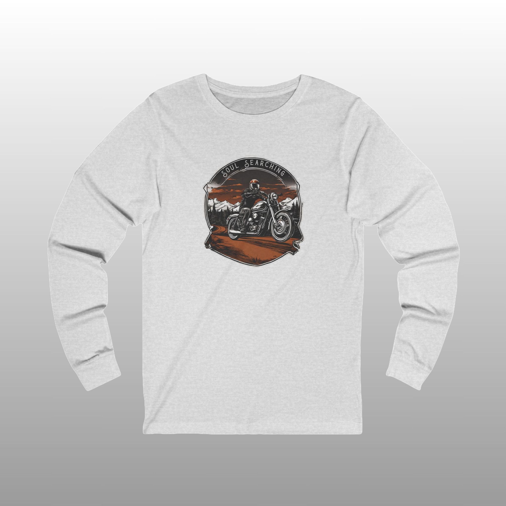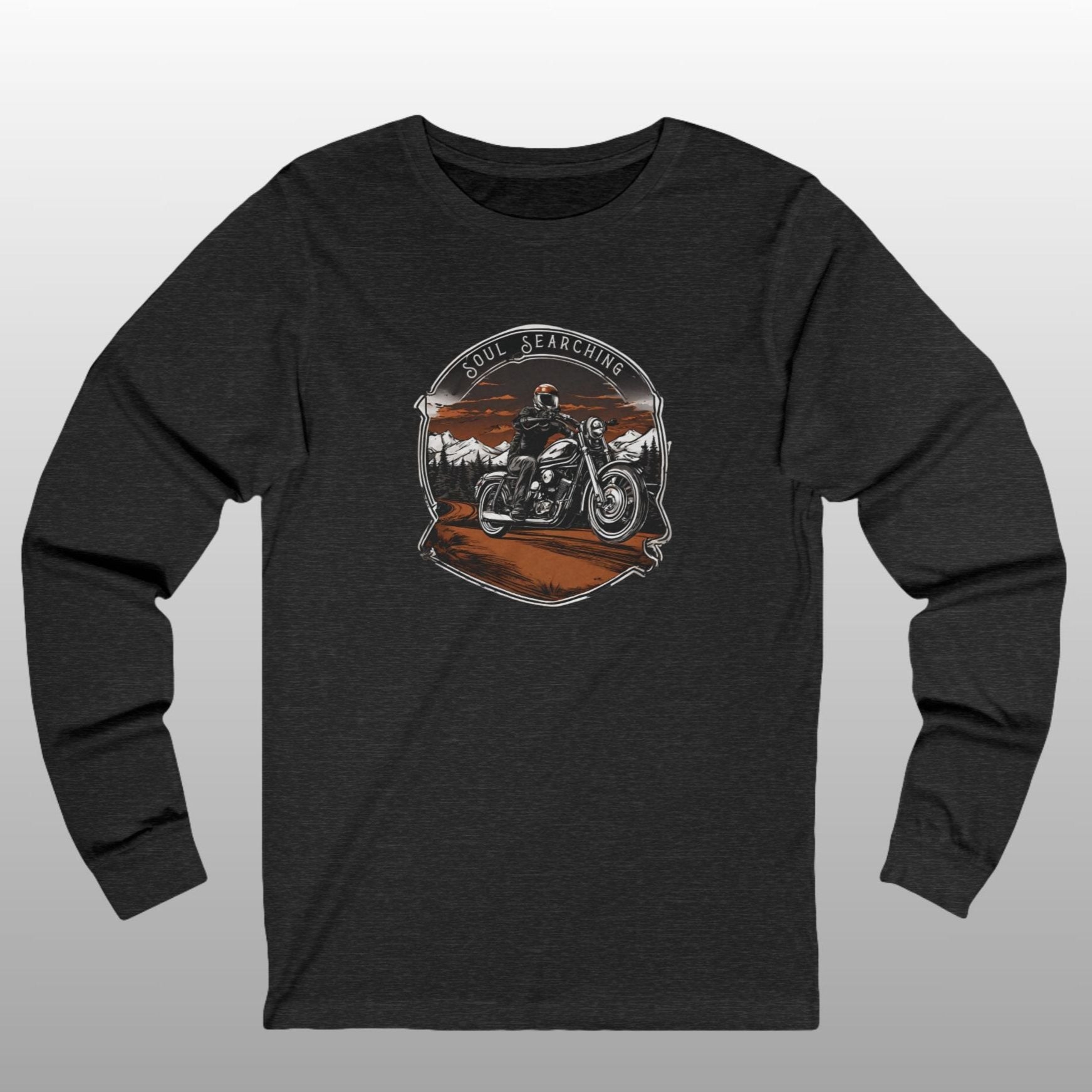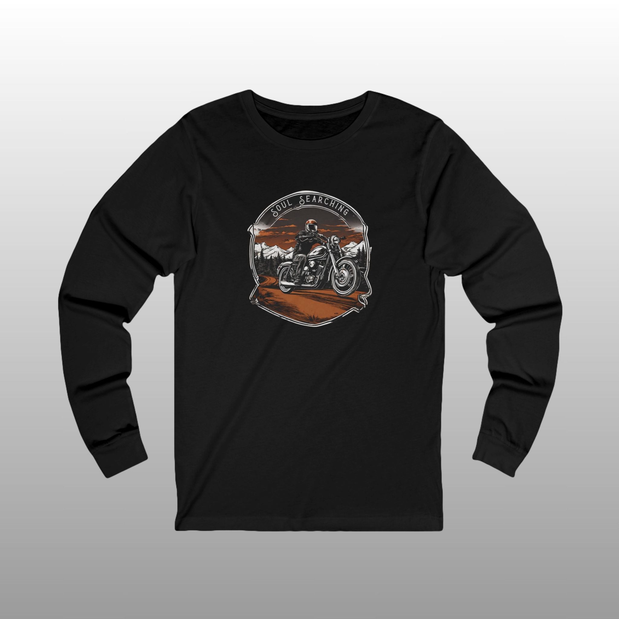 Embark on a journey of self-discovery with our "Soul Searching" Motorcycle T-shirt. Featuring a biker on a cruiser motorcycle, set against the backdrop of the sun-drenched open road, this tee embodies the quest for inner truths and the thrill of the ride.