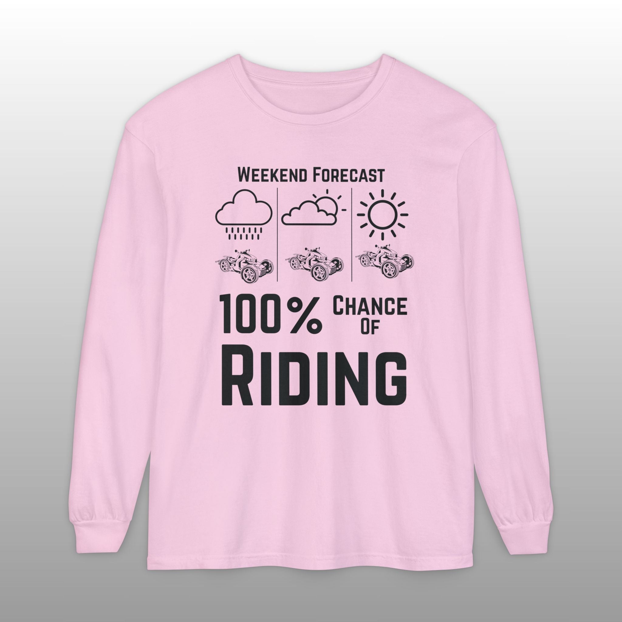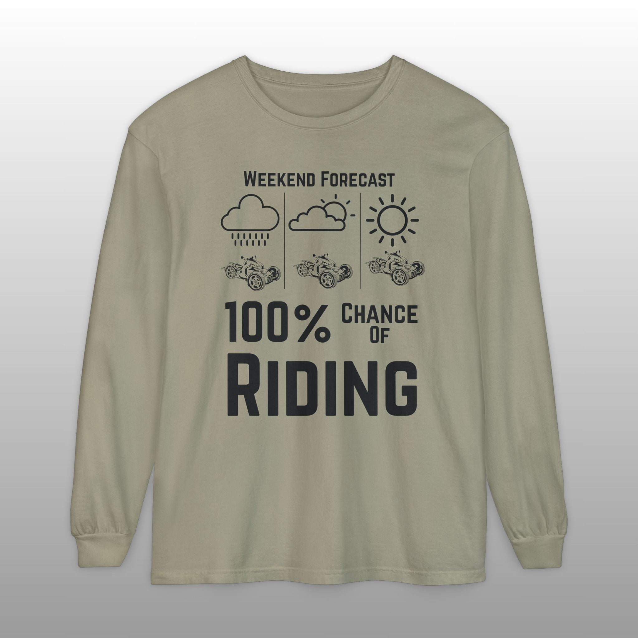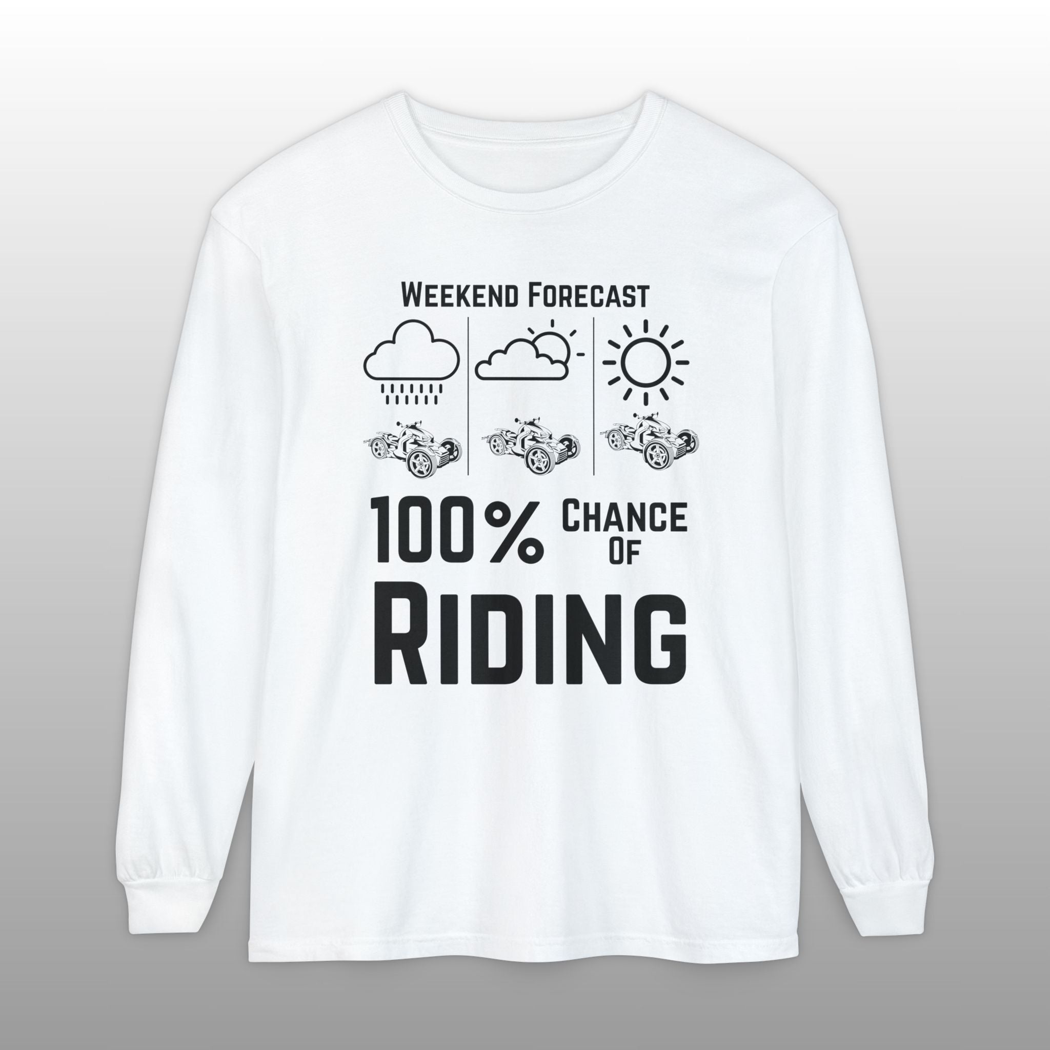 For every rider whose mind is always on the road, our Can-Am Ryker long-sleeve tee is the perfect fit. This comfortable Comfort Colors shirt features a clever, monochrome graphic that speaks directly to the motorcycle enthusiast's heart. The design presents a witty take on a weather report, with a bold Ryker silhouette at the center and various weather symbols surrounding it. The shirt's message is loud and clear: "Weekend Forecast: 100% Chance of Riding." Made from the soft, garment-dyed cotton that Comfort Colors is famous for, this tee has a relaxed fit and a vintage feel that gets even better with time. It's a great layering piece for cooler days or a go-to for casual wear. This is a perfect motorcycle rider gift and a must-have for any Can-Am Ryker owner.