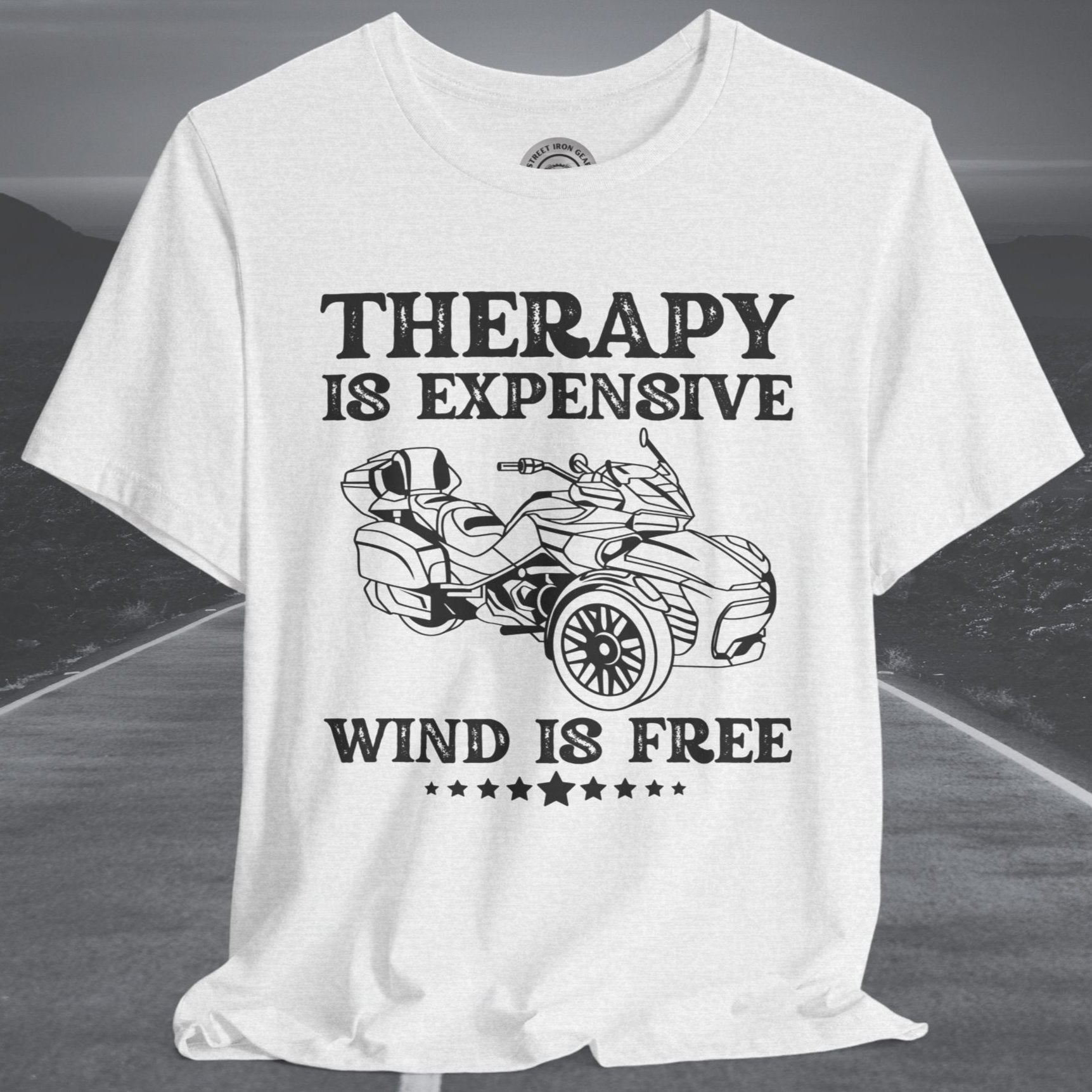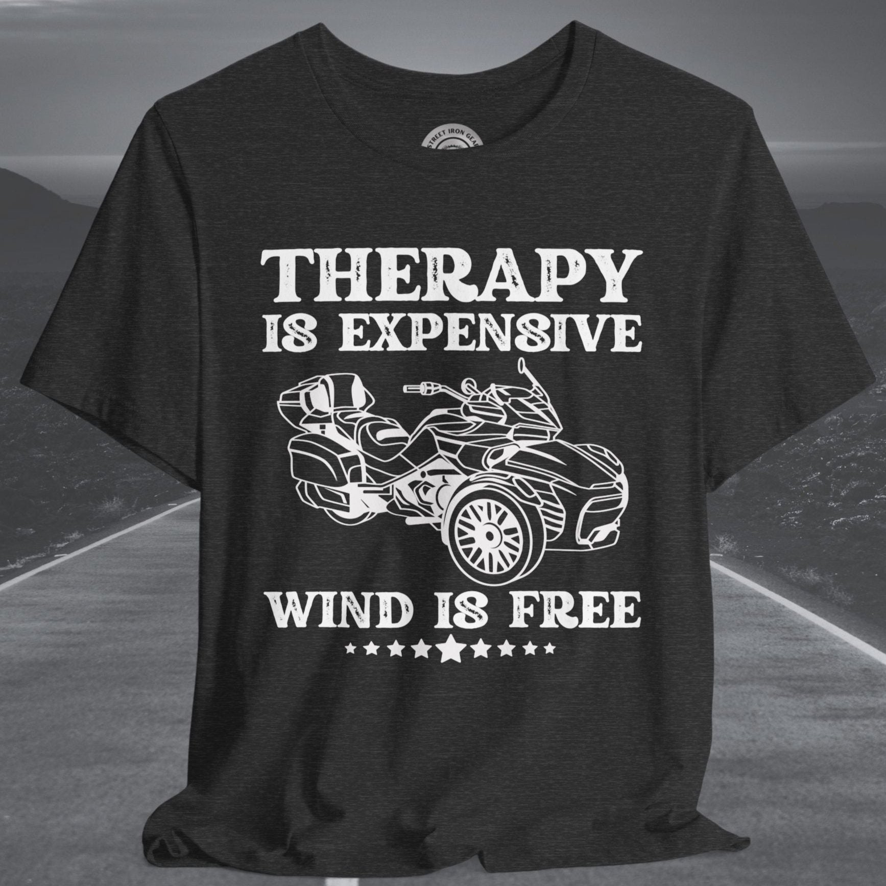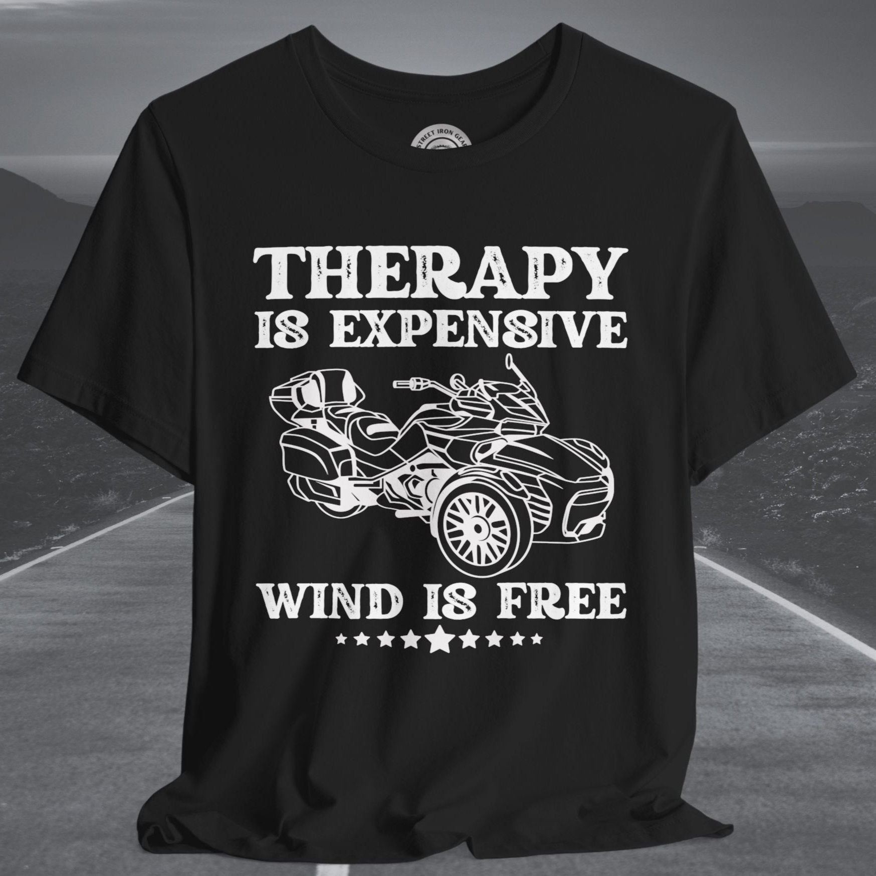 Experience the freedom of the open road with our Can-Am Spyder or Ryker themed T-shirt that reads "Therapy is Expensive. Wind is Free." This unique tee features a detailed Spyder F3 Limited graphic, perfect for fans of the iconic ride. Made for comfort and style, this shirt is ideal for any Can-Am enthusiast, with an option to customize the graphic upon request. Celebrate your passion for adventure and showcase your love for the Spyder!