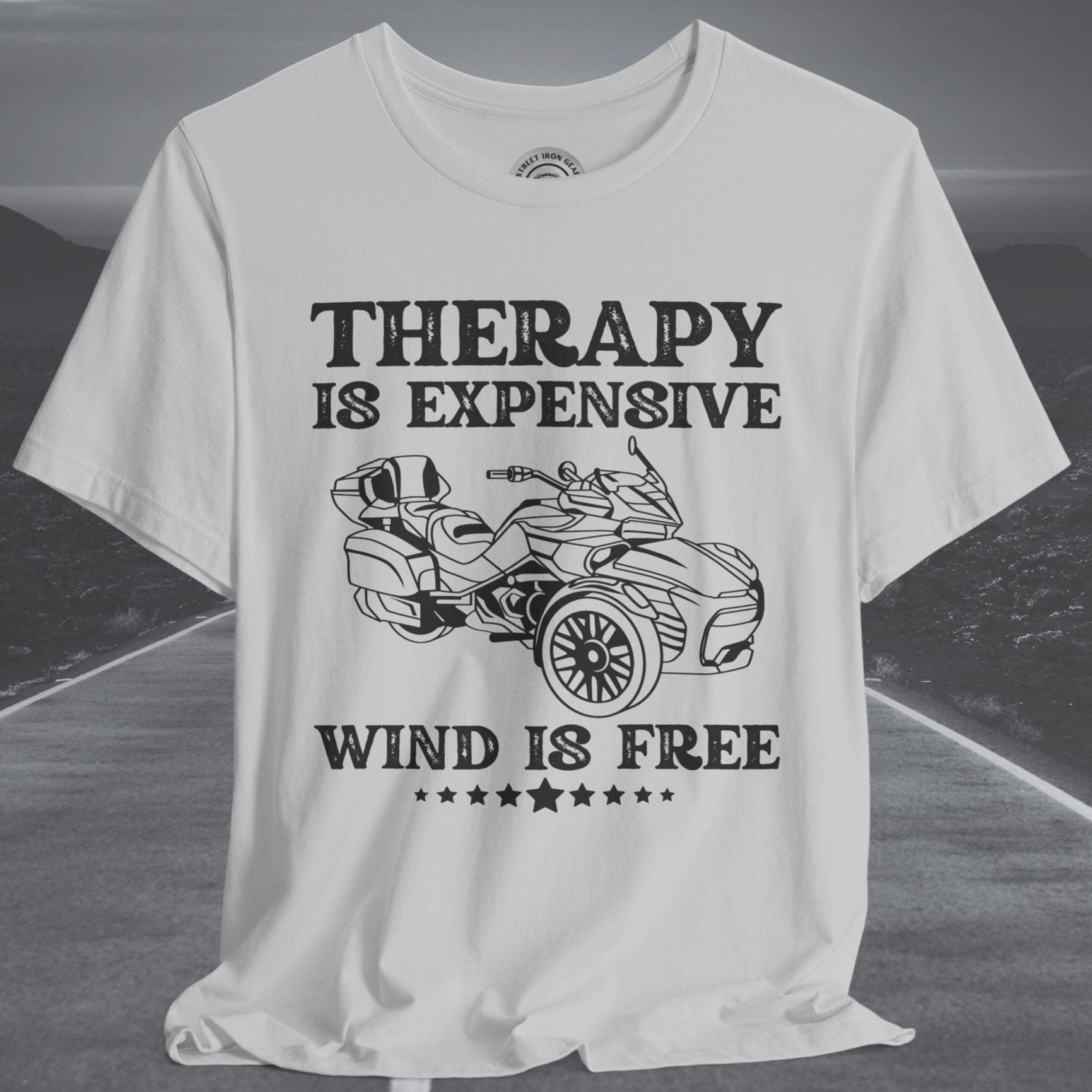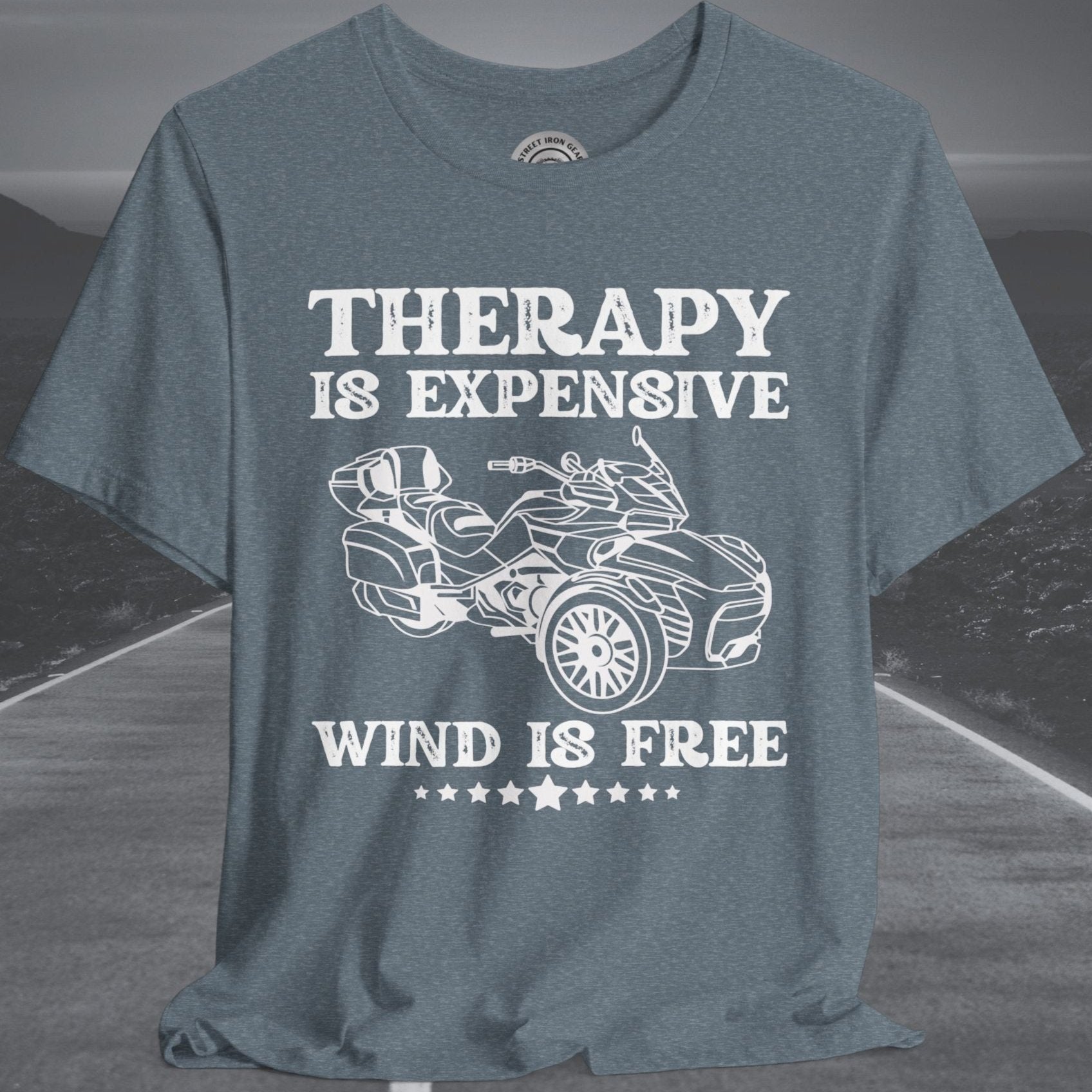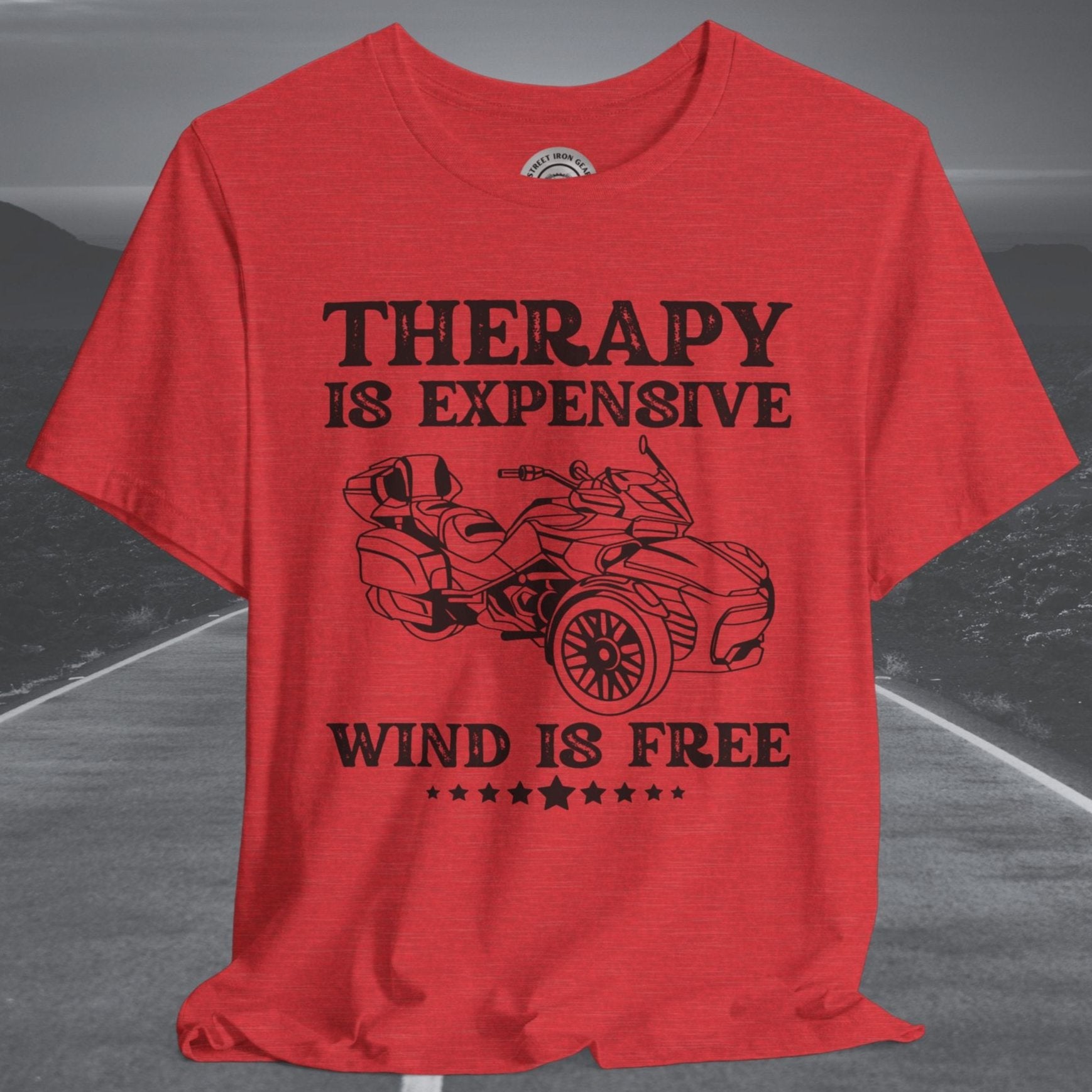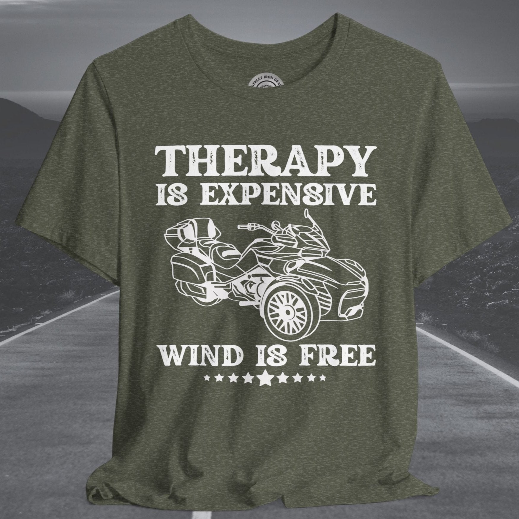 Experience the freedom of the open road with our Can-Am Spyder or Ryker themed T-shirt that reads "Therapy is Expensive. Wind is Free." This unique tee features a detailed Spyder F3 Limited graphic, perfect for fans of the iconic ride. Made for comfort and style, this shirt is ideal for any Can-Am enthusiast, with an option to customize the graphic upon request. Celebrate your passion for adventure and showcase your love for the Spyder!
