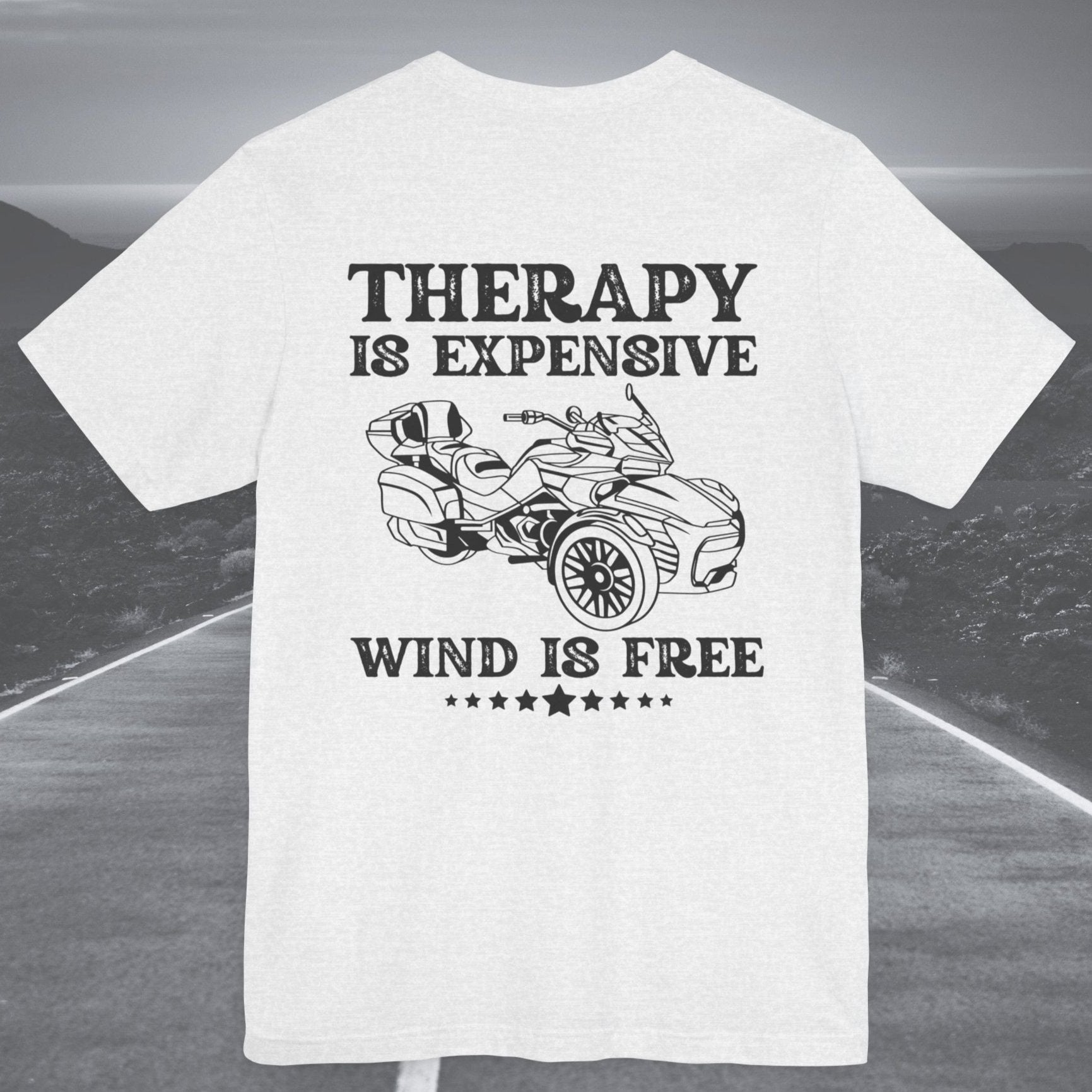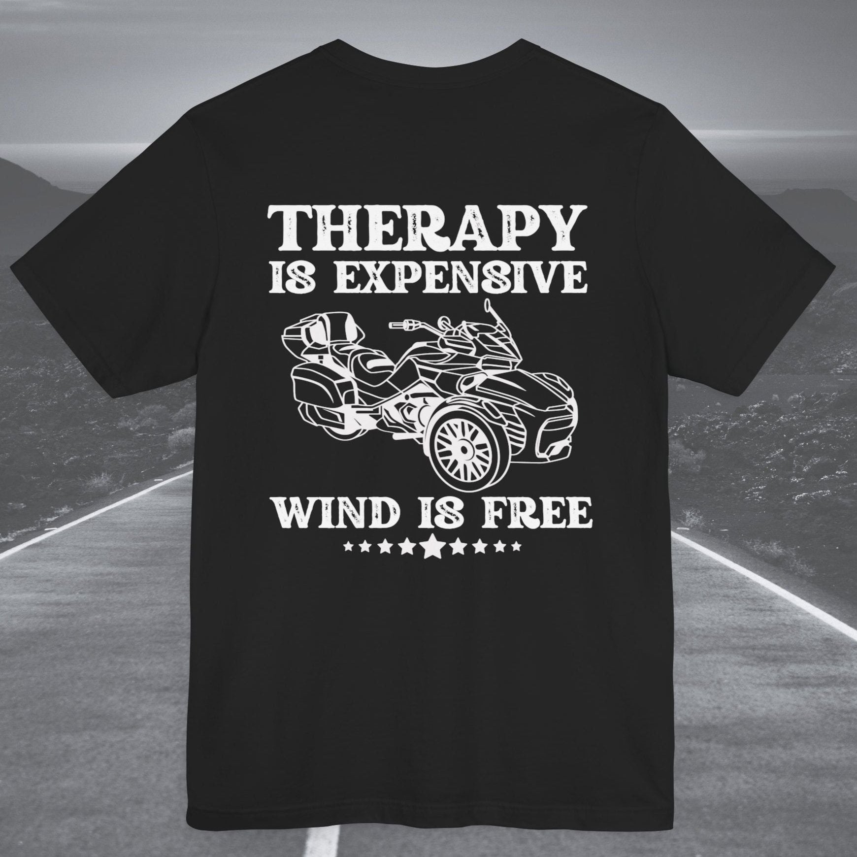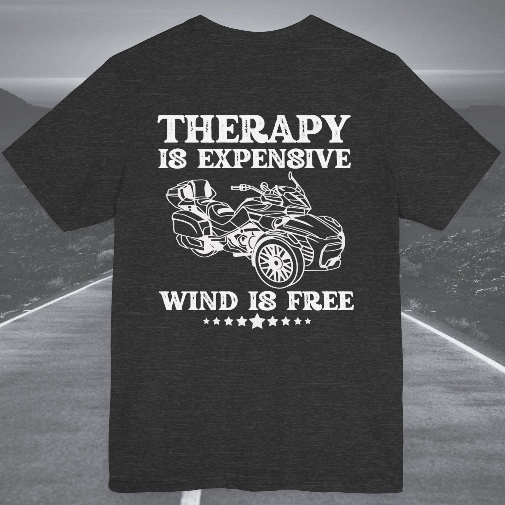 Experience the freedom of the open road with our Can-Am Spyder or Ryker themed T-shirt that reads "Therapy is Expensive. Wind is Free." This unique tee features a detailed Spyder F3 Limited graphic, perfect for fans of the iconic ride. Made for comfort and style, this shirt is ideal for any Can-Am enthusiast, with an option to customize the graphic upon request. Celebrate your passion for adventure and showcase your love for the Spyder!