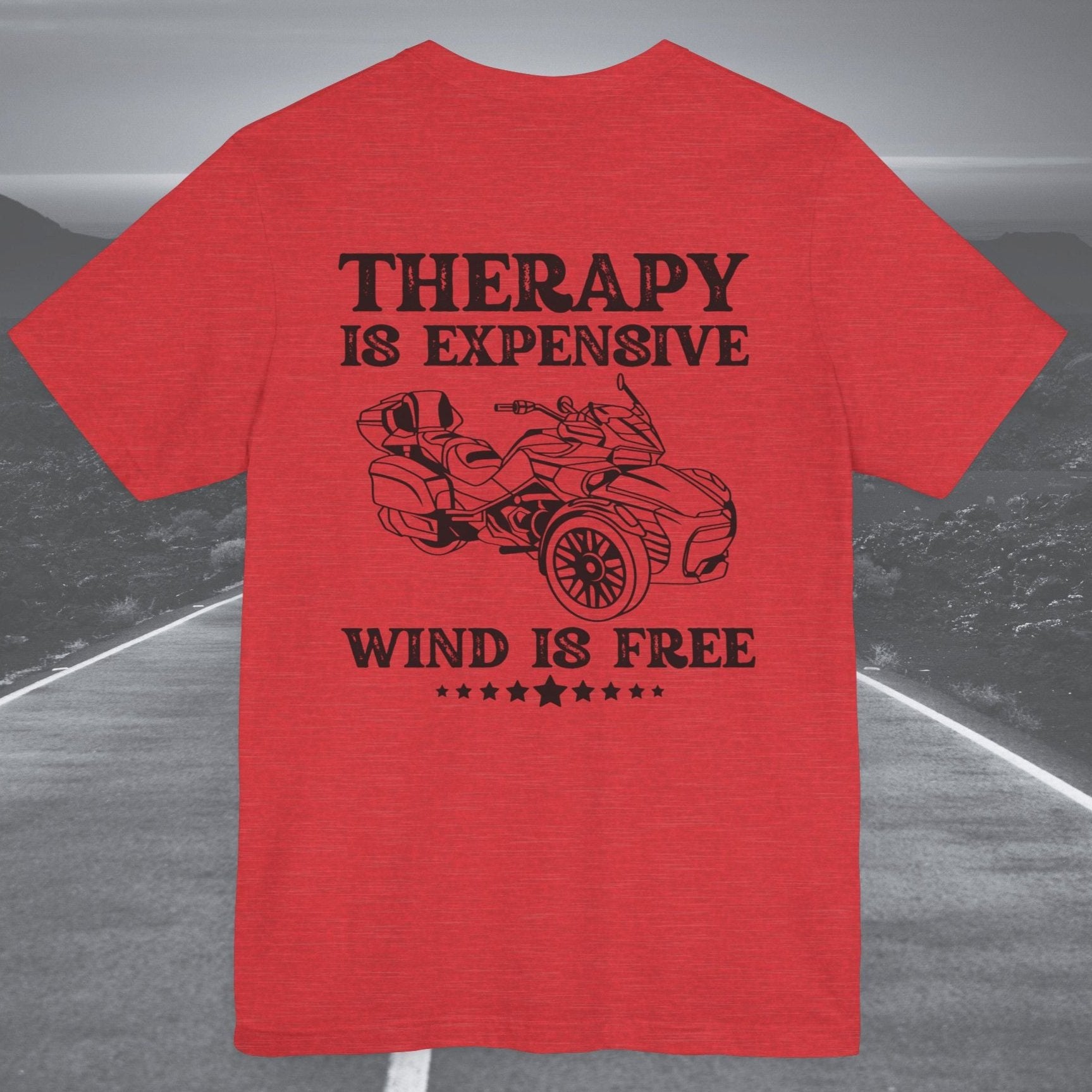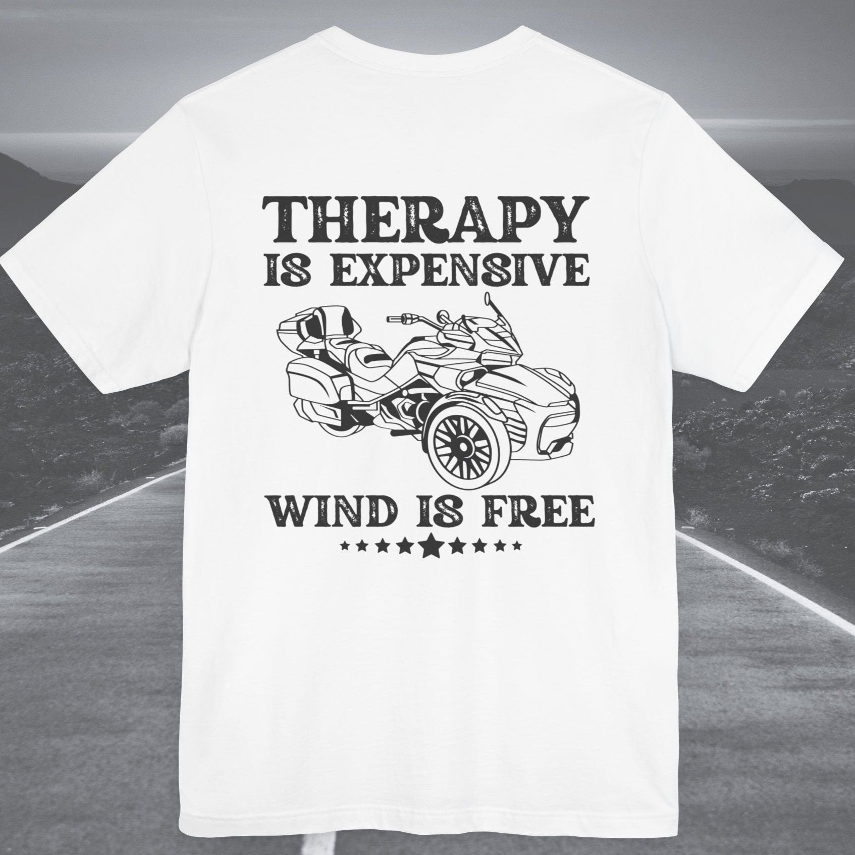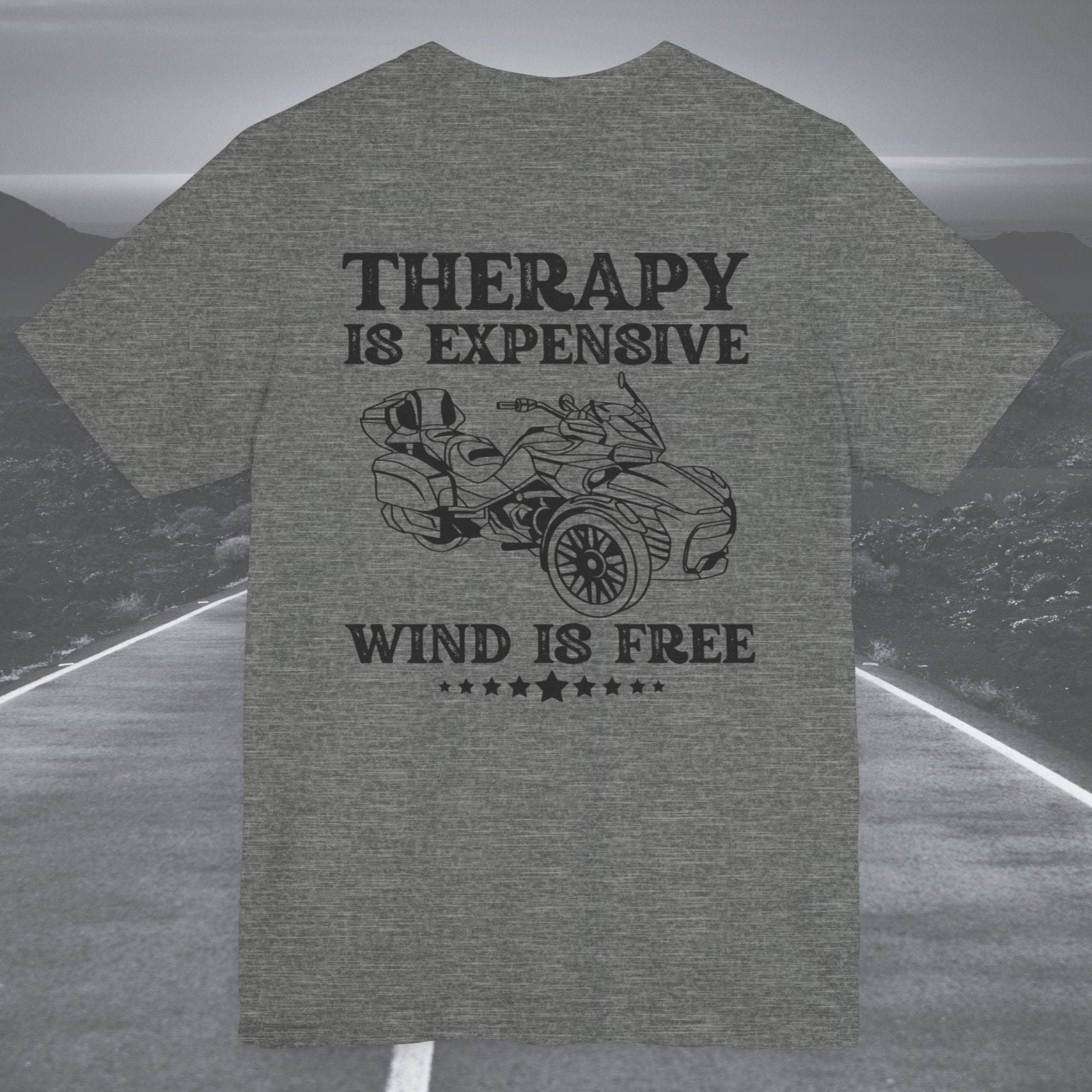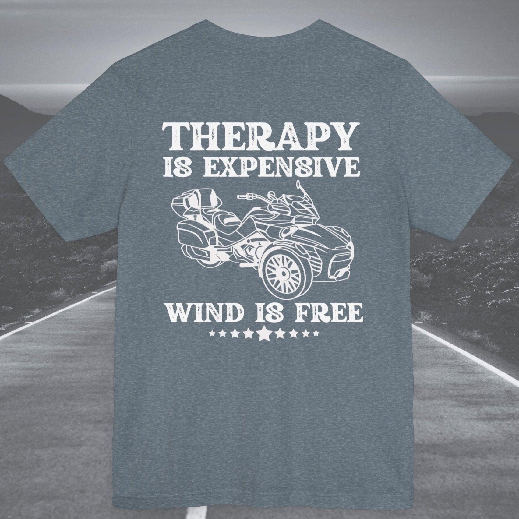 Experience the freedom of the open road with our Can-Am Spyder or Ryker themed T-shirt that reads "Therapy is Expensive. Wind is Free." This unique tee features a detailed Spyder F3 Limited graphic, perfect for fans of the iconic ride. Made for comfort and style, this shirt is ideal for any Can-Am enthusiast, with an option to customize the graphic upon request. Celebrate your passion for adventure and showcase your love for the Spyder!