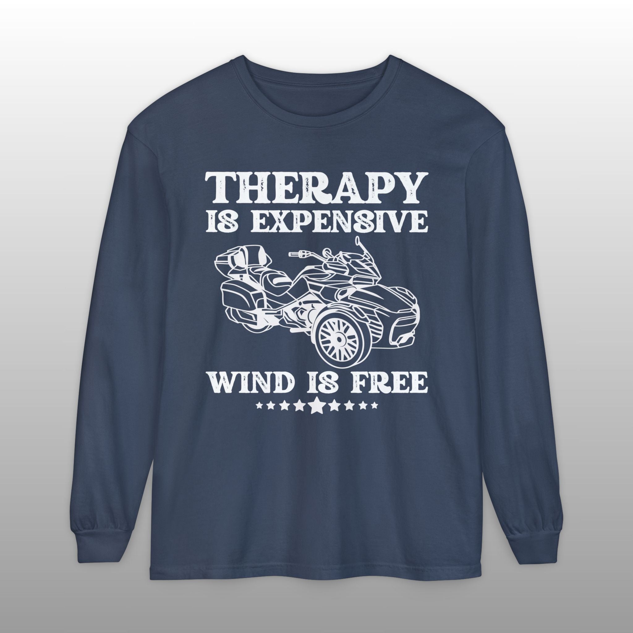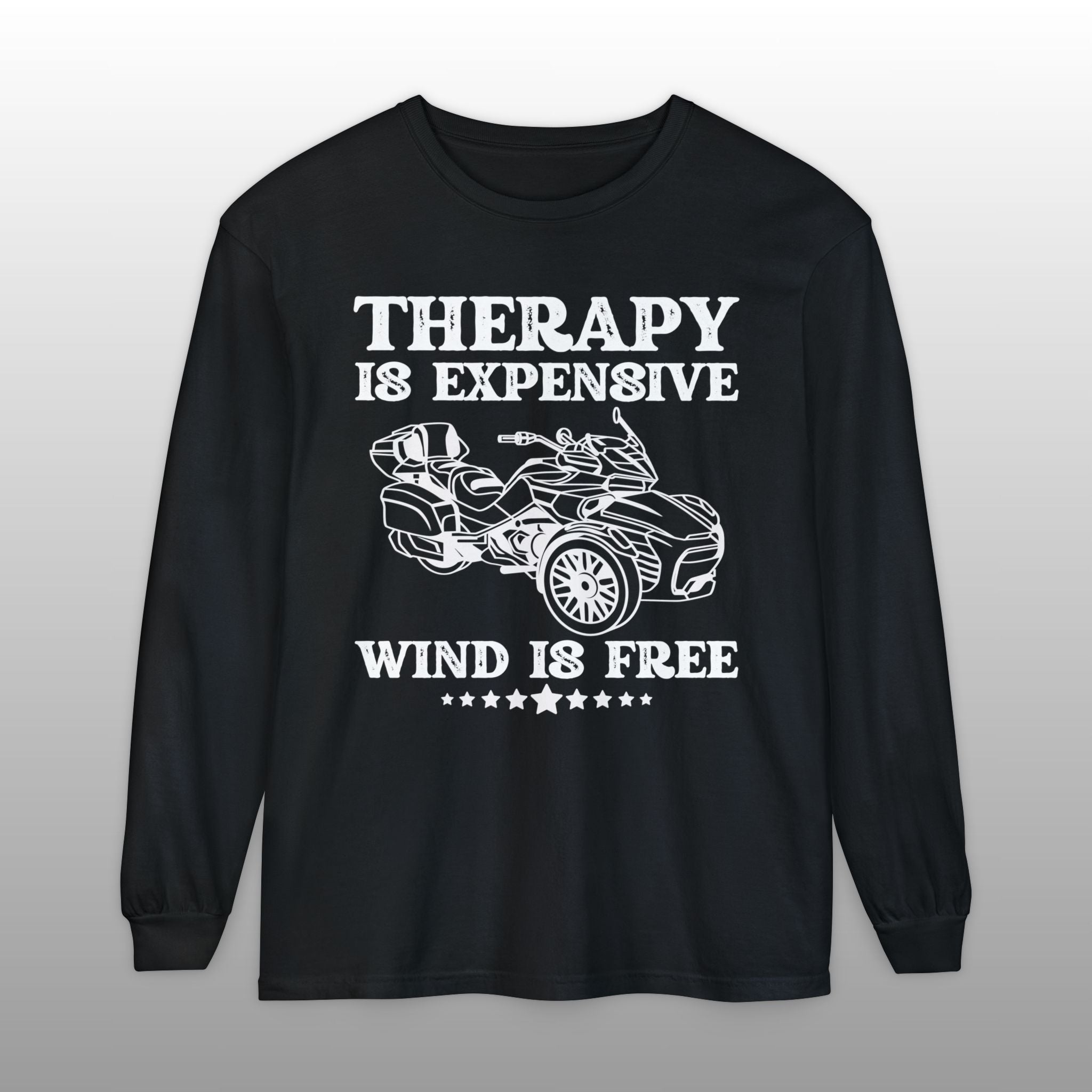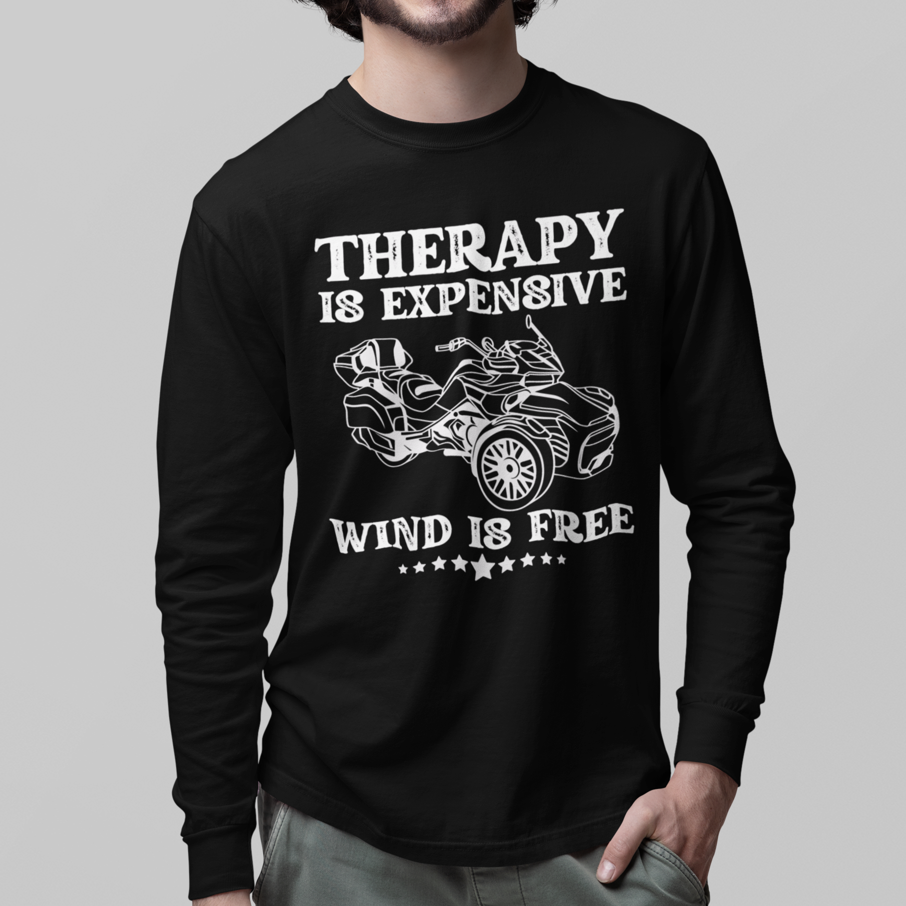 The shirt features the relatable slogan: "Therapy is Expensive. Wind is Free," making a statement about where you find your true peace. The graphic includes a detailed image of the iconic Spyder F3 Limited (or an alternate Can-Am graphic on request), making it instantly recognizable to fellow enthusiasts.