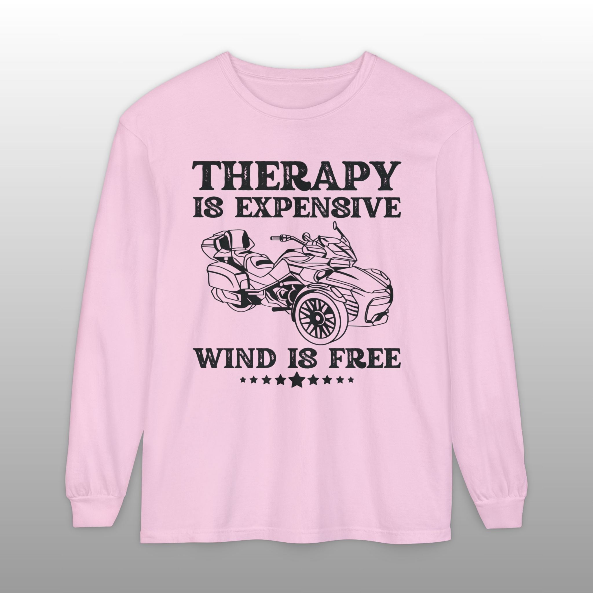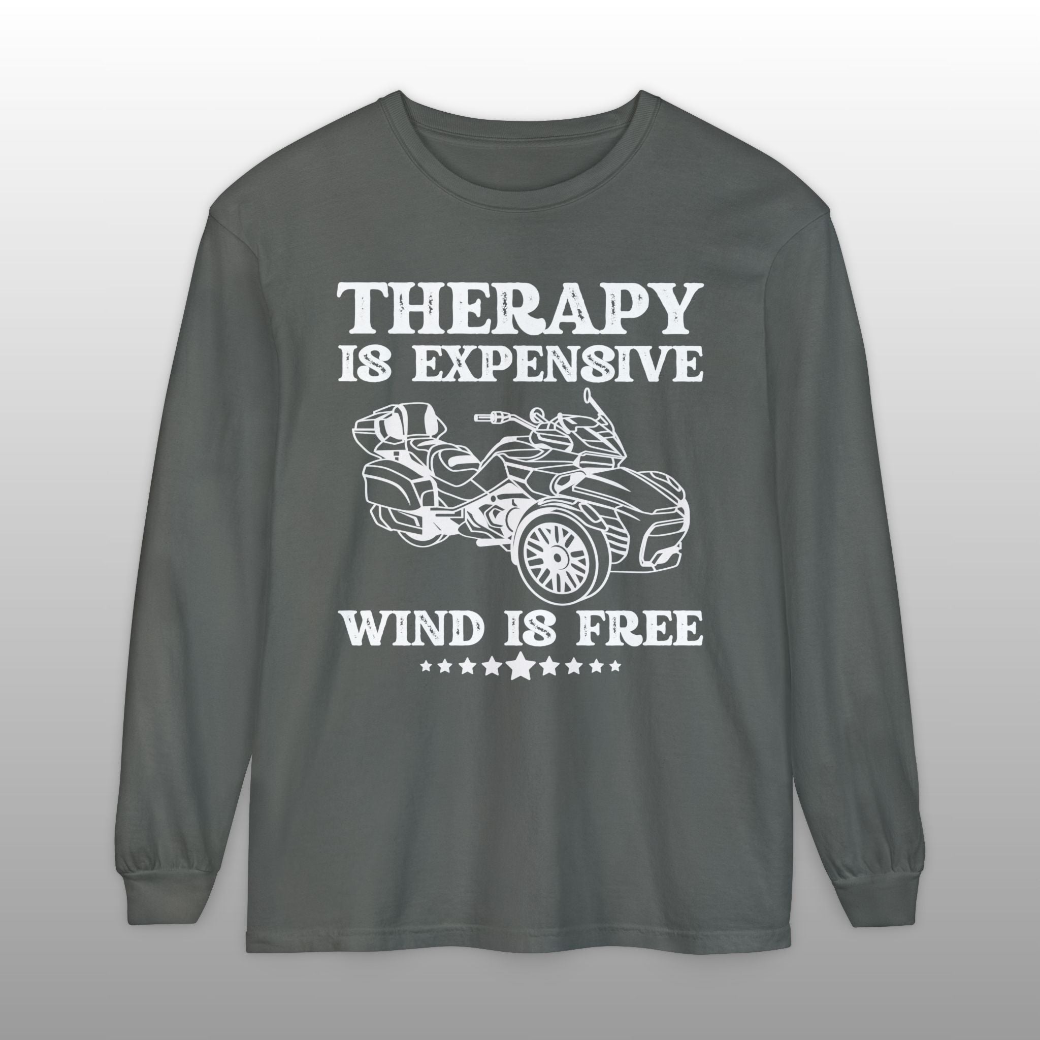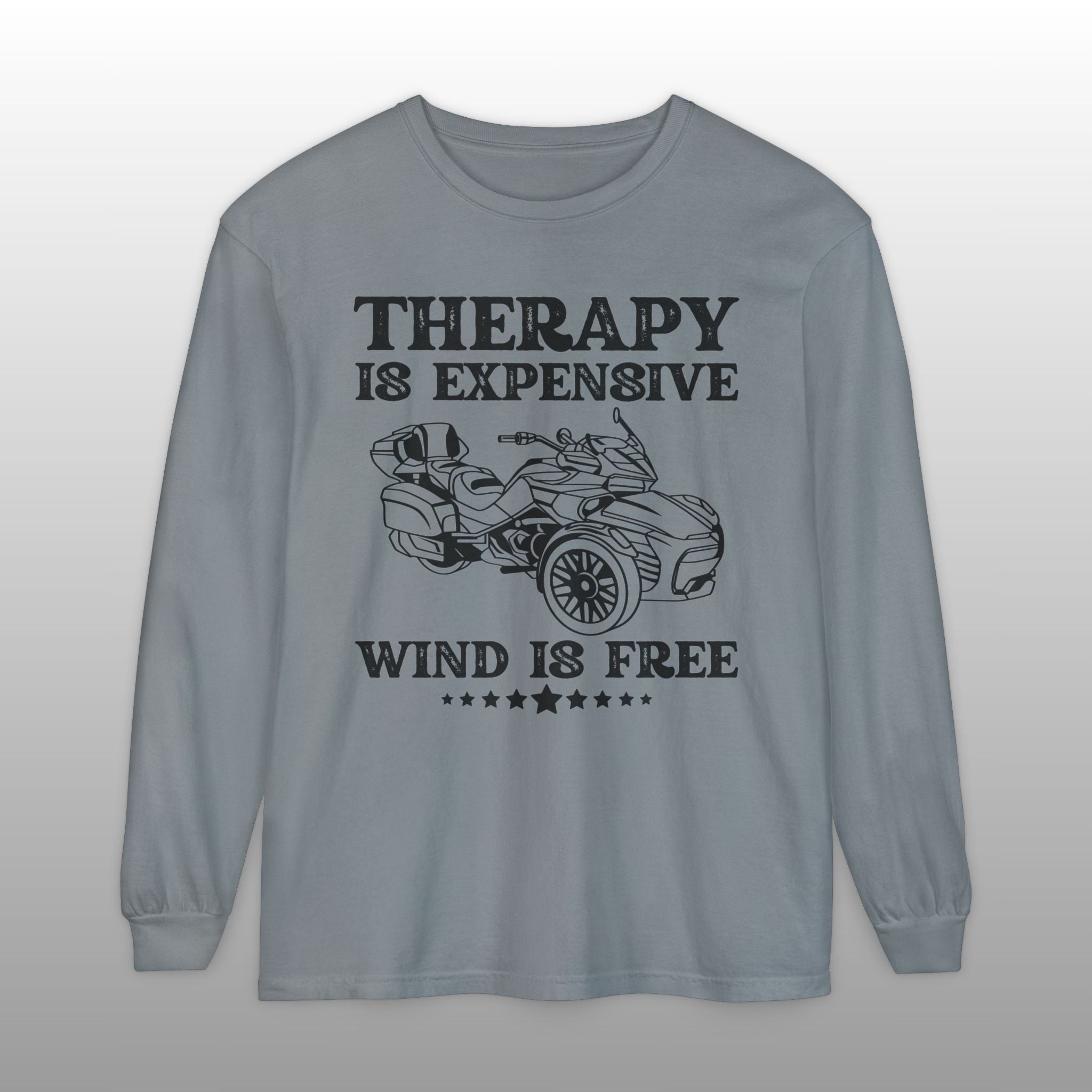 The shirt features the relatable slogan: "Therapy is Expensive. Wind is Free," making a statement about where you find your true peace. The graphic includes a detailed image of the iconic Spyder F3 Limited (or an alternate Can-Am graphic on request), making it instantly recognizable to fellow enthusiasts.