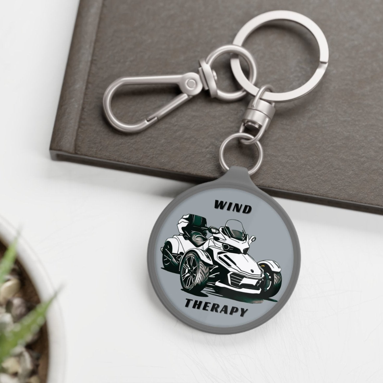 Keep your keys secure with our Can-Am Spyder Acrylic Keychain, featuring a sleek black and white line drawing of a Spyder and the inspiring phrase "Wind Therapy" on a gray background. Designed to match the look of your ride, this keychain is a must-have accessory for Can-Am enthusiasts and makes a perfect gift. Lightweight yet durable, it's ideal for any fan of the open road who wants to carry a piece of their passion wherever they go.
