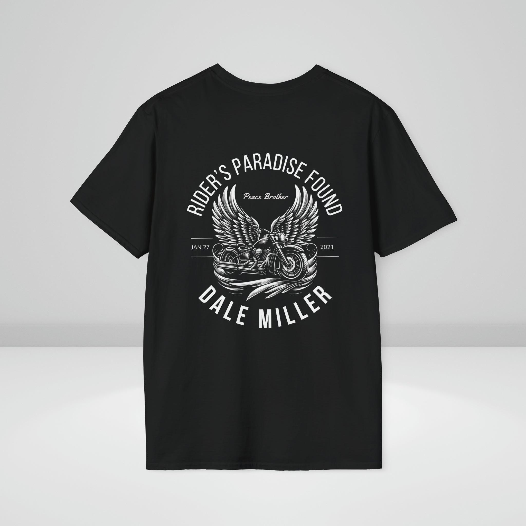 This T-shirt is adorned with a striking black and white graphic of a traditional cruiser motorcycle embraced by angel wings, crafted specifically for biker memorials or poker run events. It offers customization options for adding a heartfelt quote, the recipient's names, and a significant date, making it a deeply personal commemorative piece. Designed to be sold by motorcycle clubs at large events, this T-shirt not only serves as a symbol of remembrance but also as a fundraising tool to support families affected by loss, enhancing its value within the biking community.
