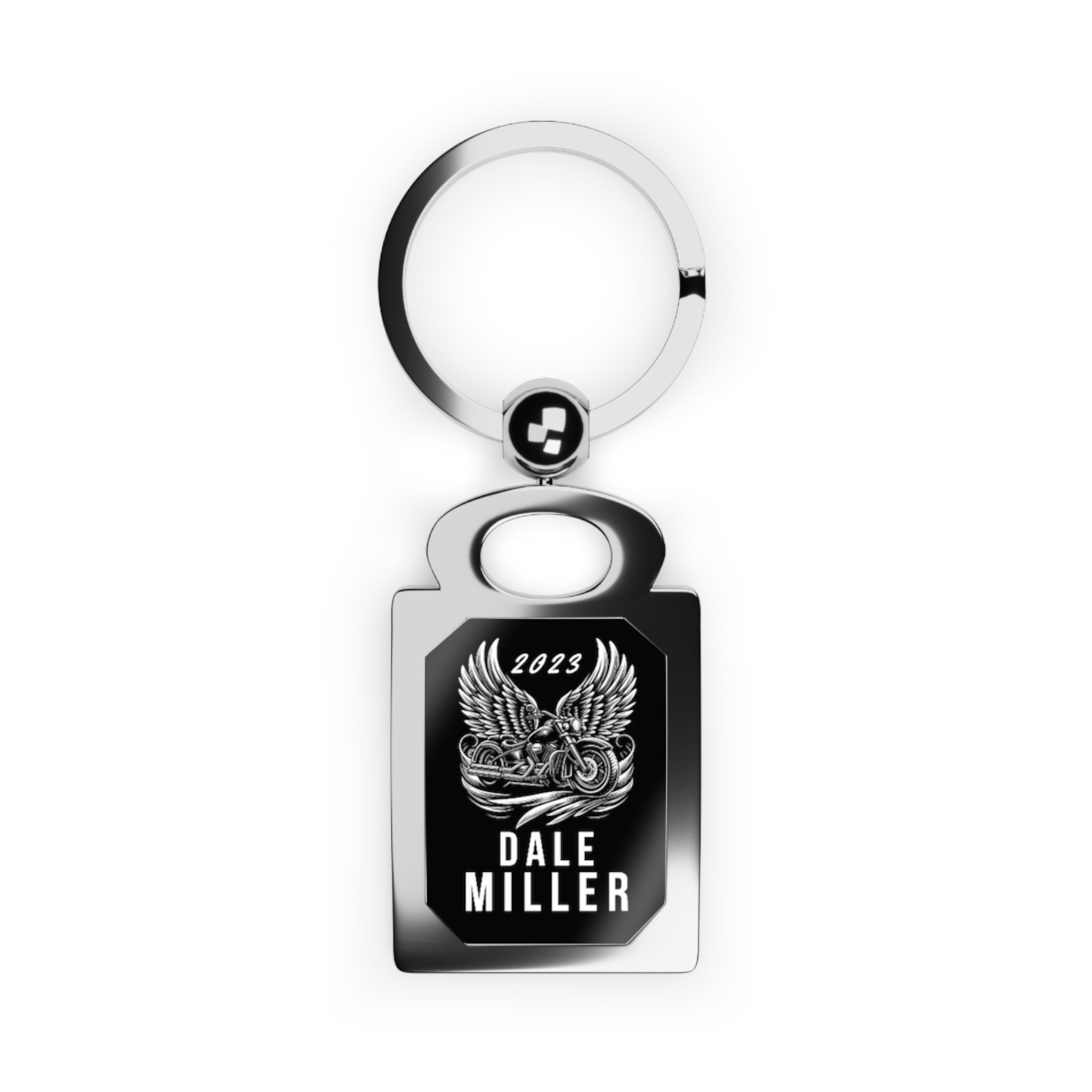 This custom-designed metal key ring captures the spirit of remembrance and solidarity, perfect for biker memorial or poker run events, with its elegant black and white graphic of a traditional cruiser motorcycle cradled by angel wings. It's customizable to include a special quote, the recipient's names, and an important date, making it a deeply personal token of memory and honor. Ideal for motorcycle clubs to resell at significant gatherings, this key ring not only serves as a poignant keepsake but also as a means to rally support and raise funds for families facing loss, strengthening the bonds within the motorcycle community.