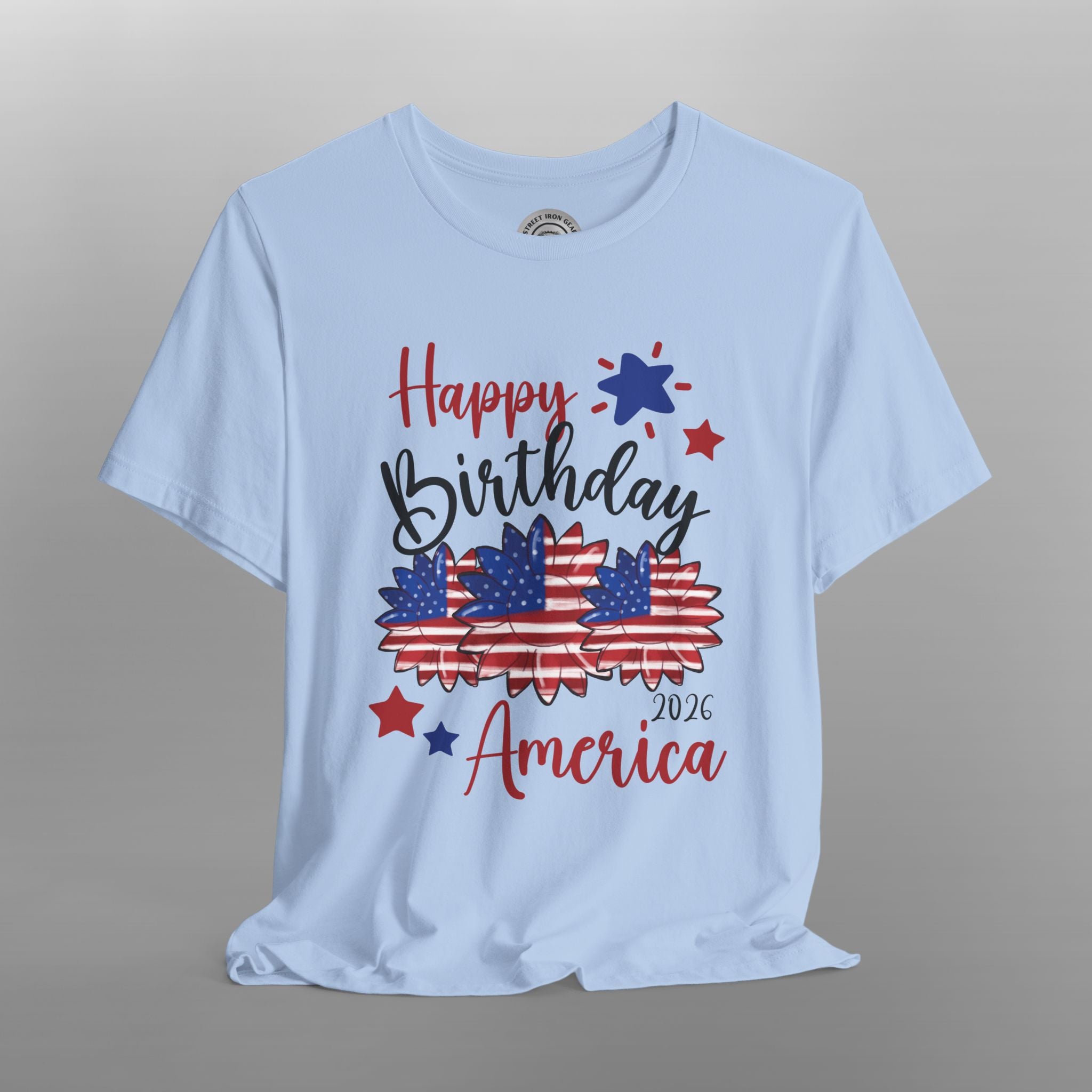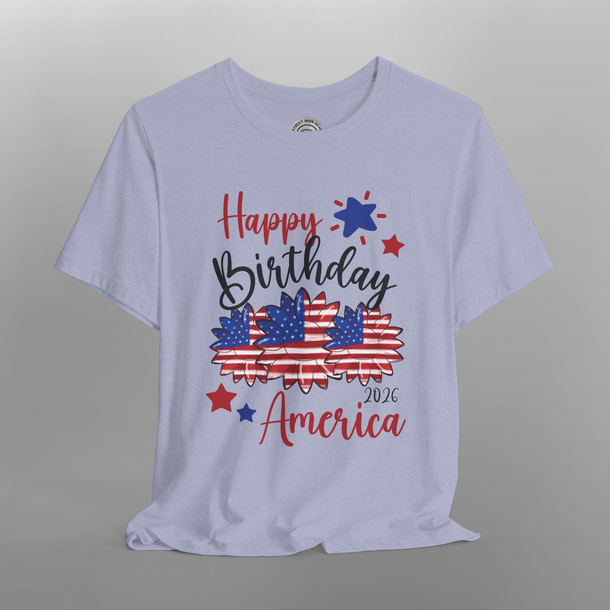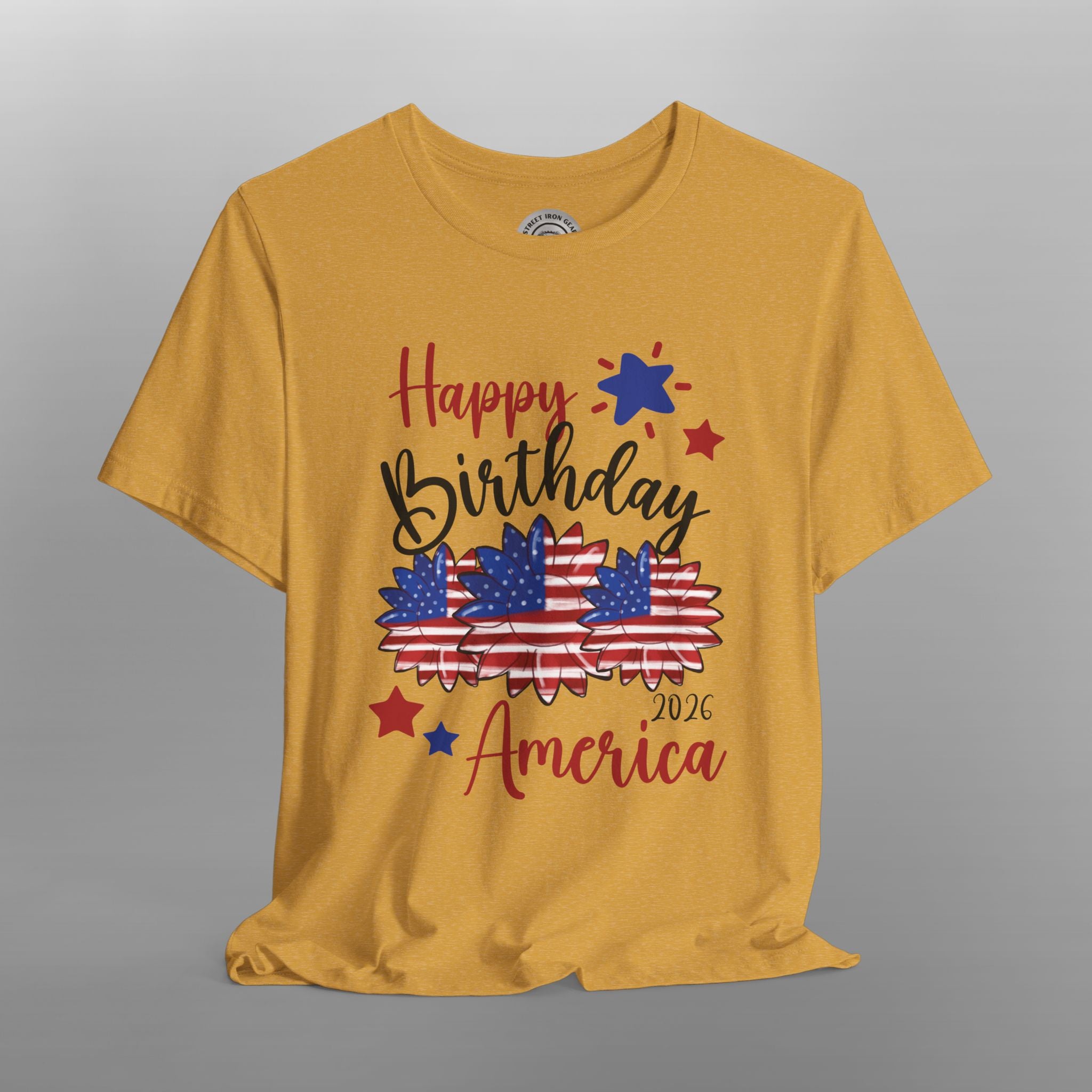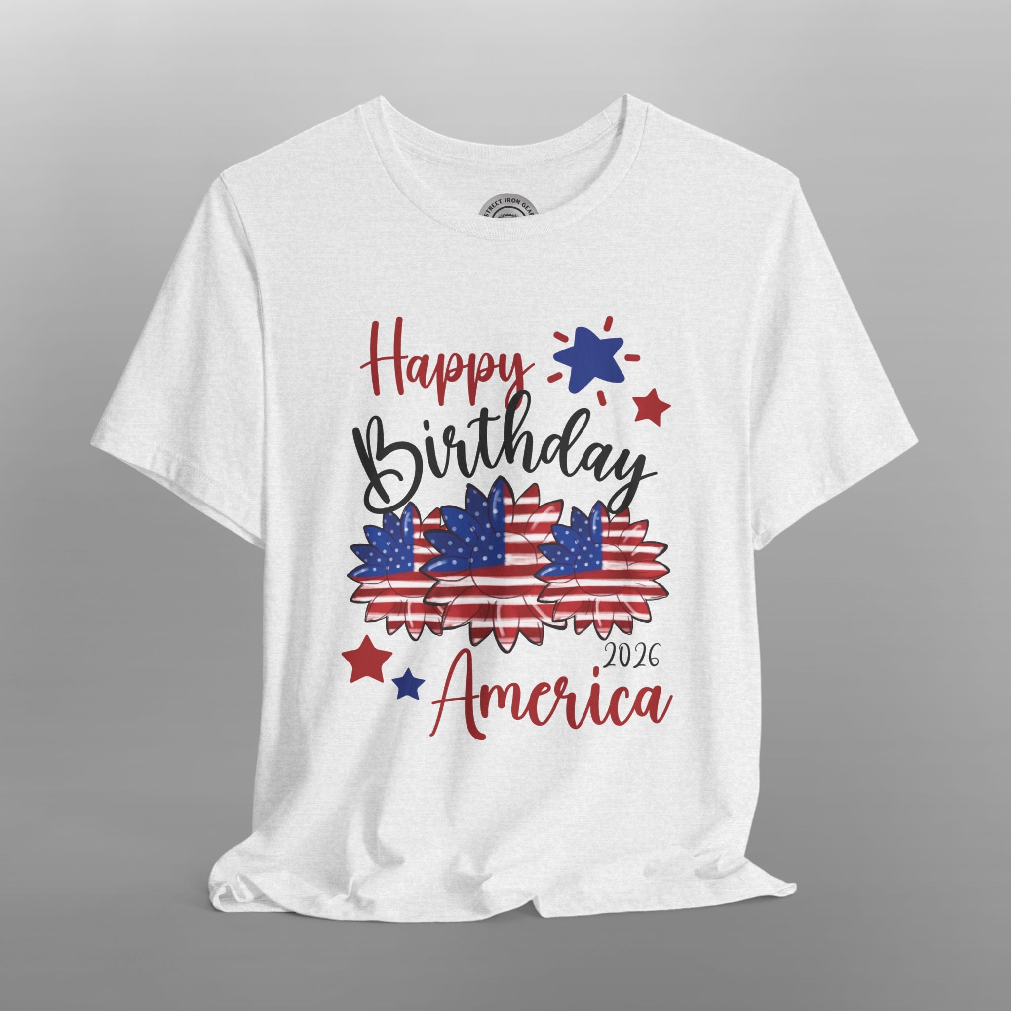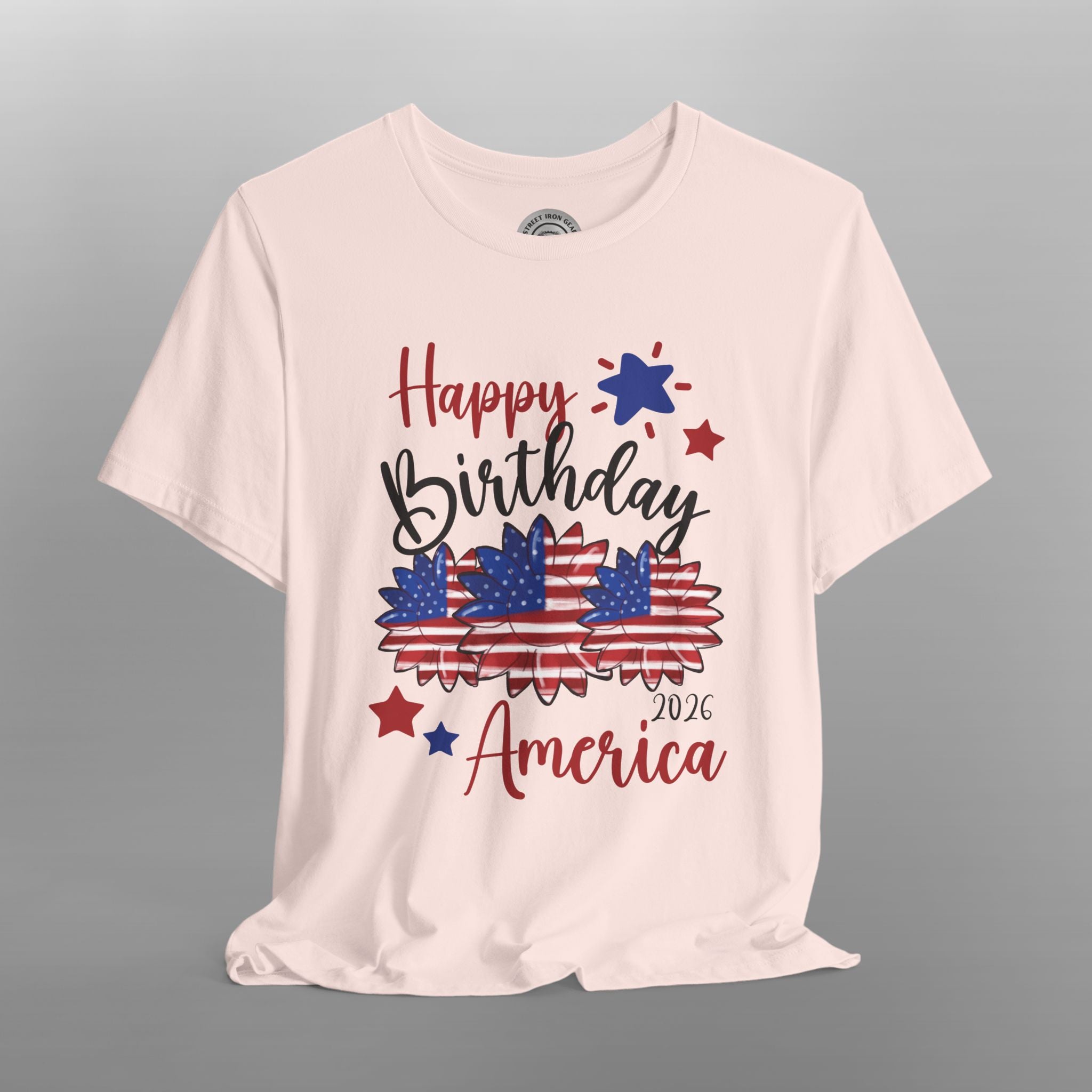 Celebrate a quarter-millennium of freedom in style with this charming and unique ladies' patriotic t-shirt! This exclusive design is the perfect way for any woman to honor America's 250th anniversary in a fun, bohemian way. The tee features a beautiful floral arrangement with a stars and stripes pattern at its core, combining a soft, feminine aesthetic with strong patriotic pride. The shirt reads "Happy Birthday America" and highlights the year 2026, making it a perfect keepsake to celebrate this historic milestone. Made from a soft, high-quality fabric, this tee is ideal for Fourth of July parties, summer festivals, or as a thoughtful patriotic gift for her. Its unique design makes a beautiful statement of national pride for any proud American woman.