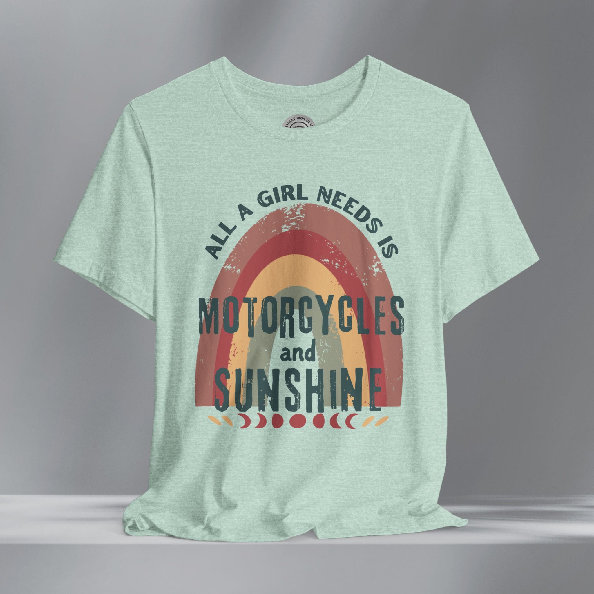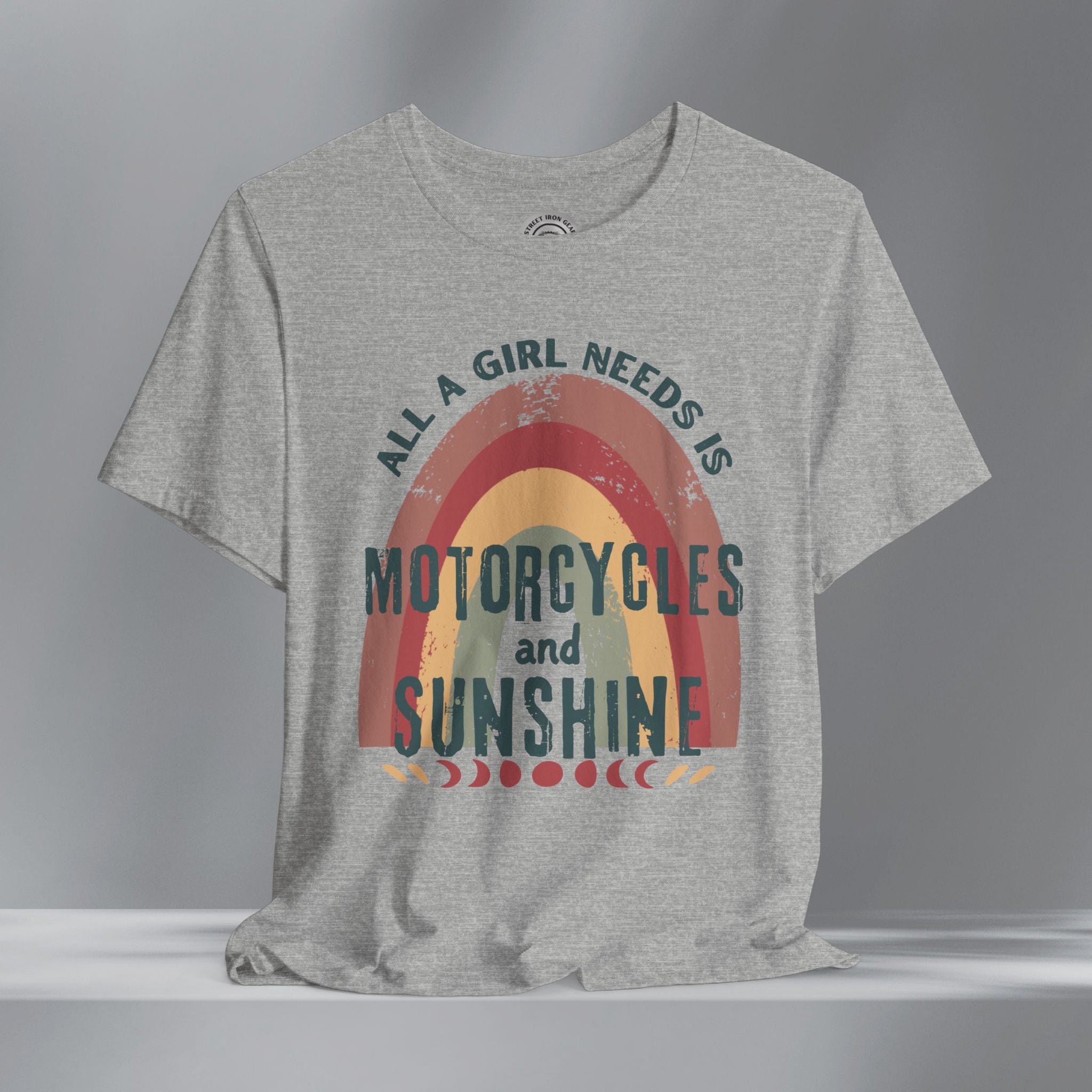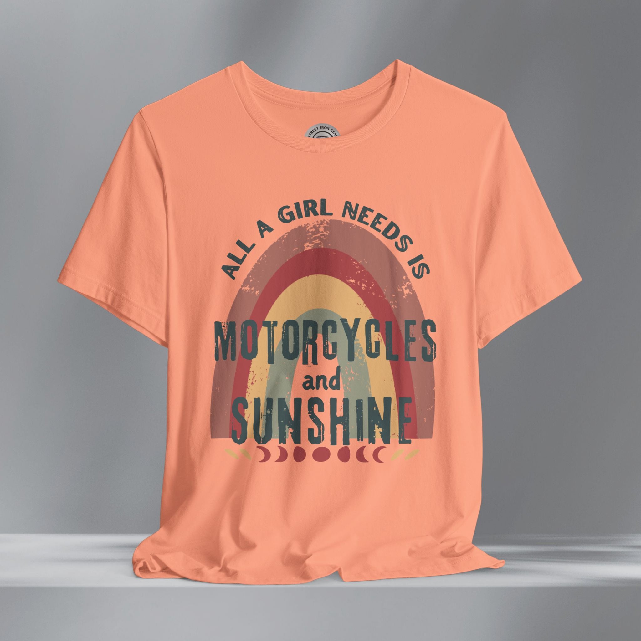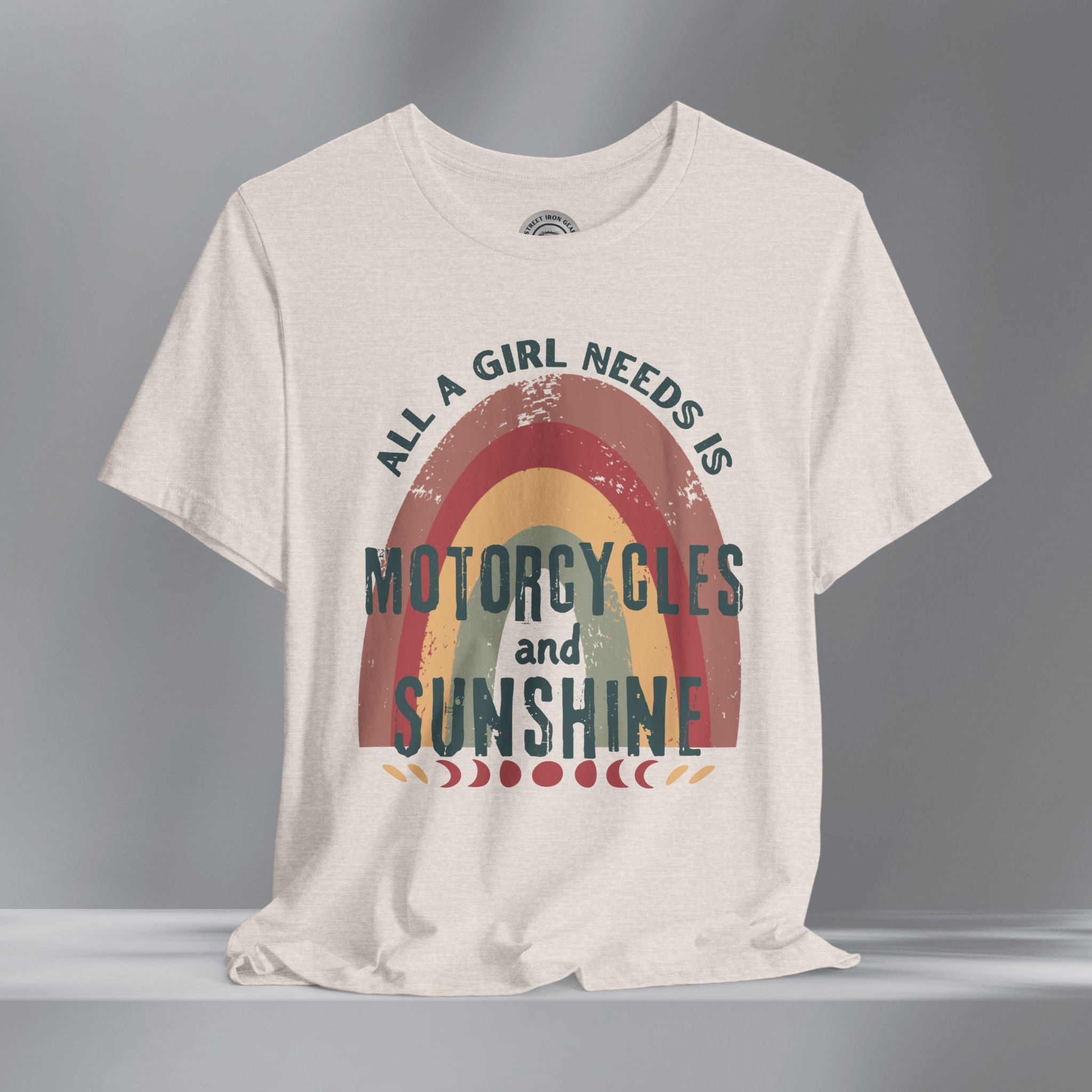 Get your retro groove on with our 'All a girl needs is Motorcycles and Sunshine' T-shirt. This women's retro bohemian shirt combines colorful, vintage fonts and positivity. Your amazing journey starts here with this fun and bold retro grunge motorcycle themed shirt.