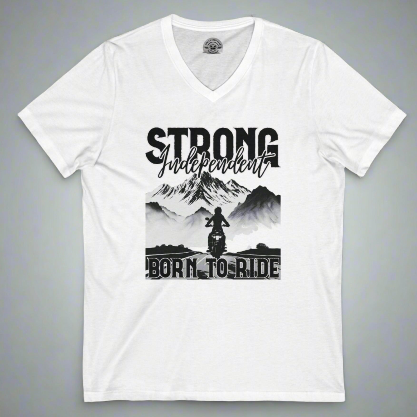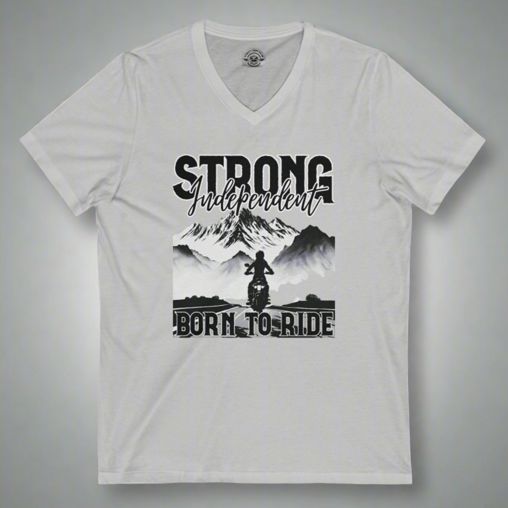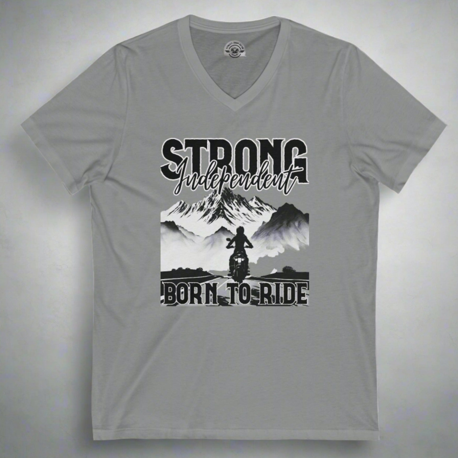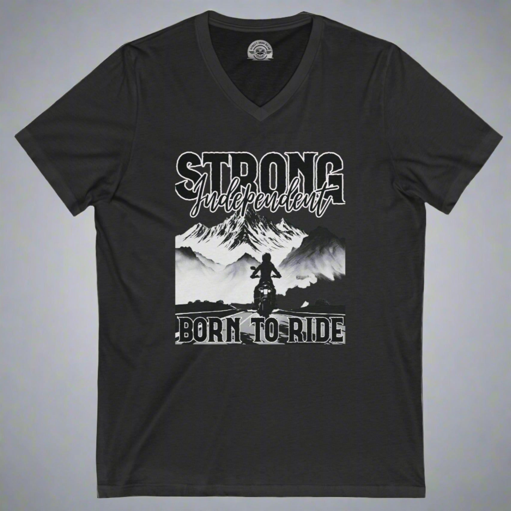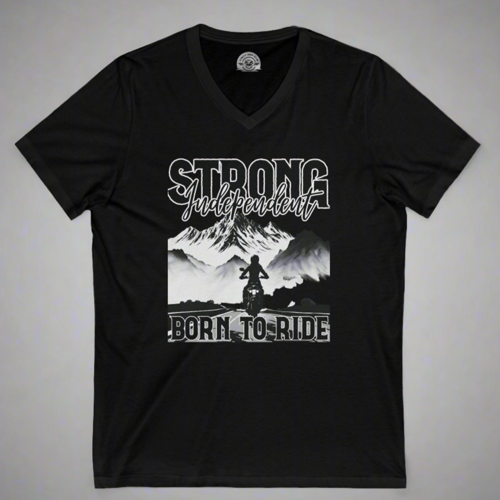 Rev up your style with our 'Strong, Independent, Born to Ride' Women's Motorcycle T-shirt. This tee features a powerful design of a woman on her motorcycle with majestic mountains in the backdrop. It's the ideal Motorcycle Gift for the strong and independent rider in your life.