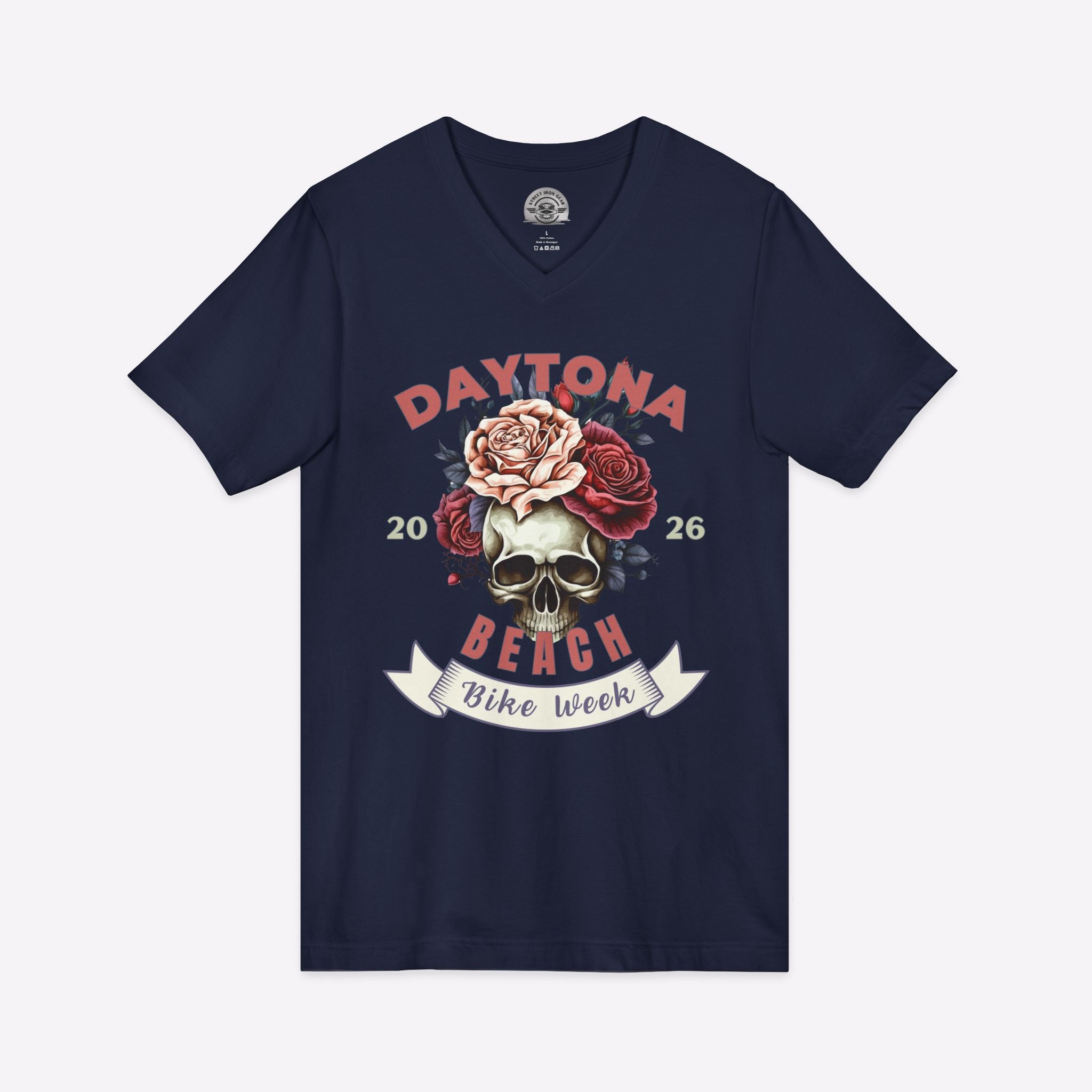 Step into the sun and surf of the legendary Florida rally with this stylish v-neck t-shirt, a perfect blend of feminine edge and classic biker spirit. This unique motorcycle-themed top features a stunning cottagecore aesthetic, showcasing a detailed skull nestled among a lush arrangement of vibrant, colorful roses. Designed to celebrate the 85th annual 2026 event in Daytona Beach, this shirt is crafted from soft, high-quality fabric that offers a flattering yet comfortable fit for lady riders and motorcycle enthusiasts alike. The unisex sizing ensures a relaxed, versatile silhouette that is ideal for staying cool while cruising the strip or enjoying the seaside festivities. Whether you are a local rider or a traveler visiting for the week, this artistic floral skull tee serves as a fantastic non-corporate souvenir for any woman who loves the open road and the iconic Florida motorcycle culture.