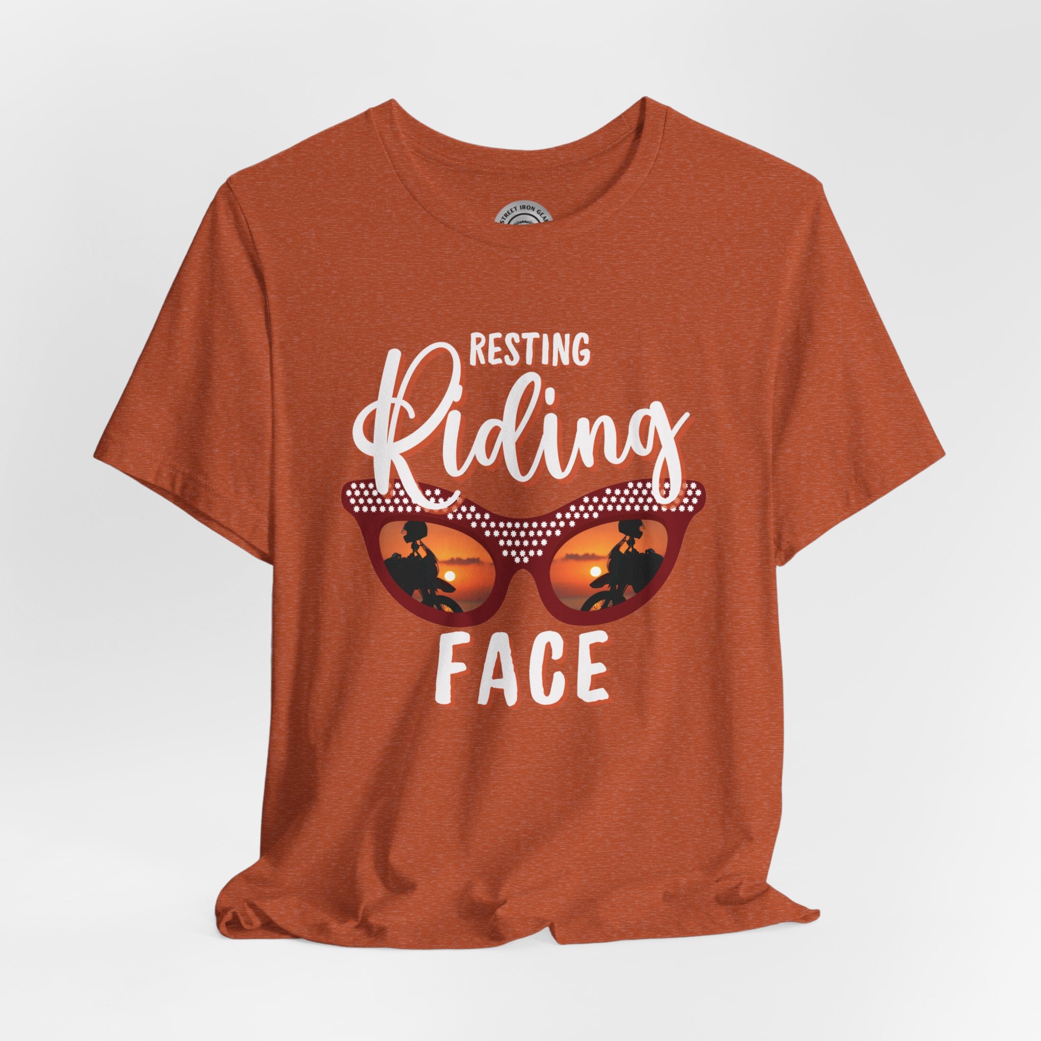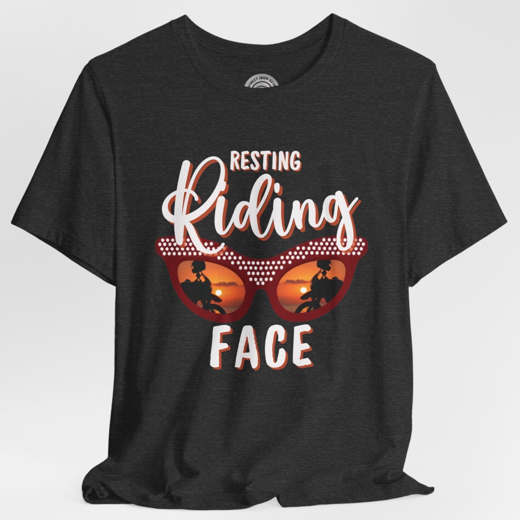 Unleash your inner rider with our 'Resting Riding Face' women's T-shirt, perfect for motorcycle enthusiasts who live for the open road. This stylish tee features a set of sunglasses with a captivating reflection of a motorcycle and a stunning sunset, embodying the ultimate freedom of riding. Made from high-quality, breathable fabric, it's the ideal apparel for both casual outings and adventurous road trips, ensuring you ride in comfort and style.