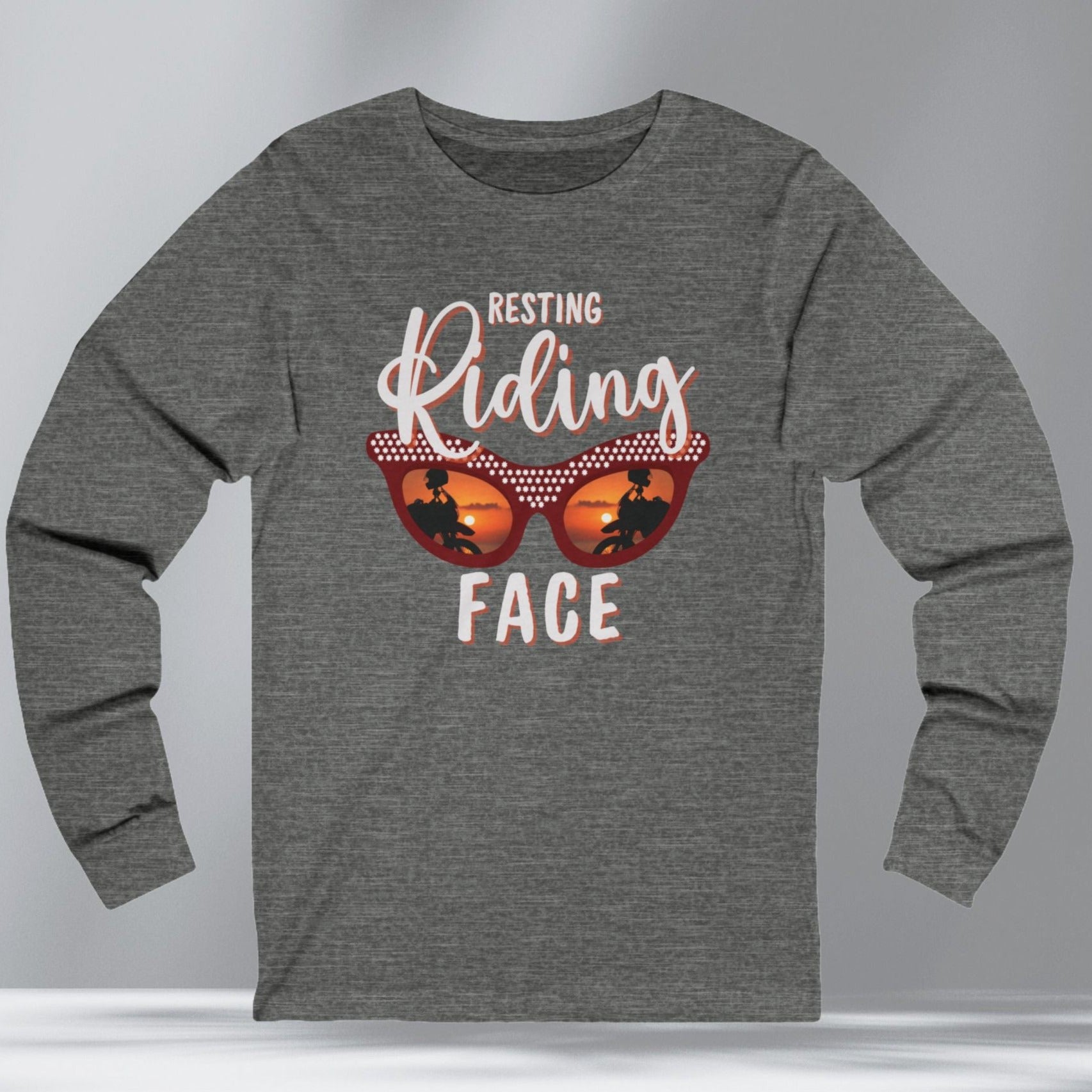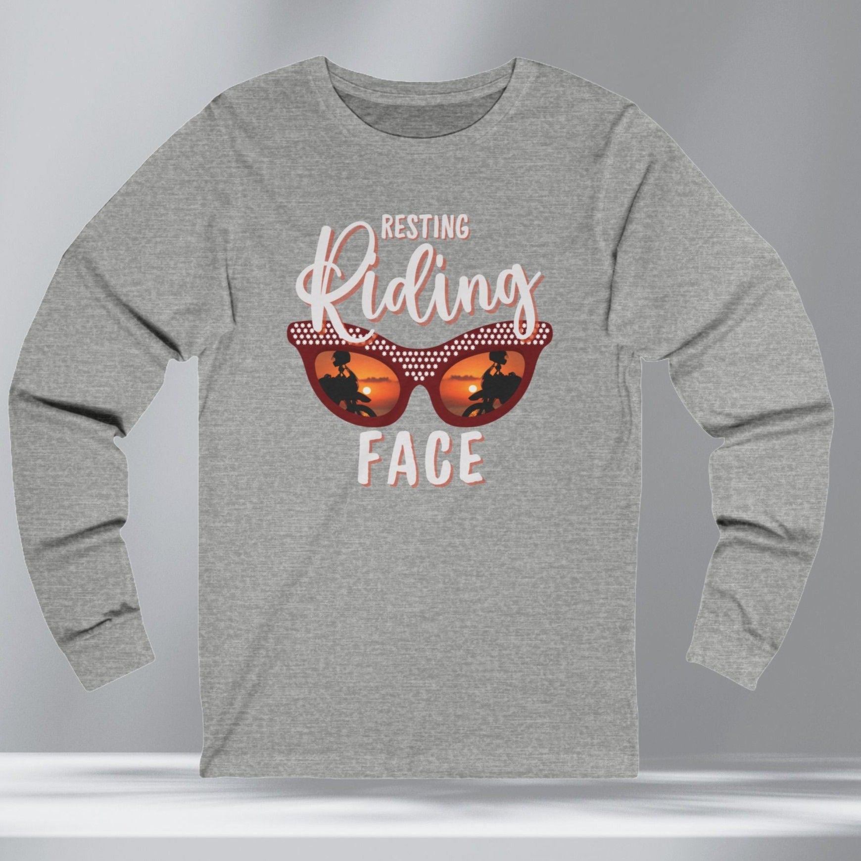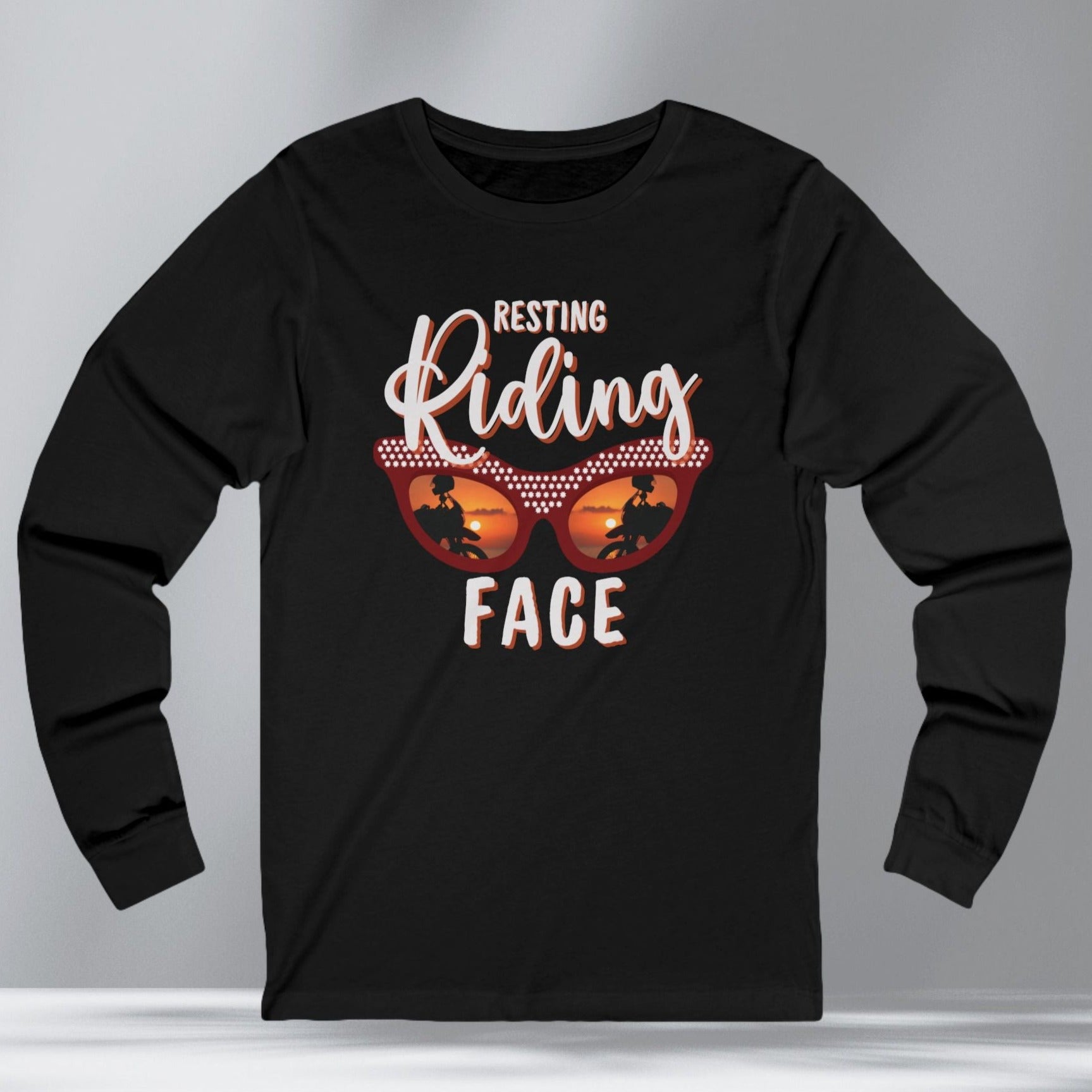 Unleash your inner rider with our 'Resting Riding Face' women's long sleeved T-shirt, perfect for motorcycle enthusiasts who live for the open road. This stylish tee features a set of sunglasses with a captivating reflection of a motorcycle and a stunning sunset, embodying the ultimate freedom of riding. Made from high-quality, breathable fabric, it's the ideal apparel for both casual outings and adventurous road trips, ensuring you ride in comfort and style.