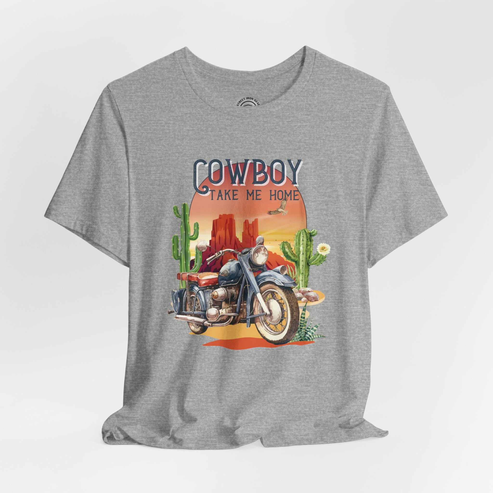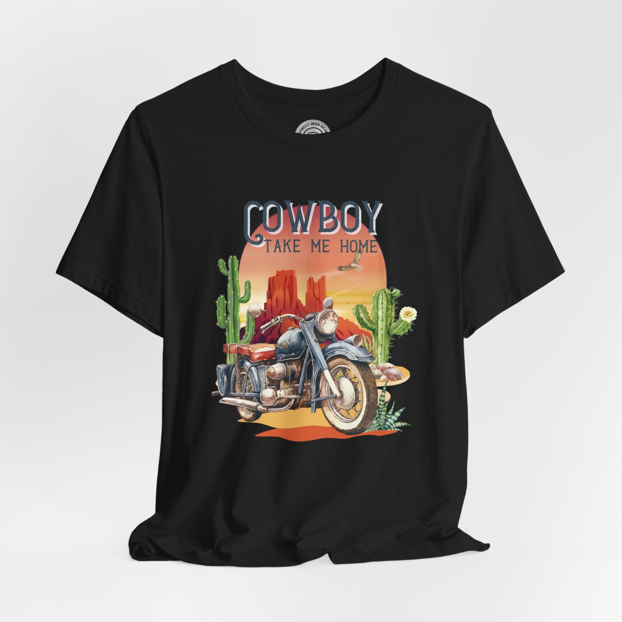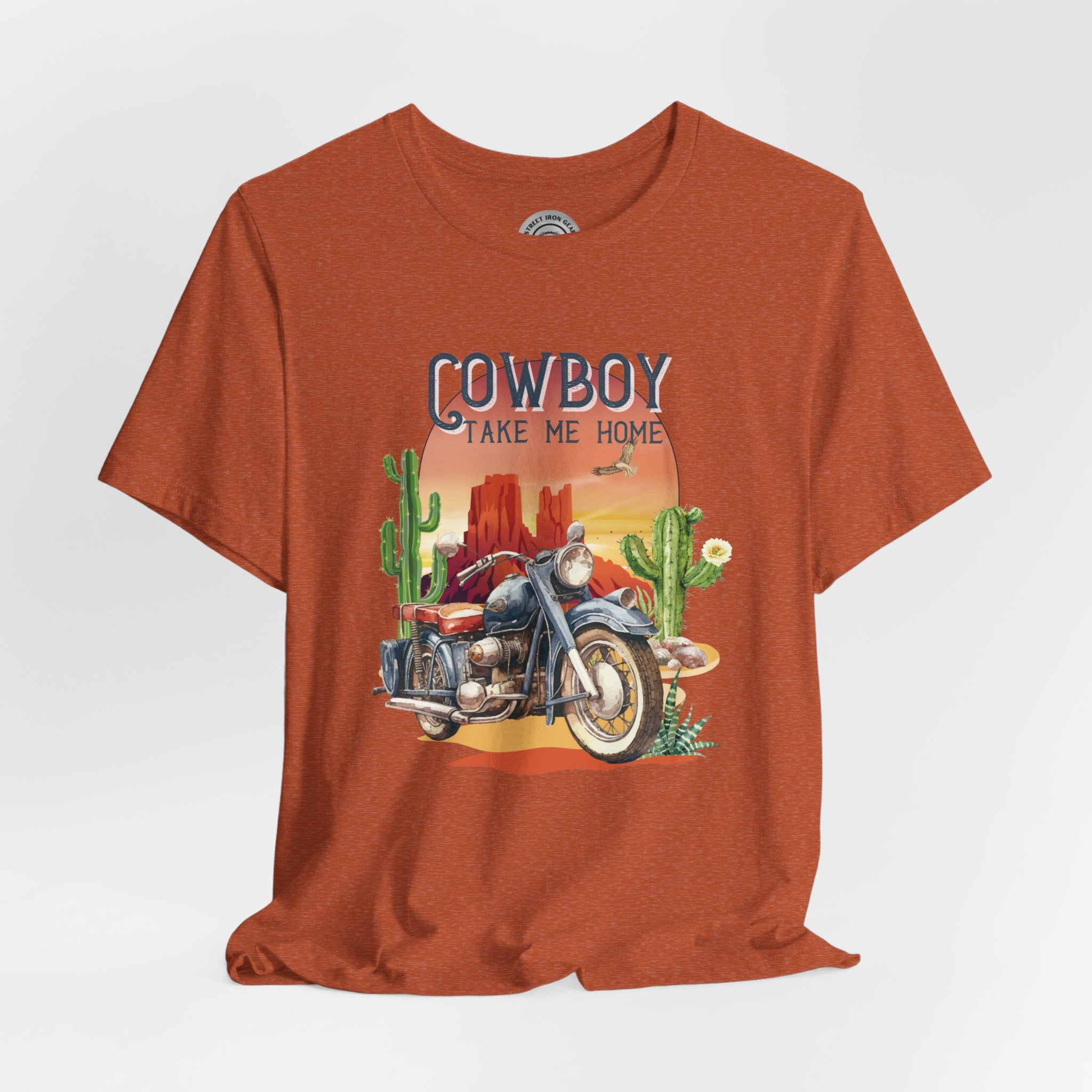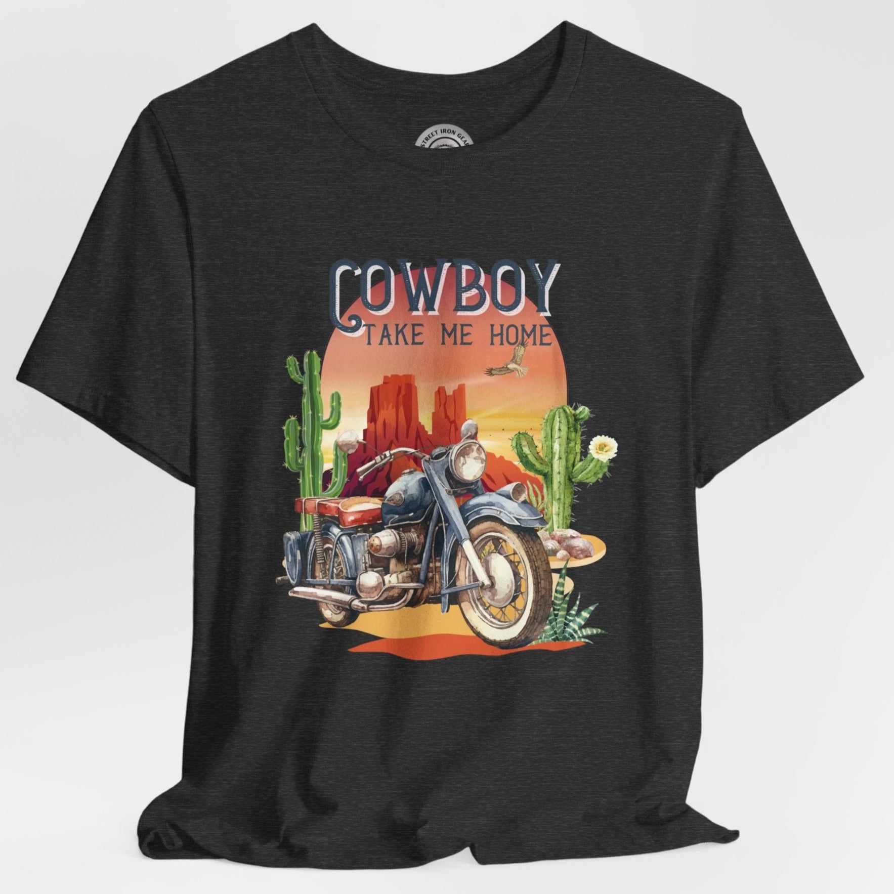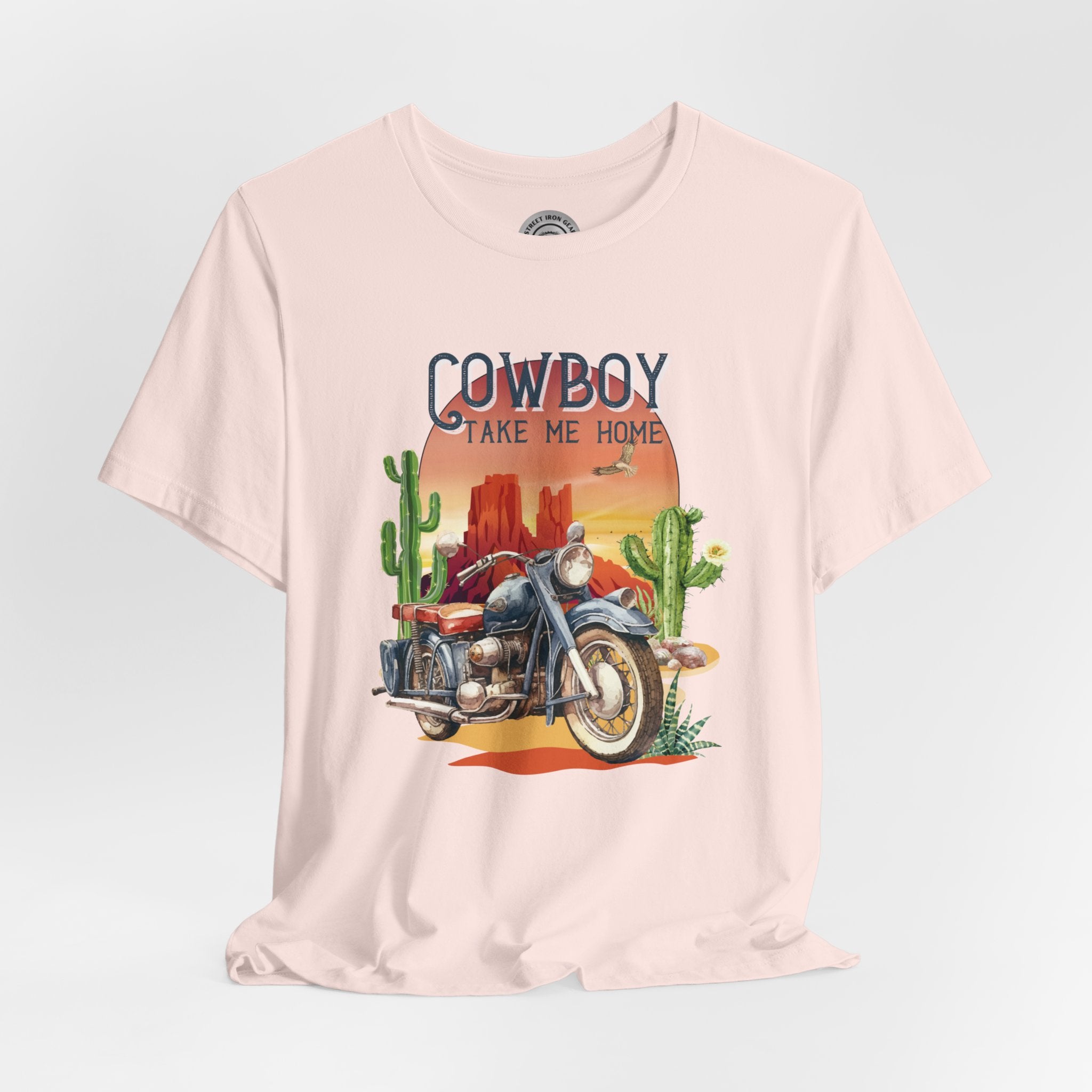 Ride in style with our Boho Motorcycle Women's T-shirt! Featuring a vintage motorcycle set in a boho western scene with the text "Cowboy Take Me Home," this tee blends adventure with a touch of whimsy. Perfect for free spirits and motorcycle enthusiasts, it's made from soft, high-quality fabric for all-day comfort and style.